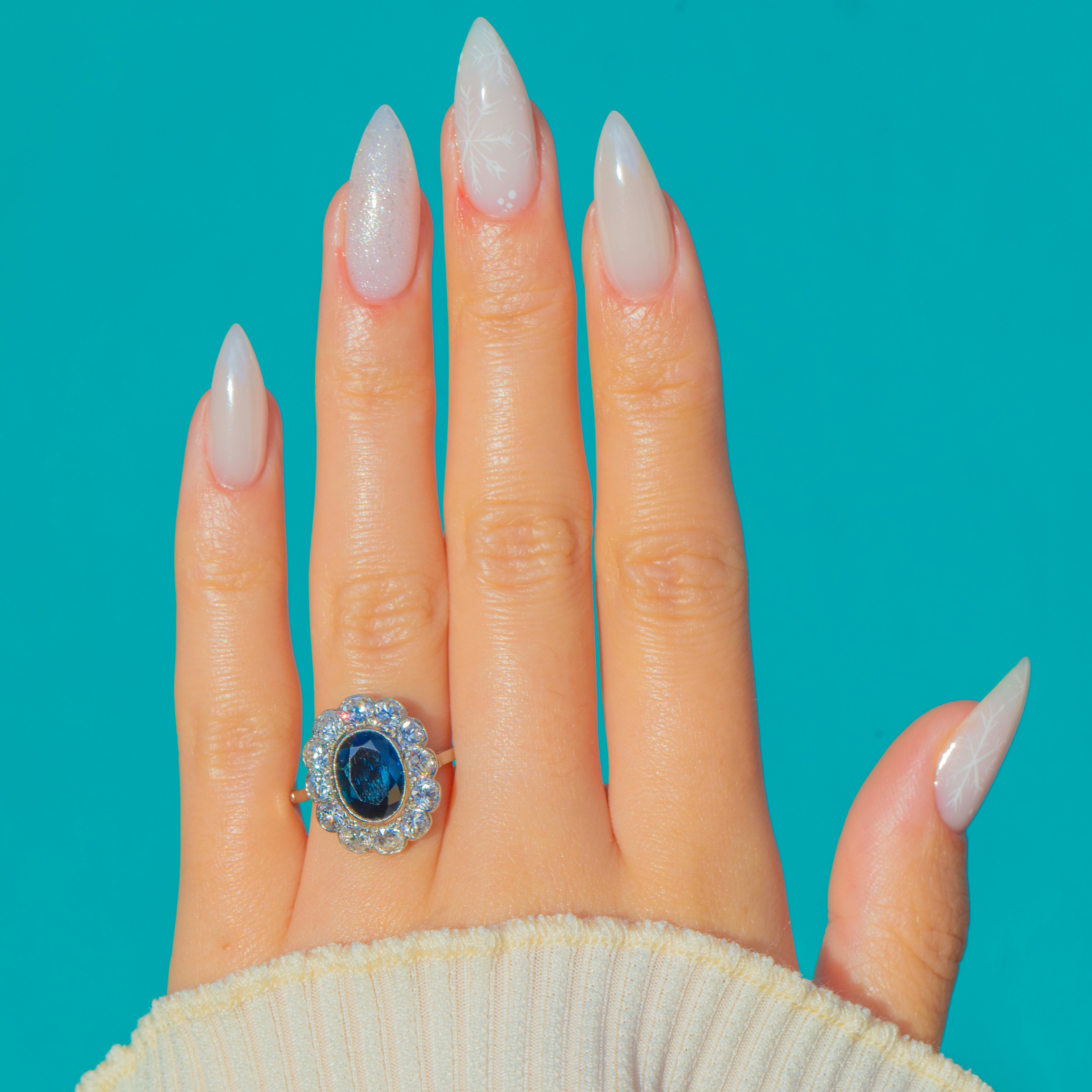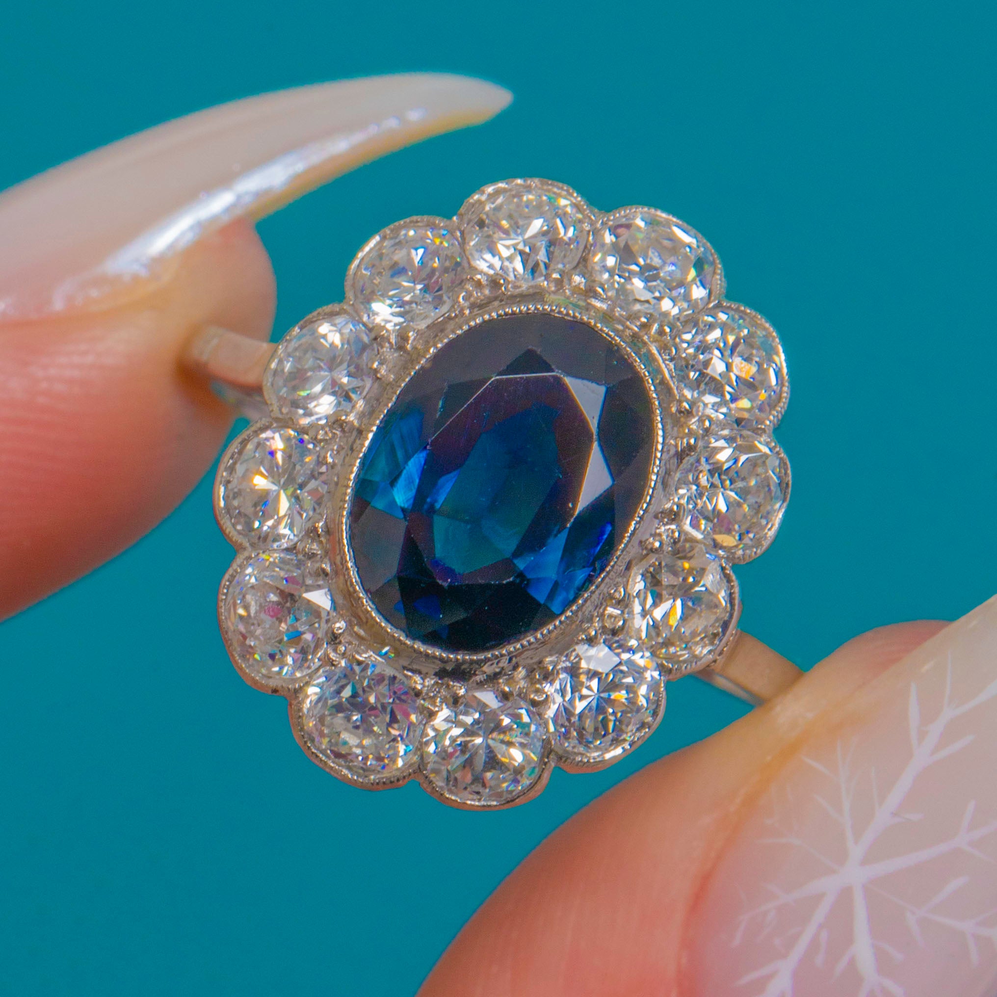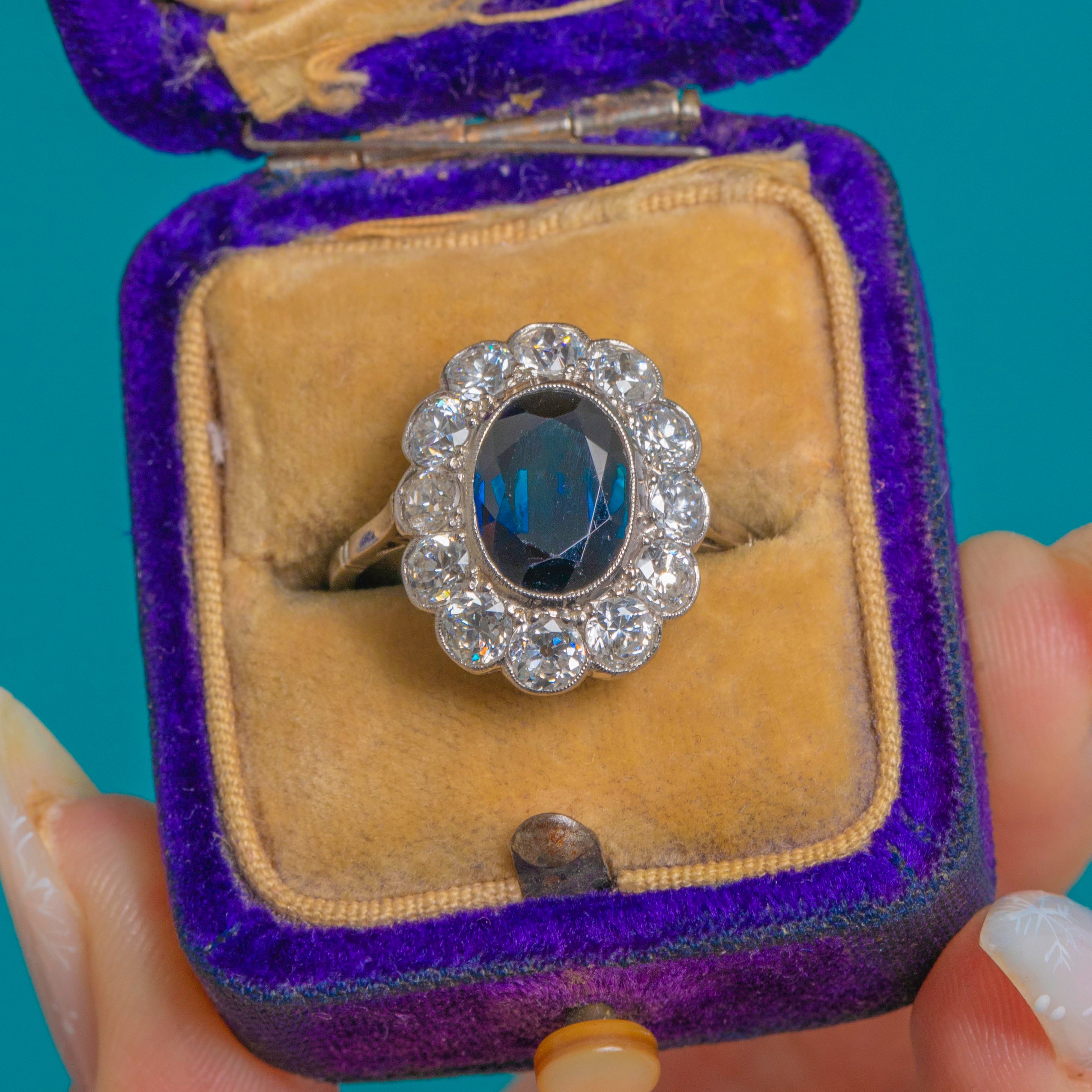 The chunky, romantic facets of the Old European Cuts sparkle beautifully against the cool White Gold, amplifying the deep blue of the centre stone with a luminous corona of fire. Elegant and refined yet impressively impactful, this is a timeless rosette design crafted with the finesse and poise of the Edwardian era.