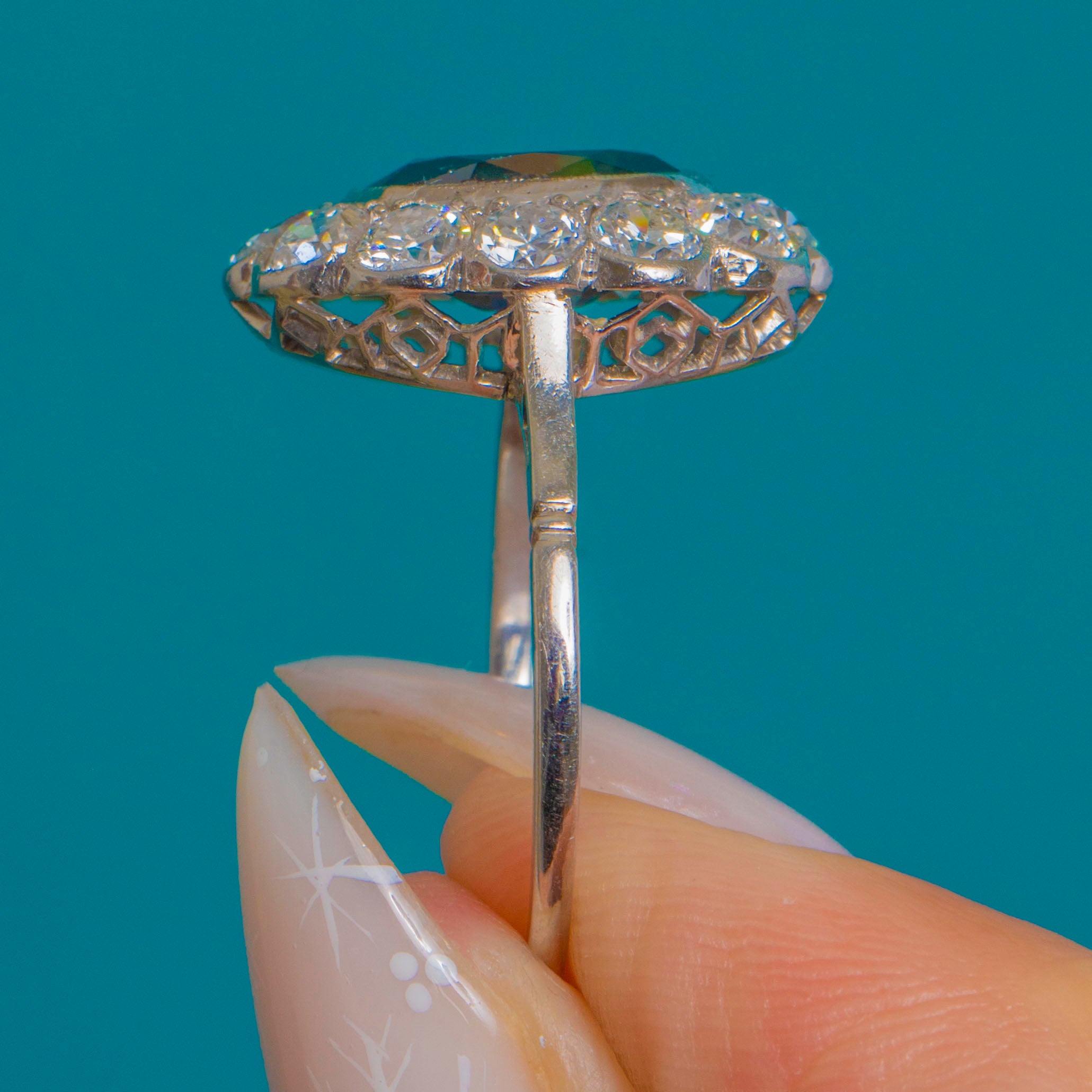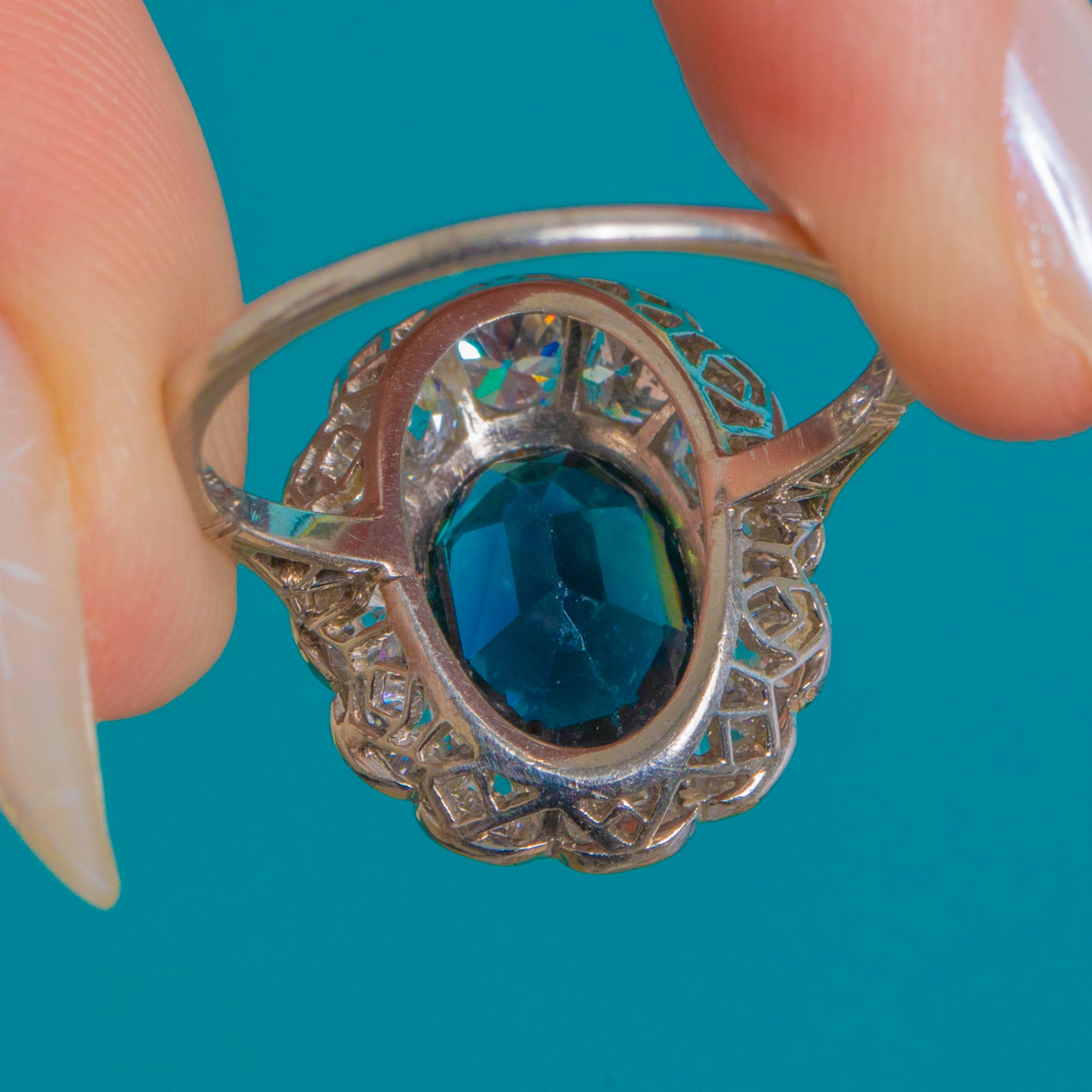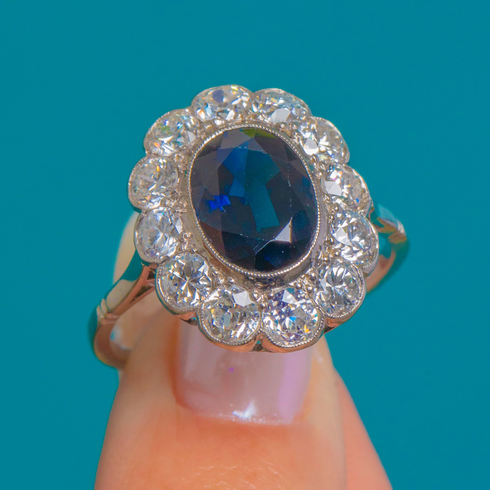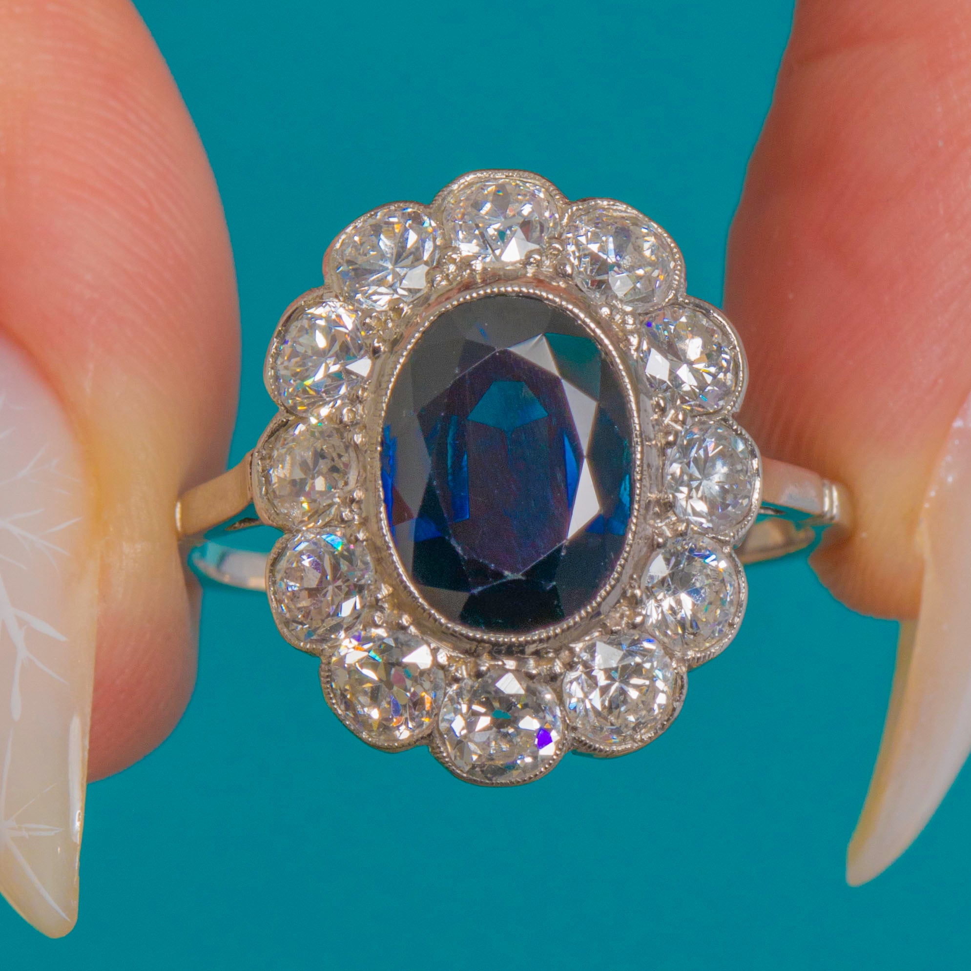 The chunky, romantic facets of the Old European Cuts sparkle beautifully against the cool White Gold, amplifying the deep blue of the centre stone with a luminous corona of fire. Elegant and refined yet impressively impactful, this is a timeless rosette design crafted with the finesse and poise of the Edwardian era.