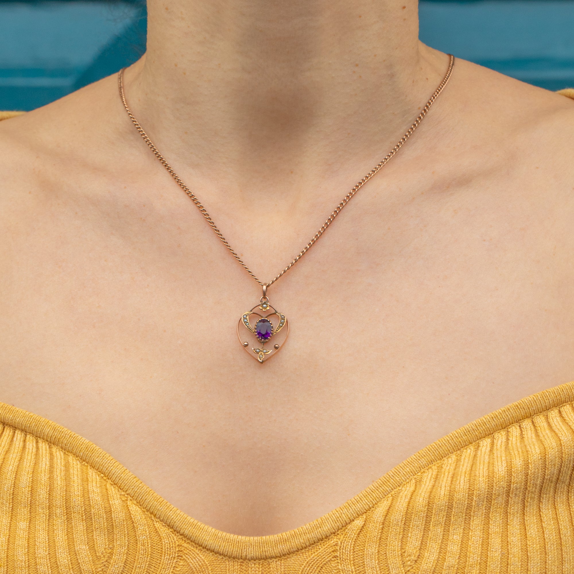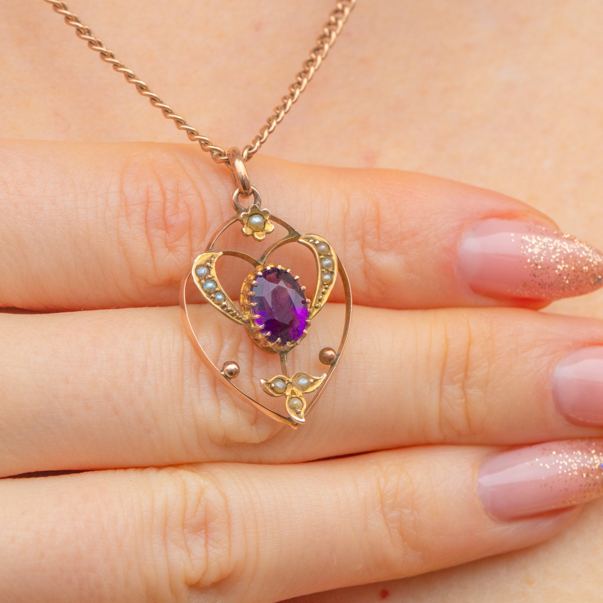 Edwardian 9ct Gold Amethyst Pearl Heart Pendant, 0.65ct Item added