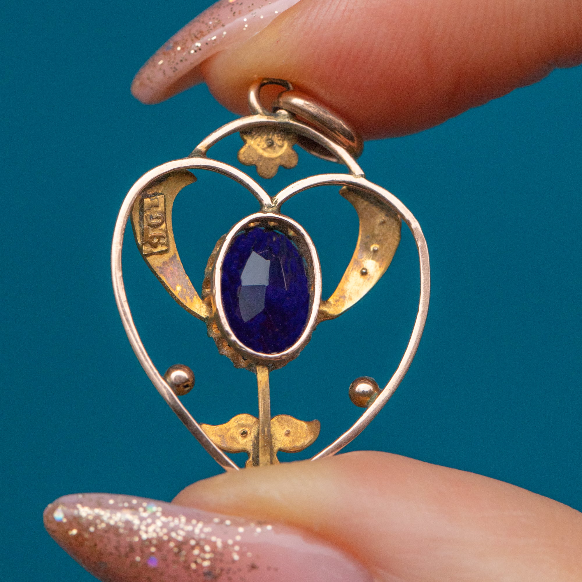 Brimming with Edwardian charm, this antique 9ct Gold Amethyst Pearl heart pendant is an incredible treasure. Her central faceted Amethyst boasts a rich violet gleam that will perfectly catch the sunlight and is perfectly complimented by the warmth of her 9ct Gold.