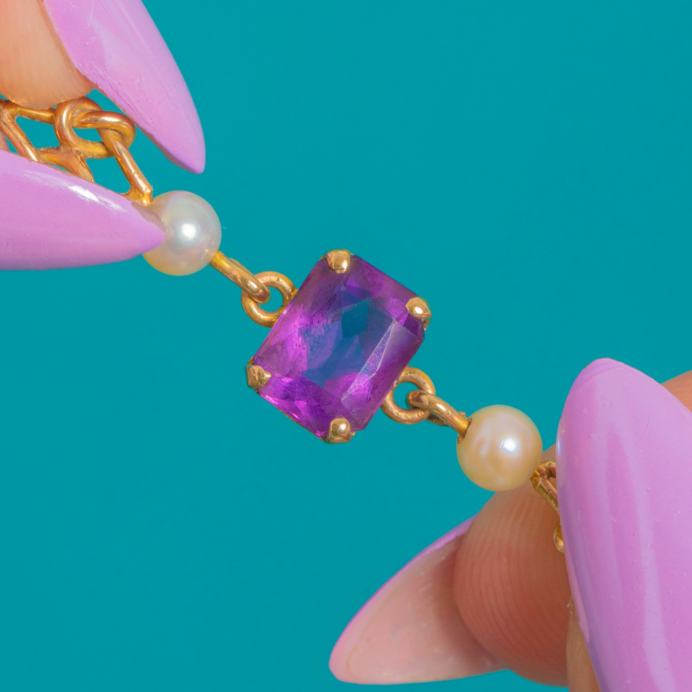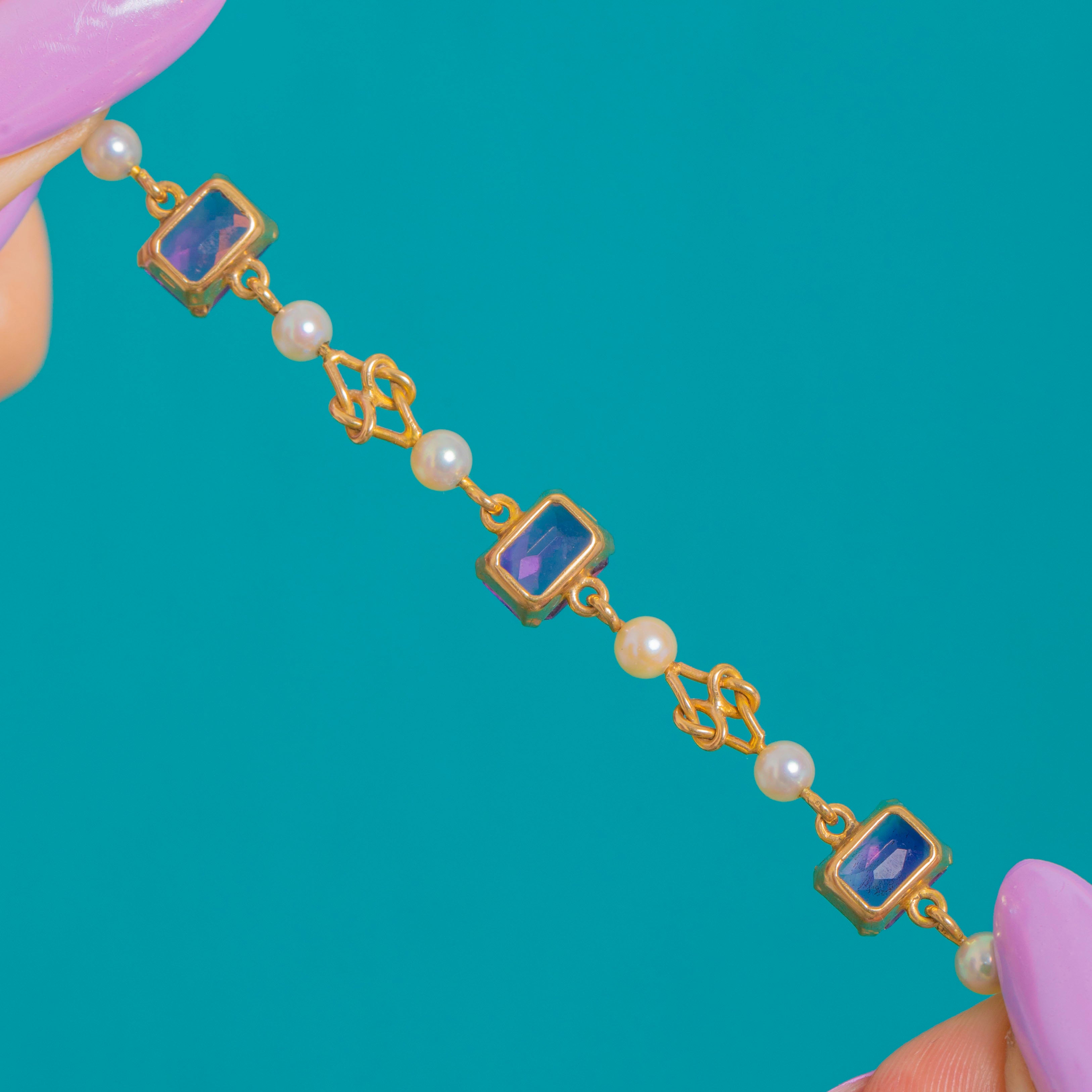 EXCELLENT: Amethysts are bright and well-matched with crisp facets and no noticeable chips or abrasions; Pearls display consistent lustre. The 9ct Gold links and settings are secure with minimal light surface wear and a gentle patina commensurate with age.