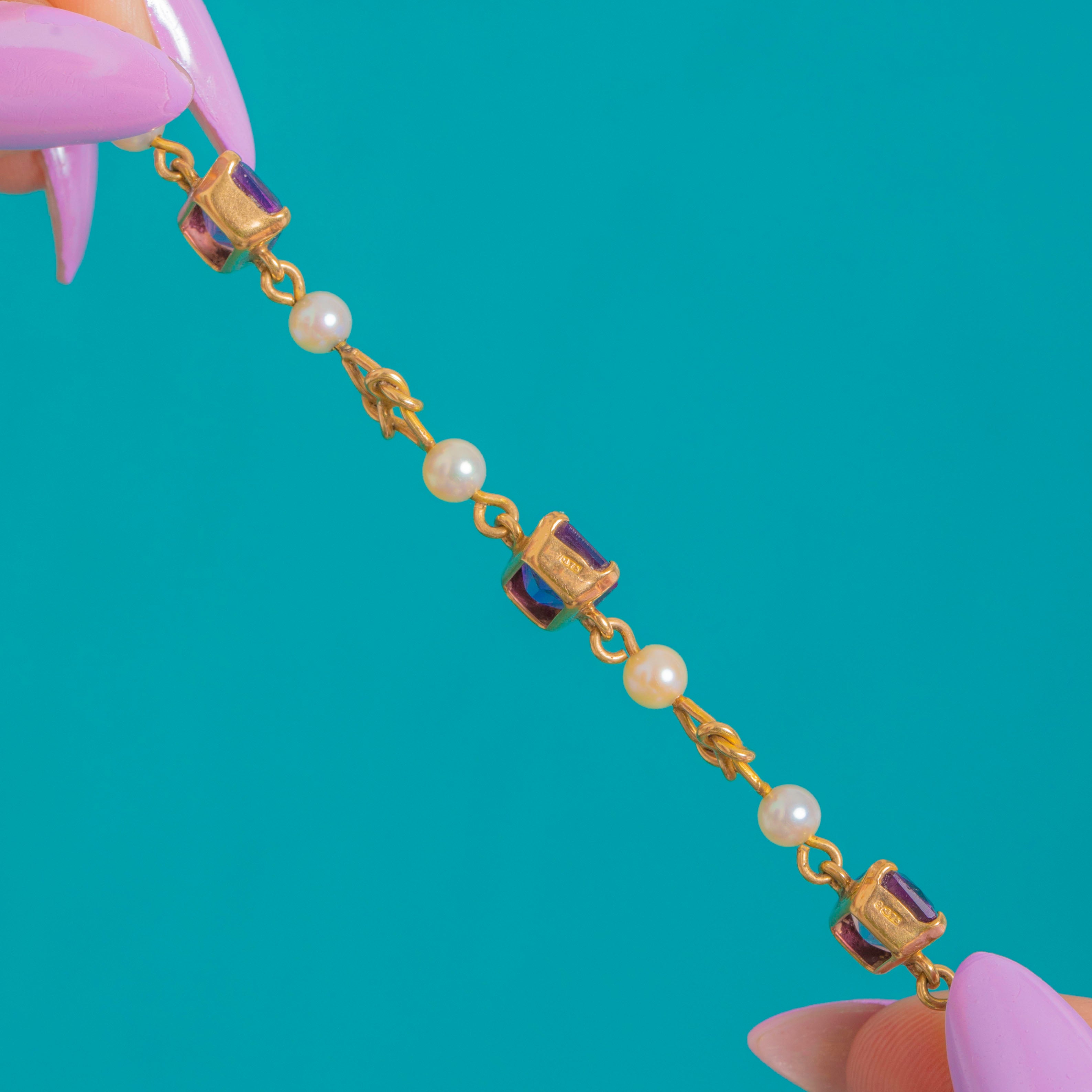Edwardian 9ct Gold Amethyst Pearl Station Bracelet