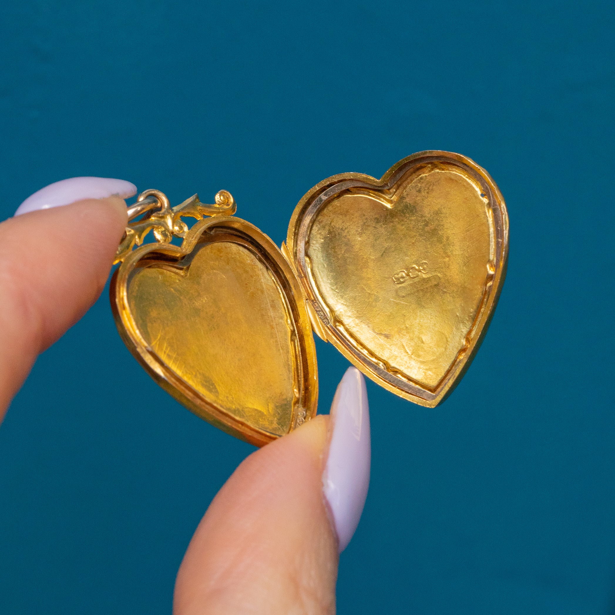 How delicious is this Edwardian 9ct Gold engraved heart locket! Engraved acanthus leaves adorn her front and her back boasts ivy leaves, both with a history of romantic symbolism. Crafted from rich 9ct Gold, the light bounces off of her, with a spectrum of sunny hues gleaming from front to back.