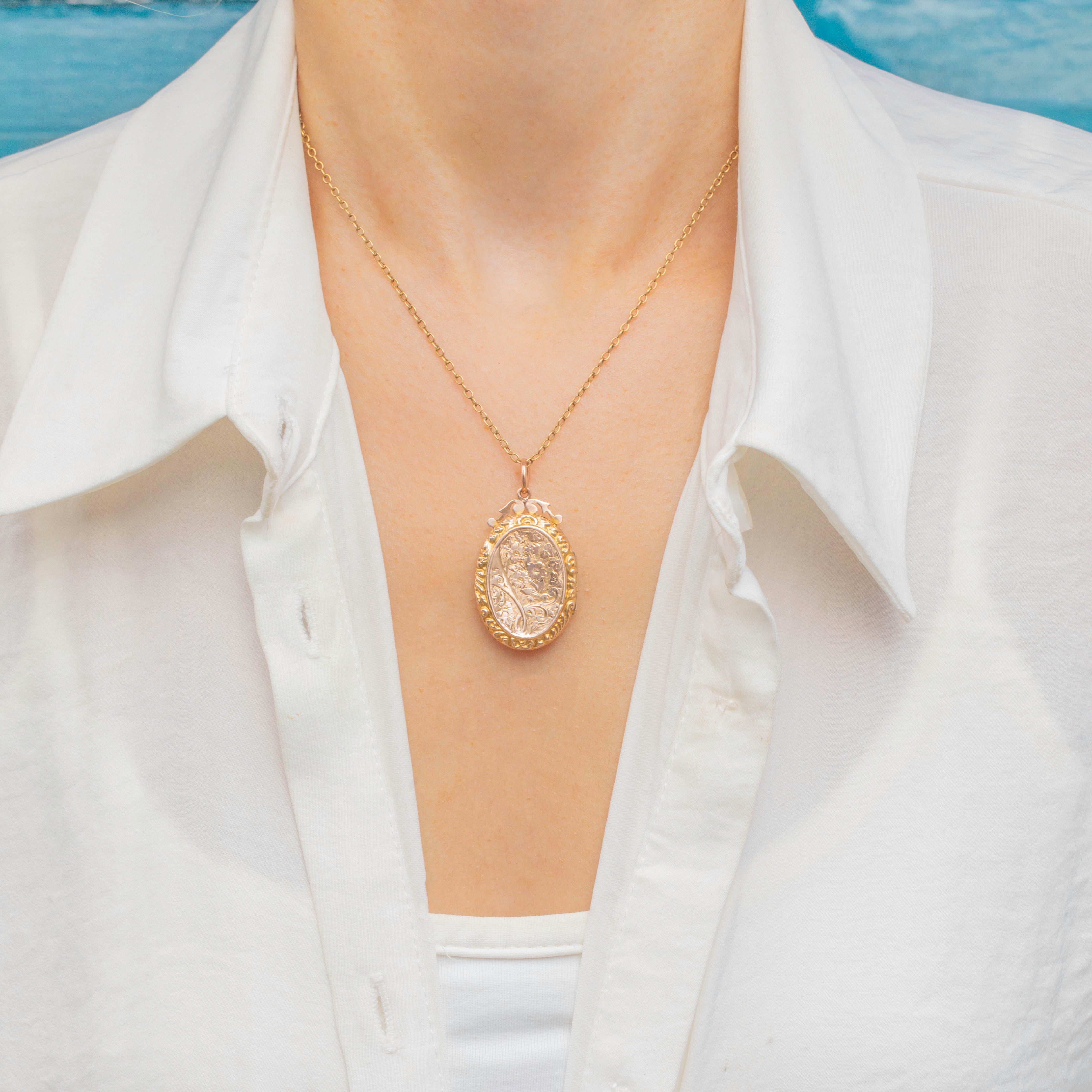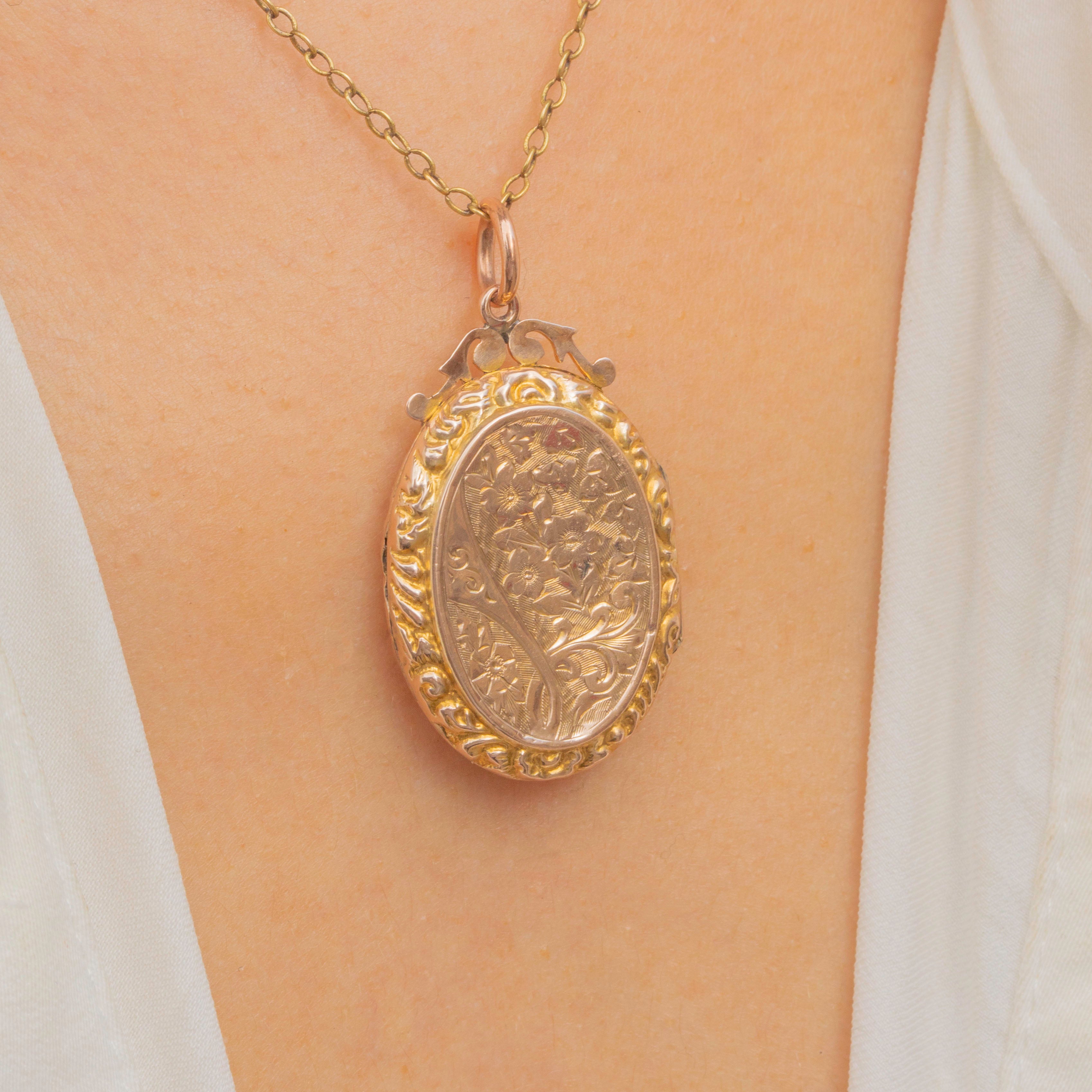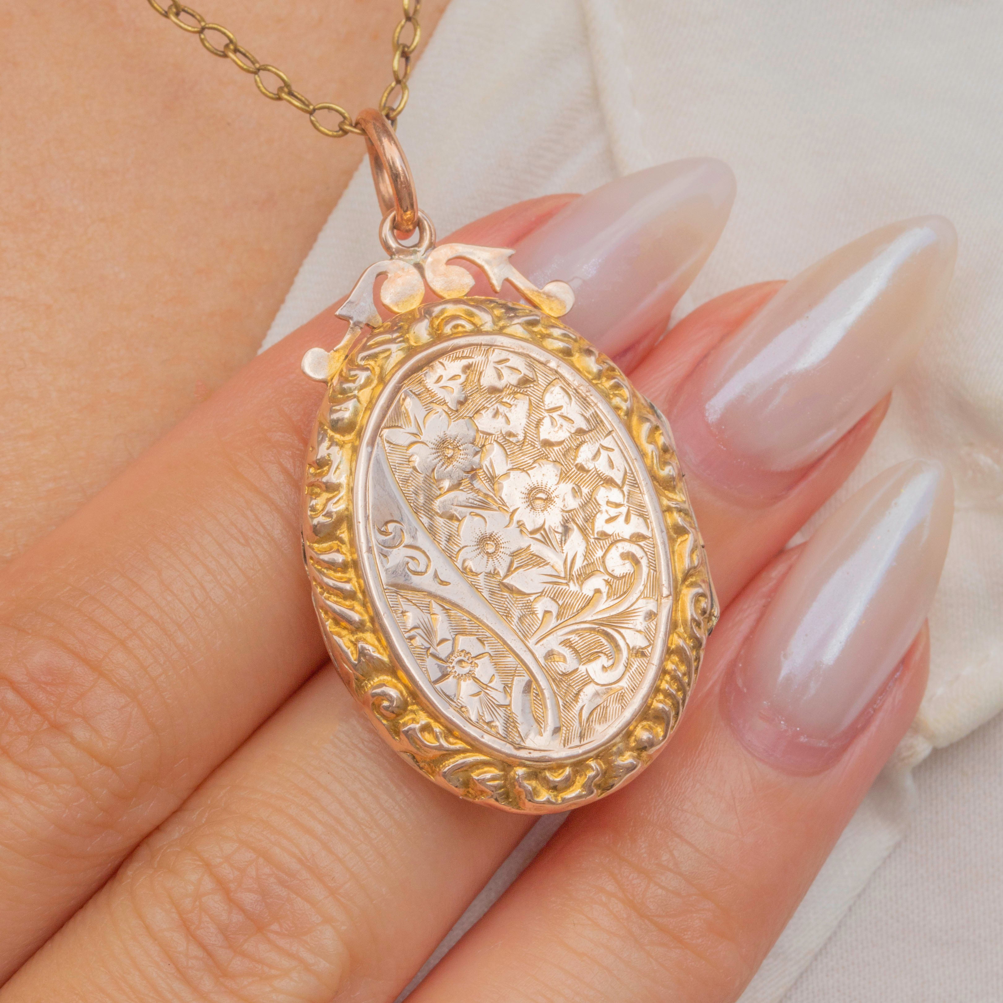 A timeless antique Gold locket for your collection, displaying gorgeous engraved floral details and an ornate repoussé border on both sides!