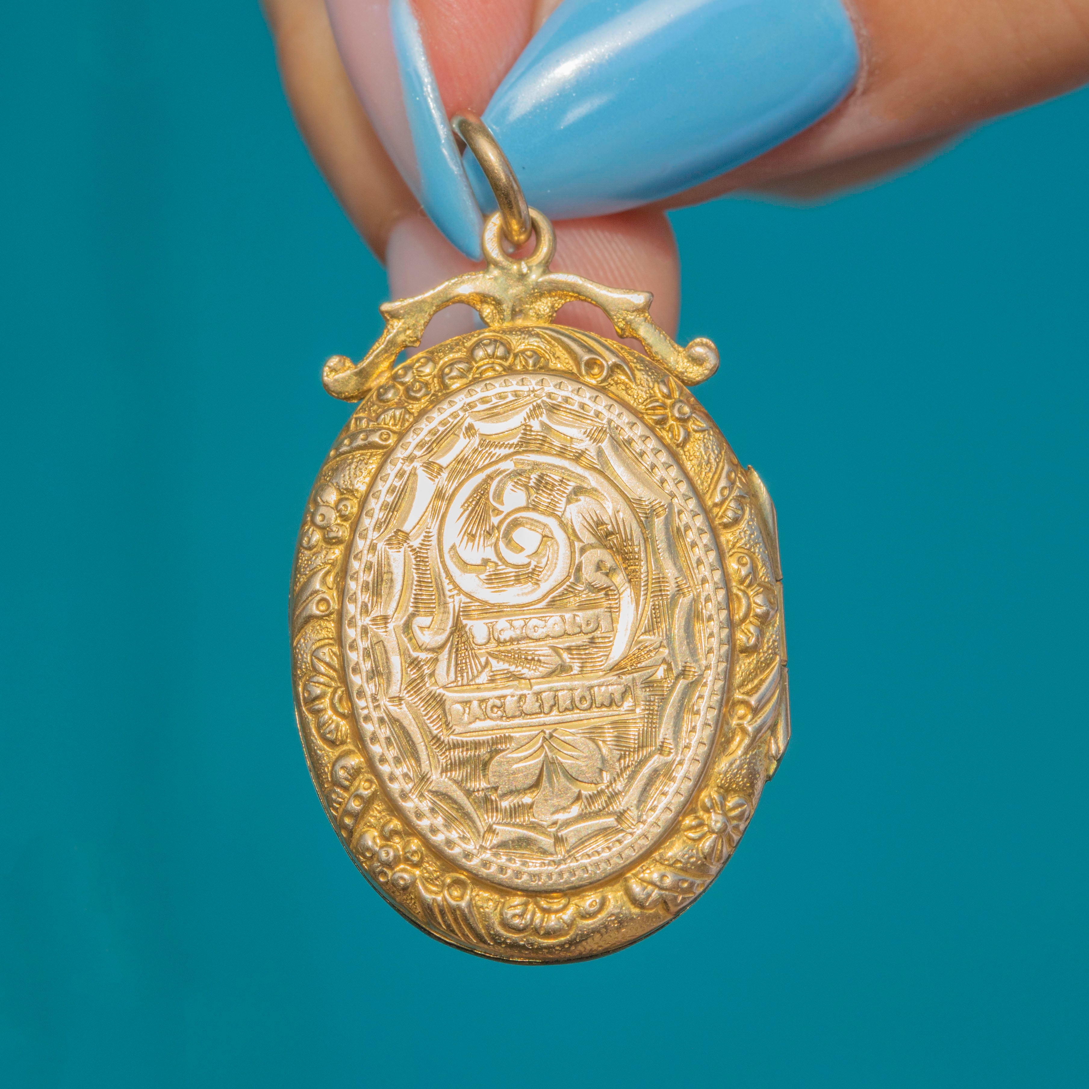 VERY GOOD-EXCELLENT: The Gold doors are bright and glossy, and the engravings have remained crisp. There is some slight wear to the inside of the locket, commensurate with age. With a secure jump ring, this antique locket can be worn with utmost confidence.