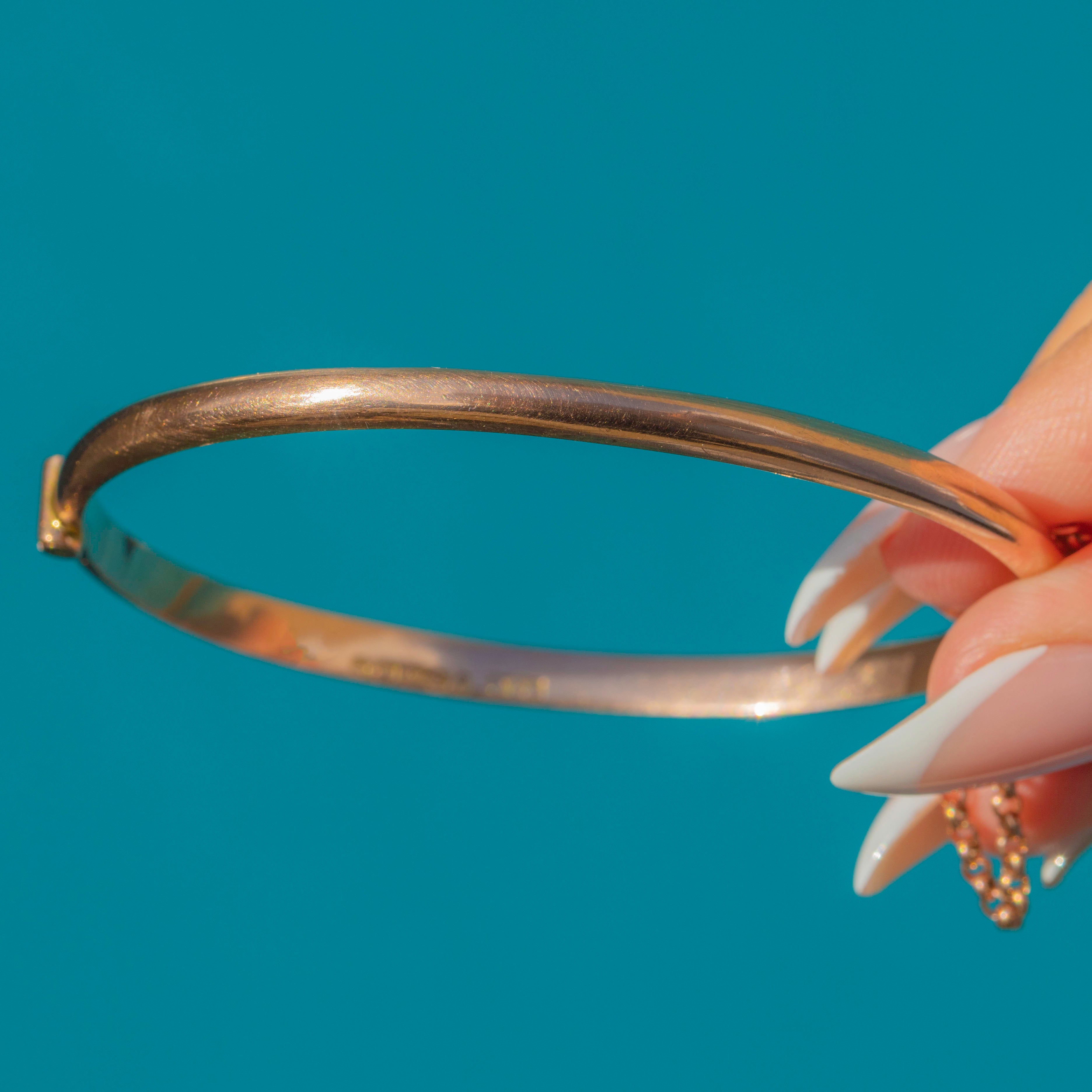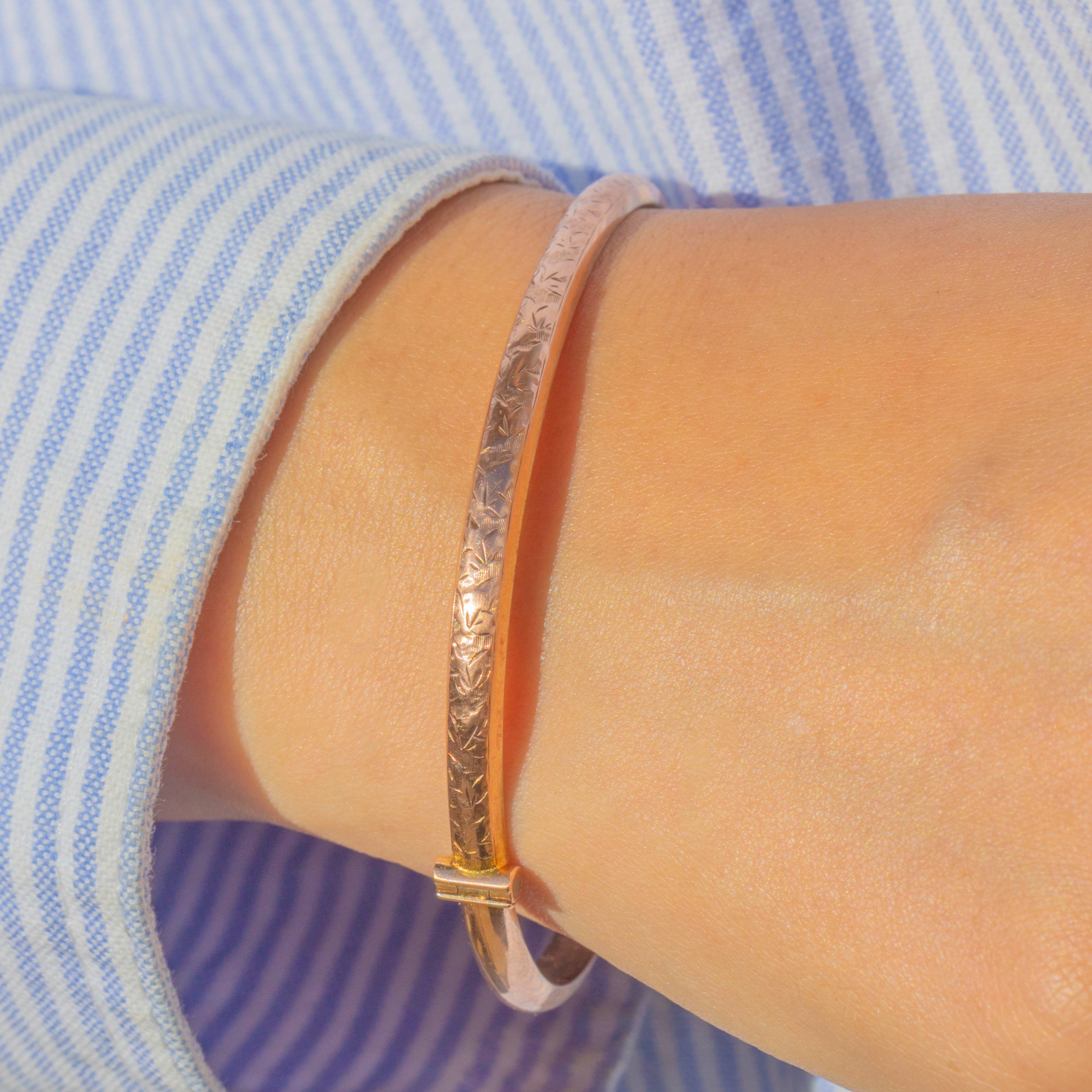 A refined Edwardian bangle in 9ct Gold, engraved all around with a crisp foliate (leaf) pattern. The slim 4mm profile stacks beautifully yet has enough presence to wear solo, and the hinge-and-clasp work cleanly for effortless, everyday use. Leaf motifs were popular in the era—traditionally a symbol of growth and renewal.