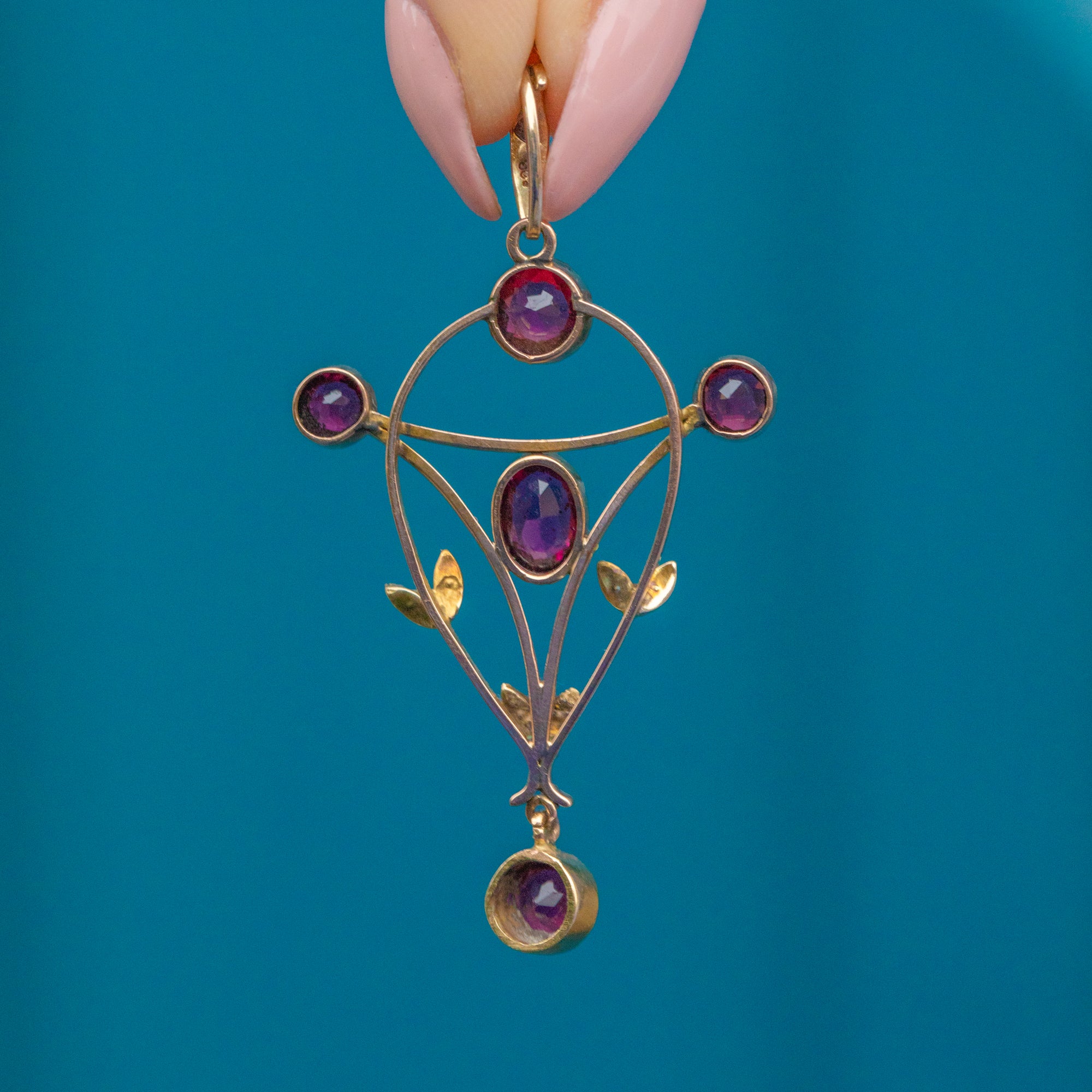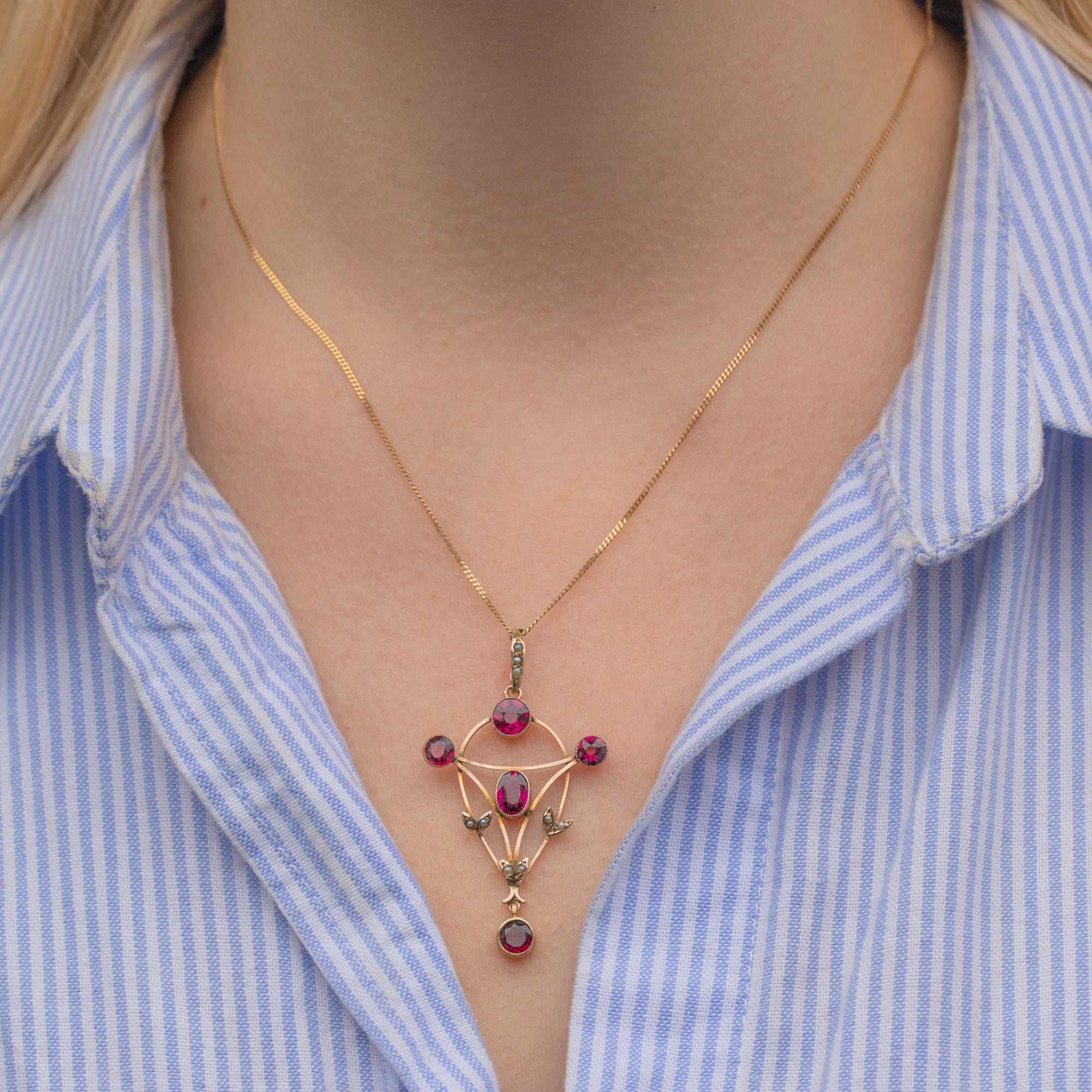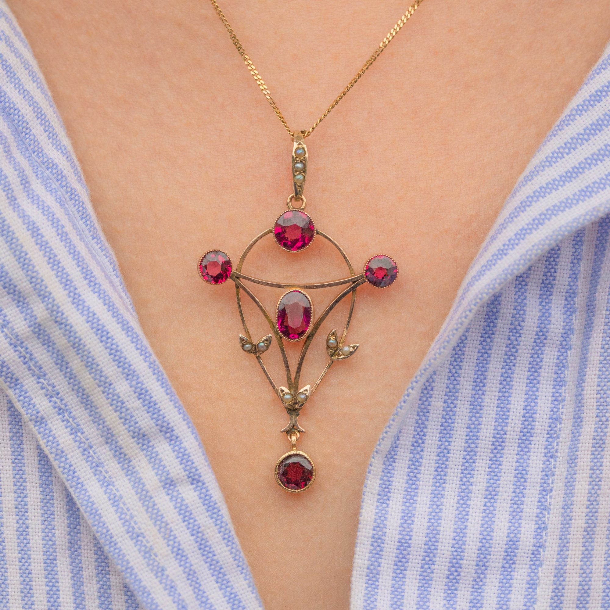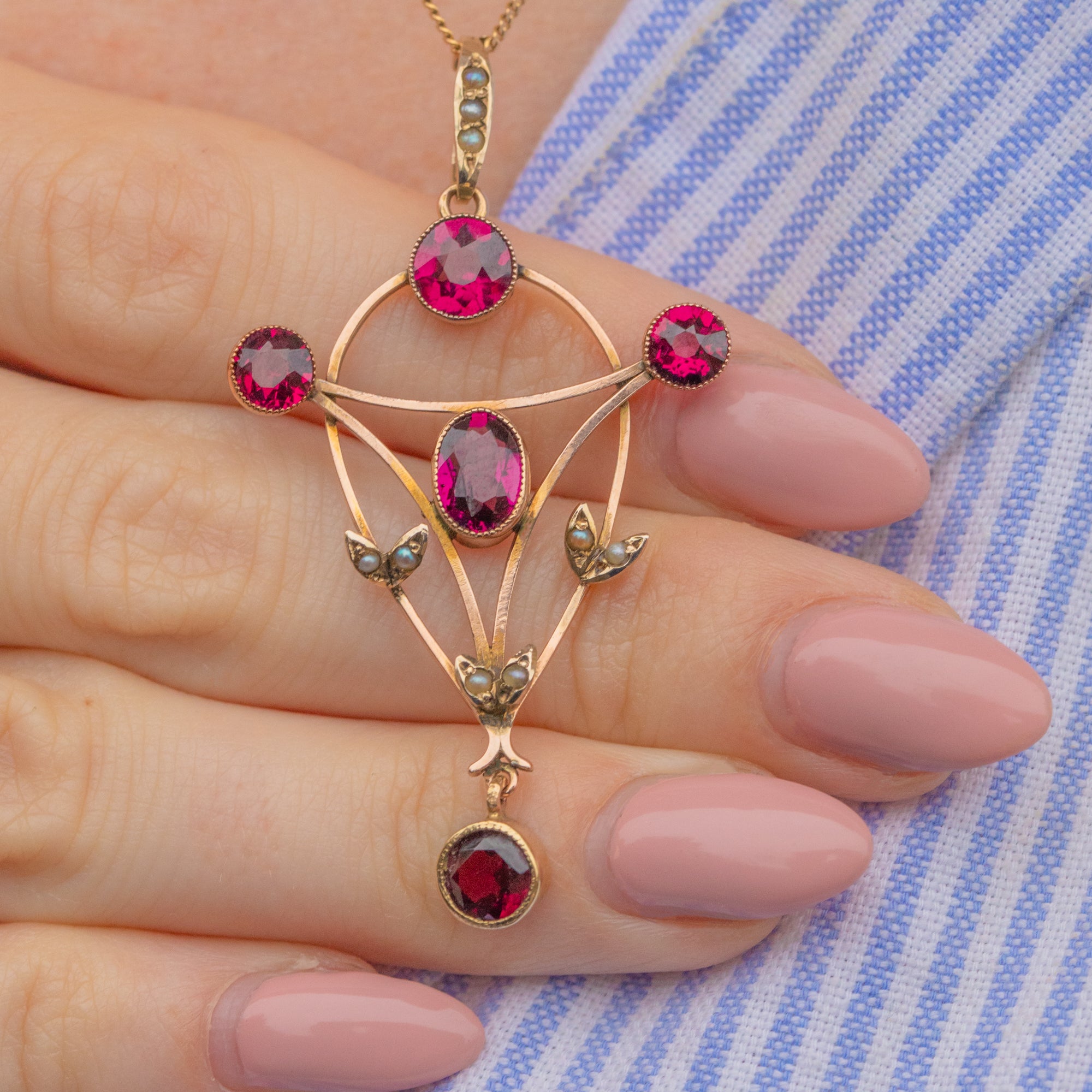 Featuring five Garnets, this antique pendant radiates brilliantly vibrant fuchsia-red hues, effortlessly complimented by the warmth of her 9ct yellow Gold bezel settings. She is accented by dainty iridescent Pearls set within intricate foliate details.