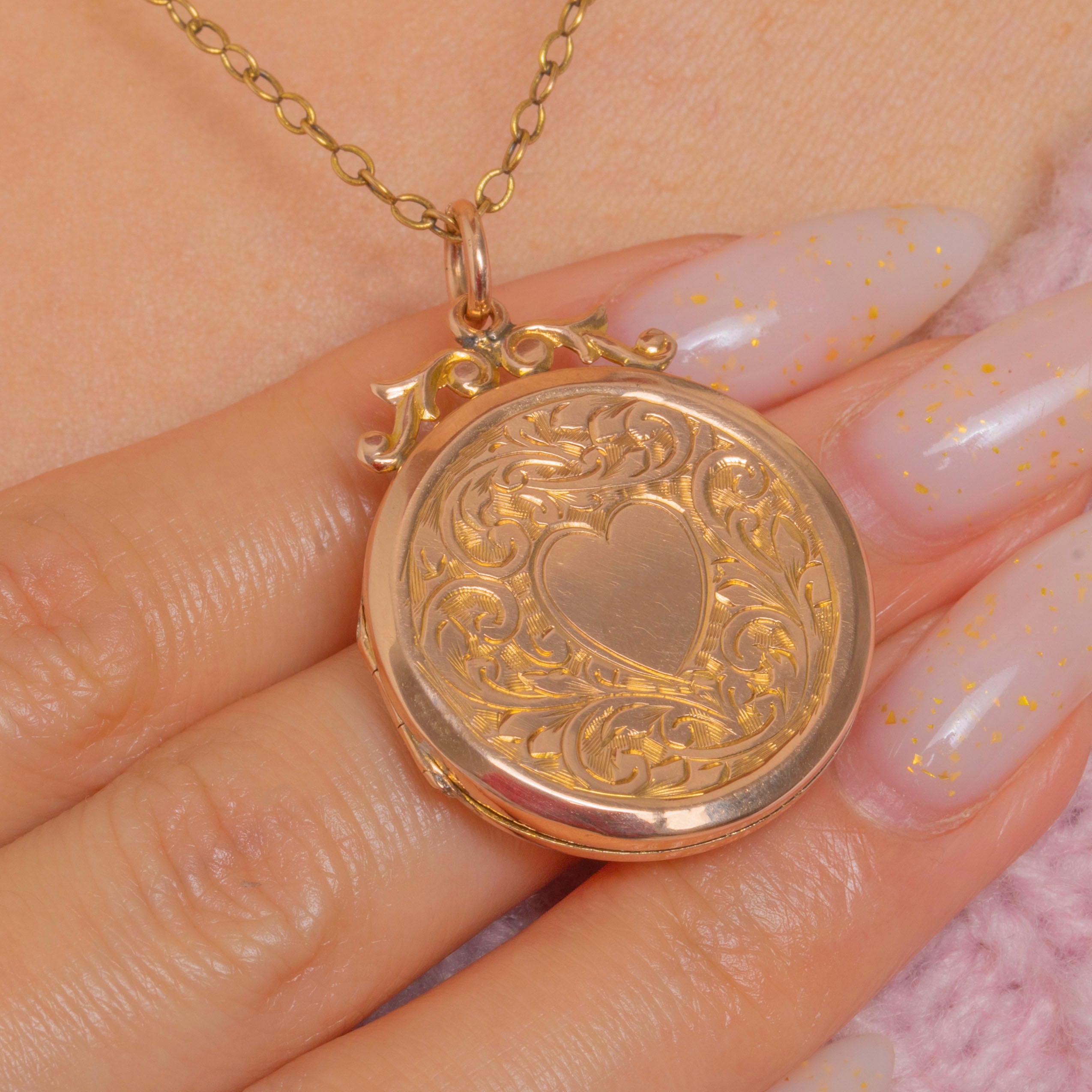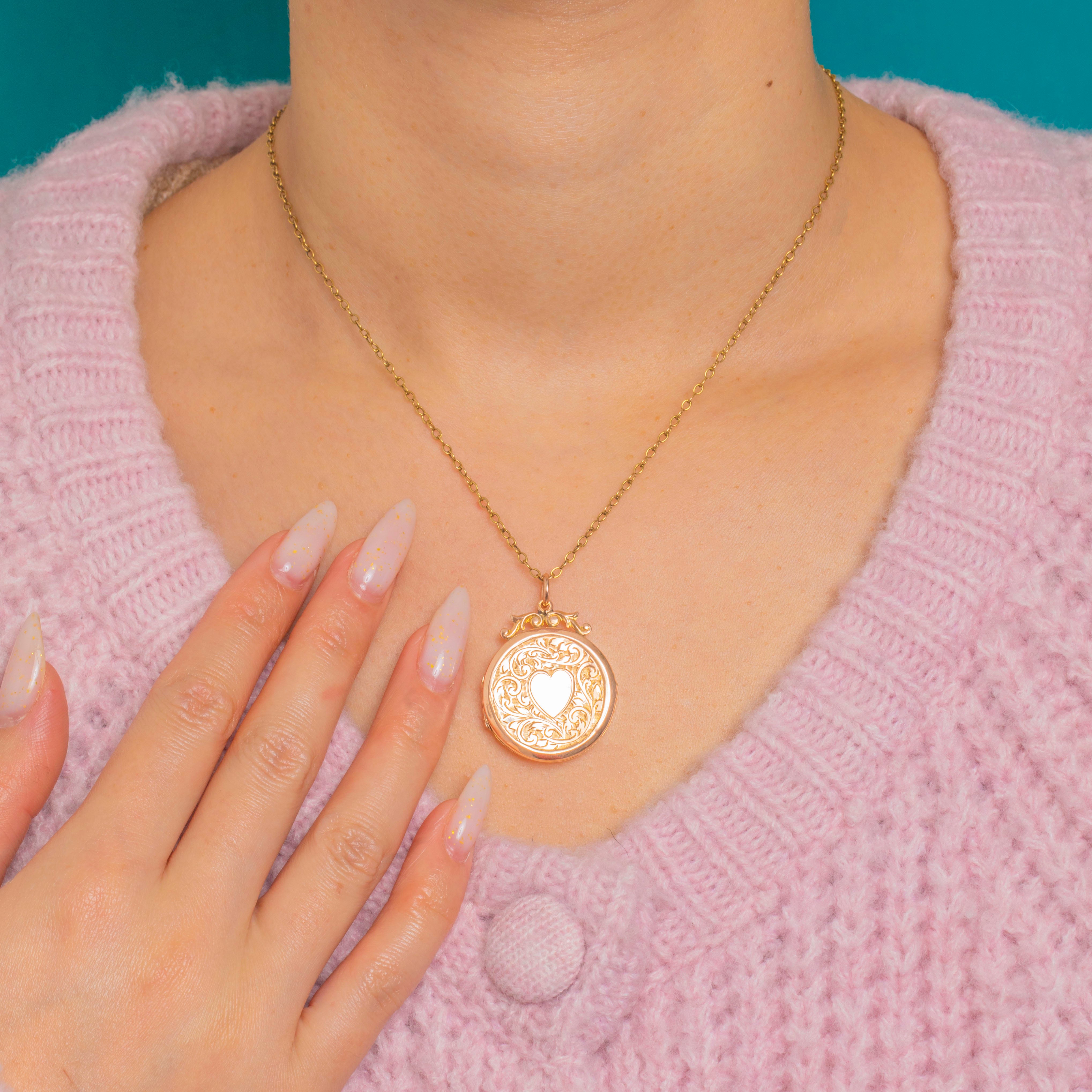 Romance in miniature, this Edwardian round locket is crafted in 9ct Gold Back & Front with a gentle rosy hue. Its face is richly adorned with scrolling foliate engraving over an engine-turned ground, framing a polished heart cartouche ready for a personal touch. An ornate pierced scroll bale completes the elegant, sentimental feel.
