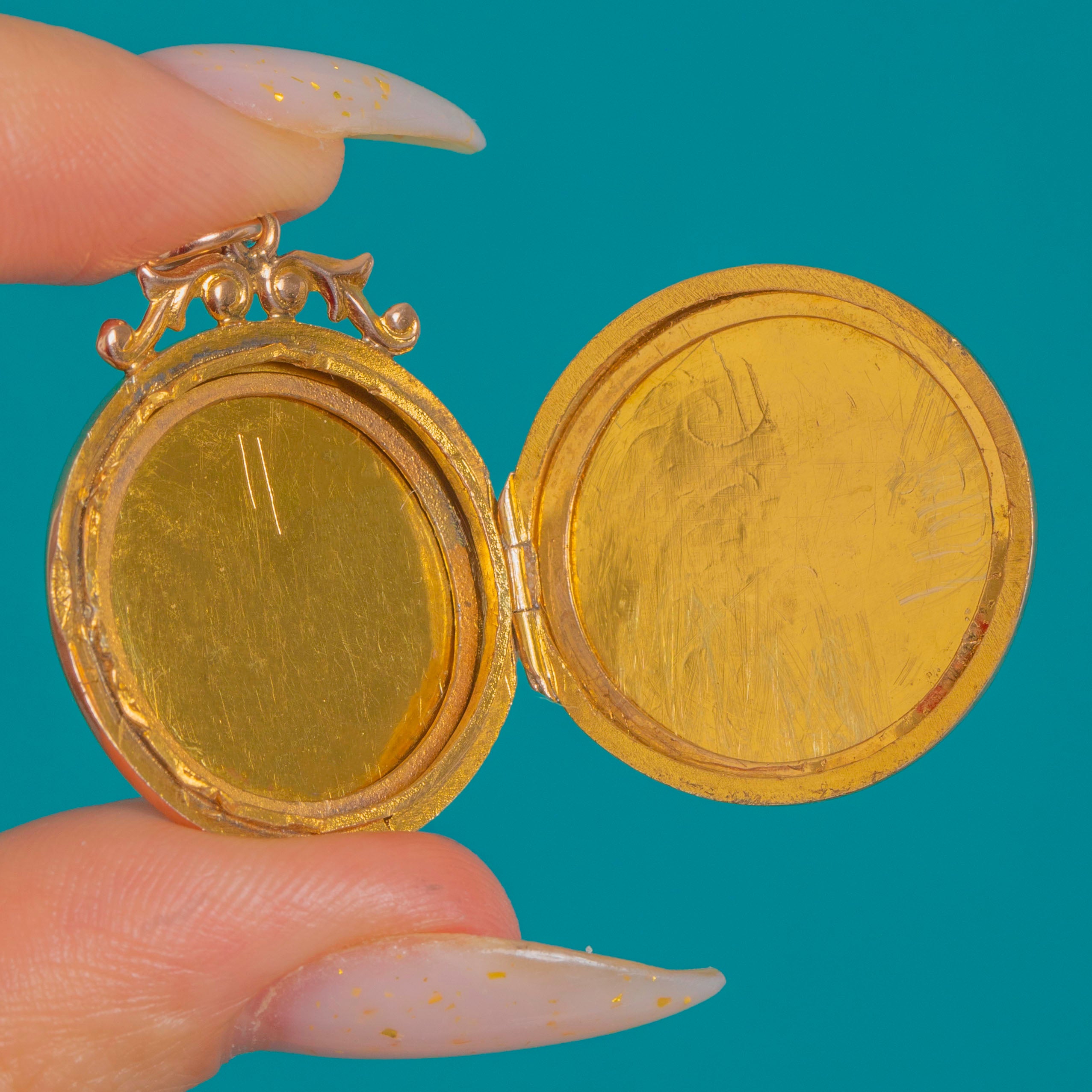 GOOD: No gemstones are present, so no facet wear to note; the engraving remains crisp with light surface scratches and a small rim ding commensurate with age. The hinge is sound and the locket opens and closes securely, though the catch does not snap fully shut; it still stays closed in wear. Interior photo wells show scuffs and traces of old adhesive from previous inserts, with no visible repairs.