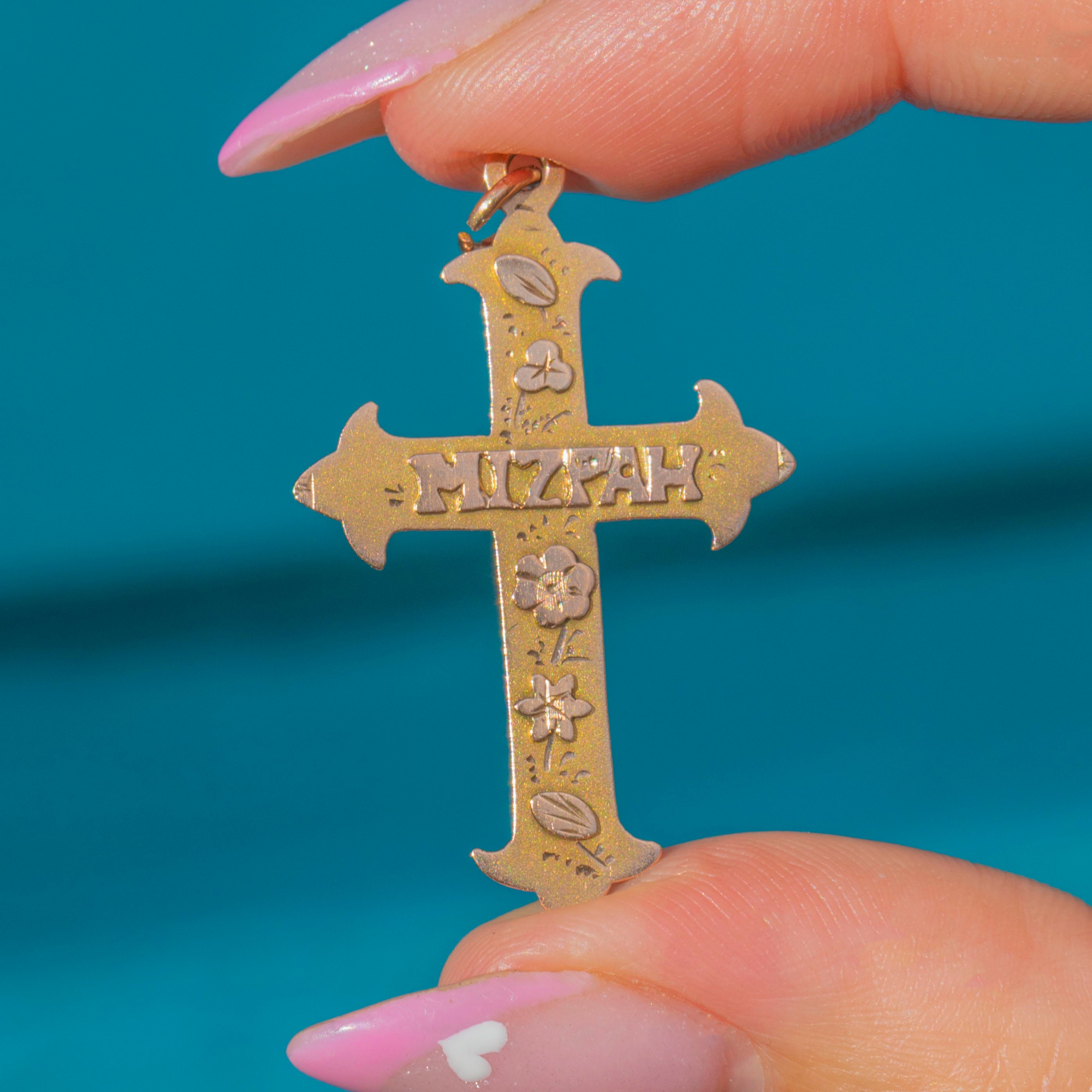 A sentimental Edwardian cross pendant in 9ct Gold, beautifully engraved with delicate leaves and forget-me-not flowers surrounding the word “MIZPAH”.