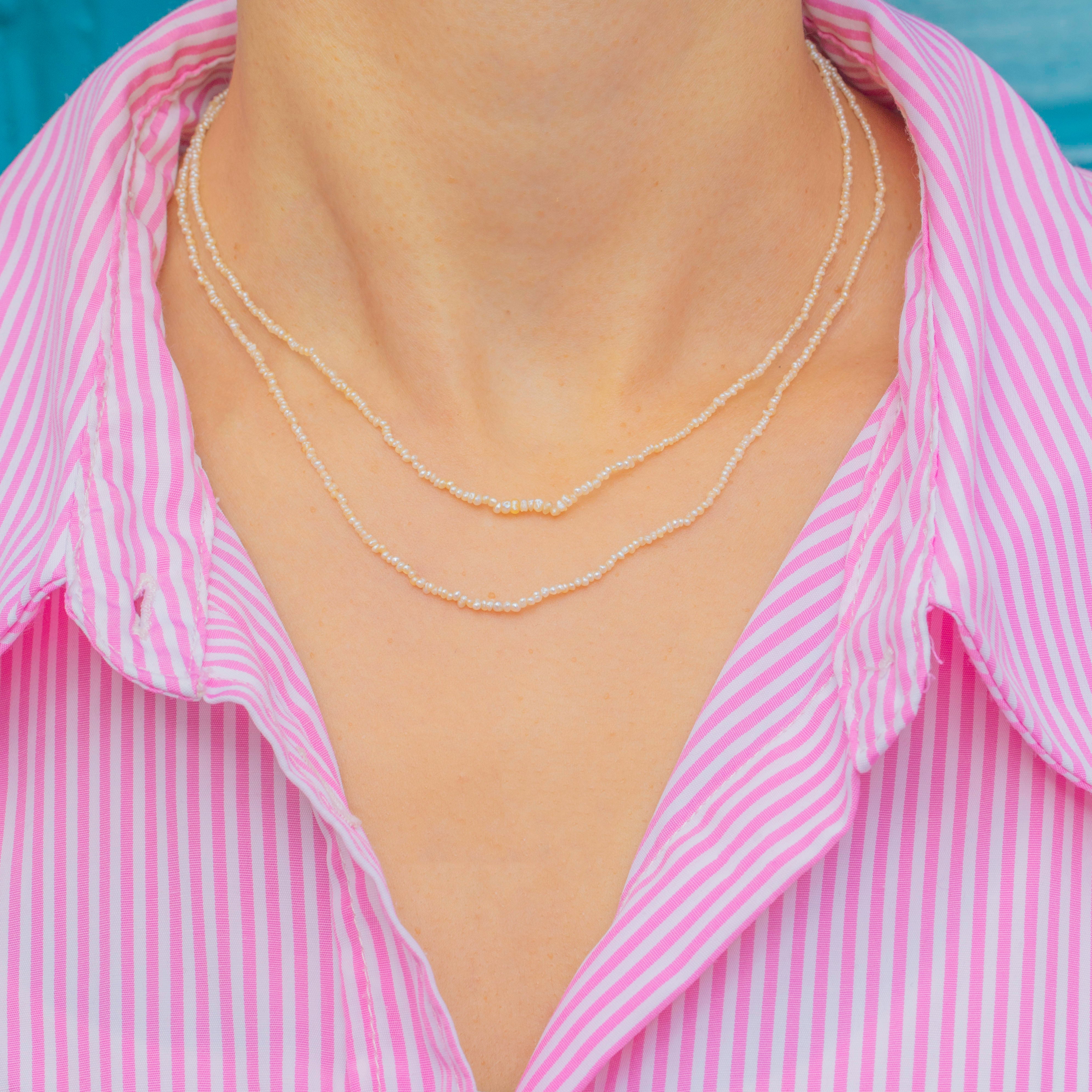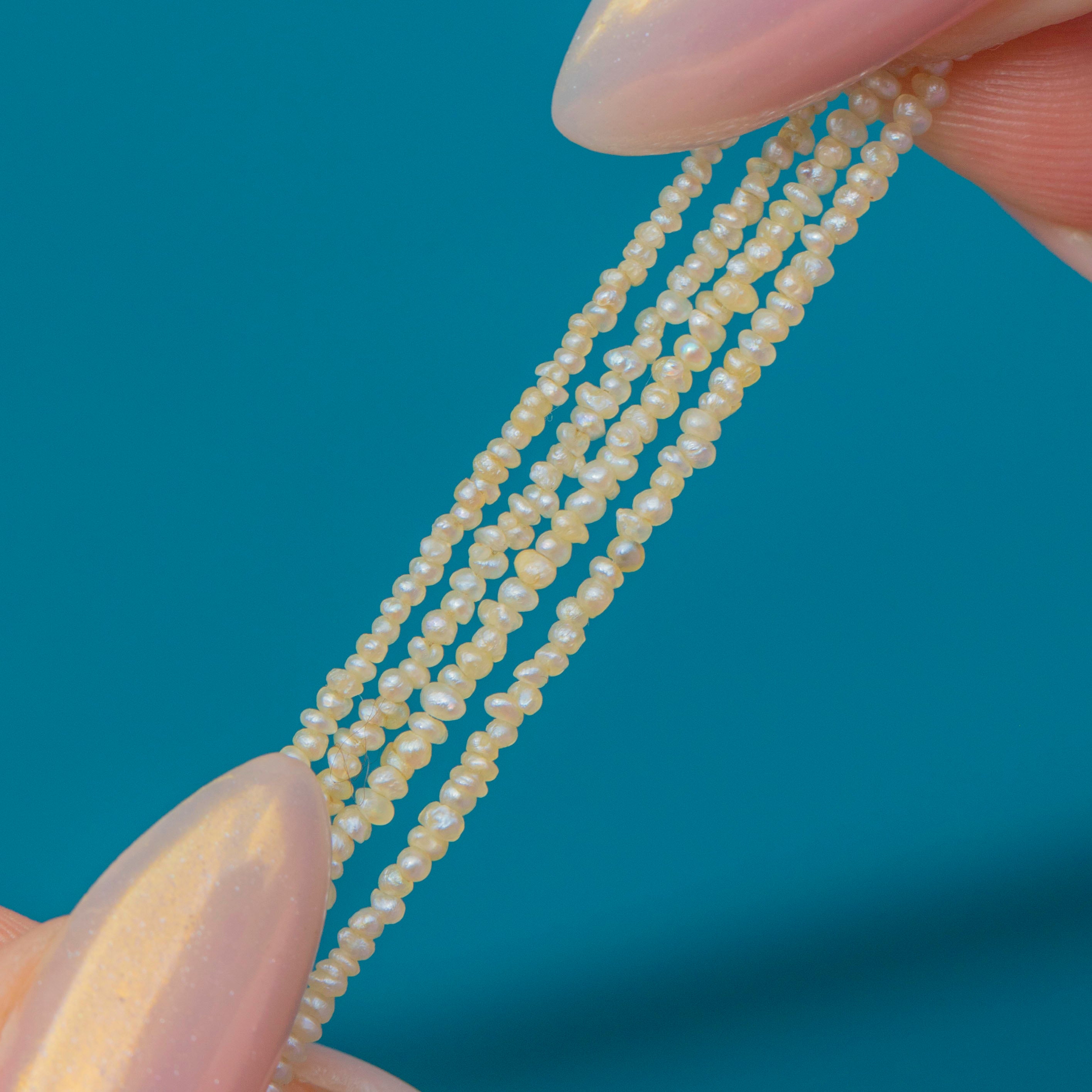 The longest strand measures 15" and the shorter 14", with pearls approximately 1mm wide, exhibiting a soft ivory lustre with peach and silver overtones. The original 9ct Gold barrel clasp adds a touch of rosy warmth, stamped "9CT" and clicks shut securely.