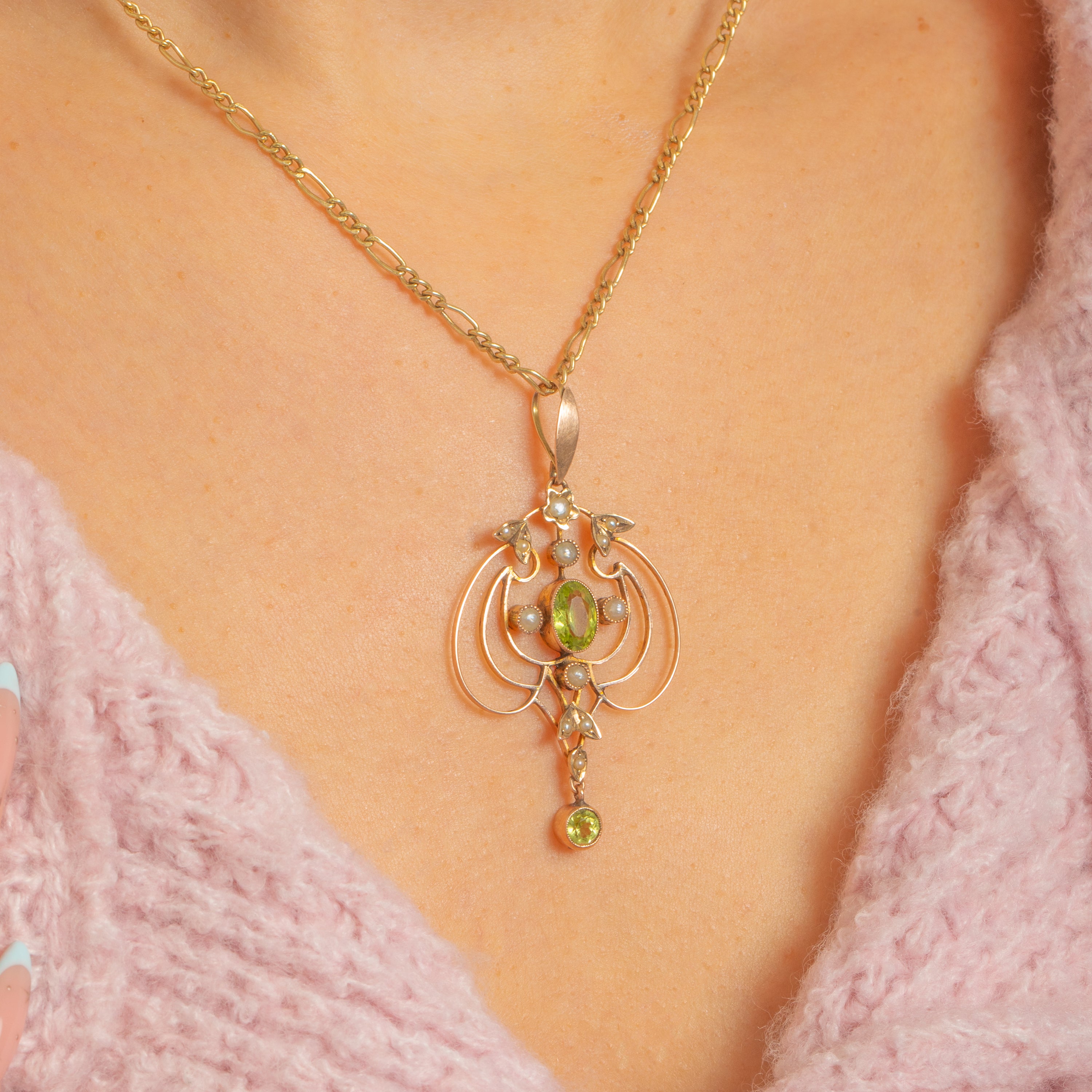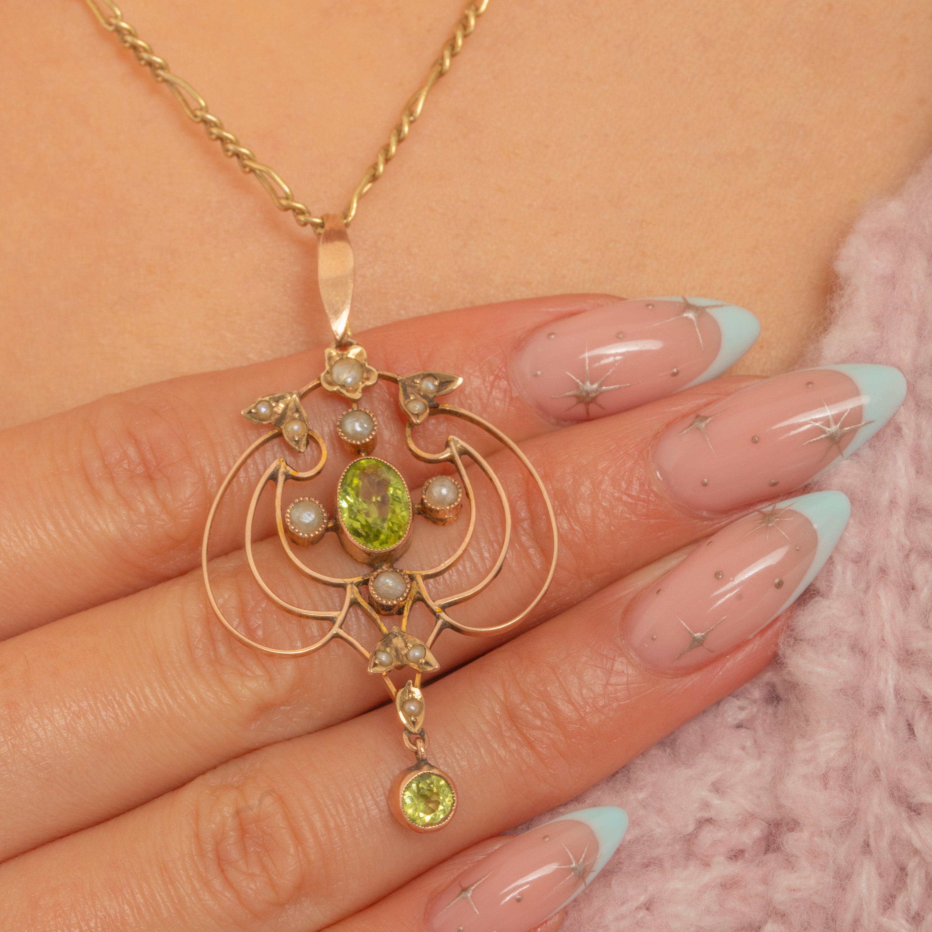 A graceful Edwardian pendant crafted in 9ct Gold, its airy openwork traced with flowing whiplash curves and tiny foliate accents. At the heart glows an oval Peridot in a fine milgrain collet, its fresh apple-green hue echoed by a dainty round Peridot drop that dances below. Creamy Pearls are dotted across the design, lending soft lustre against the warm Gold.