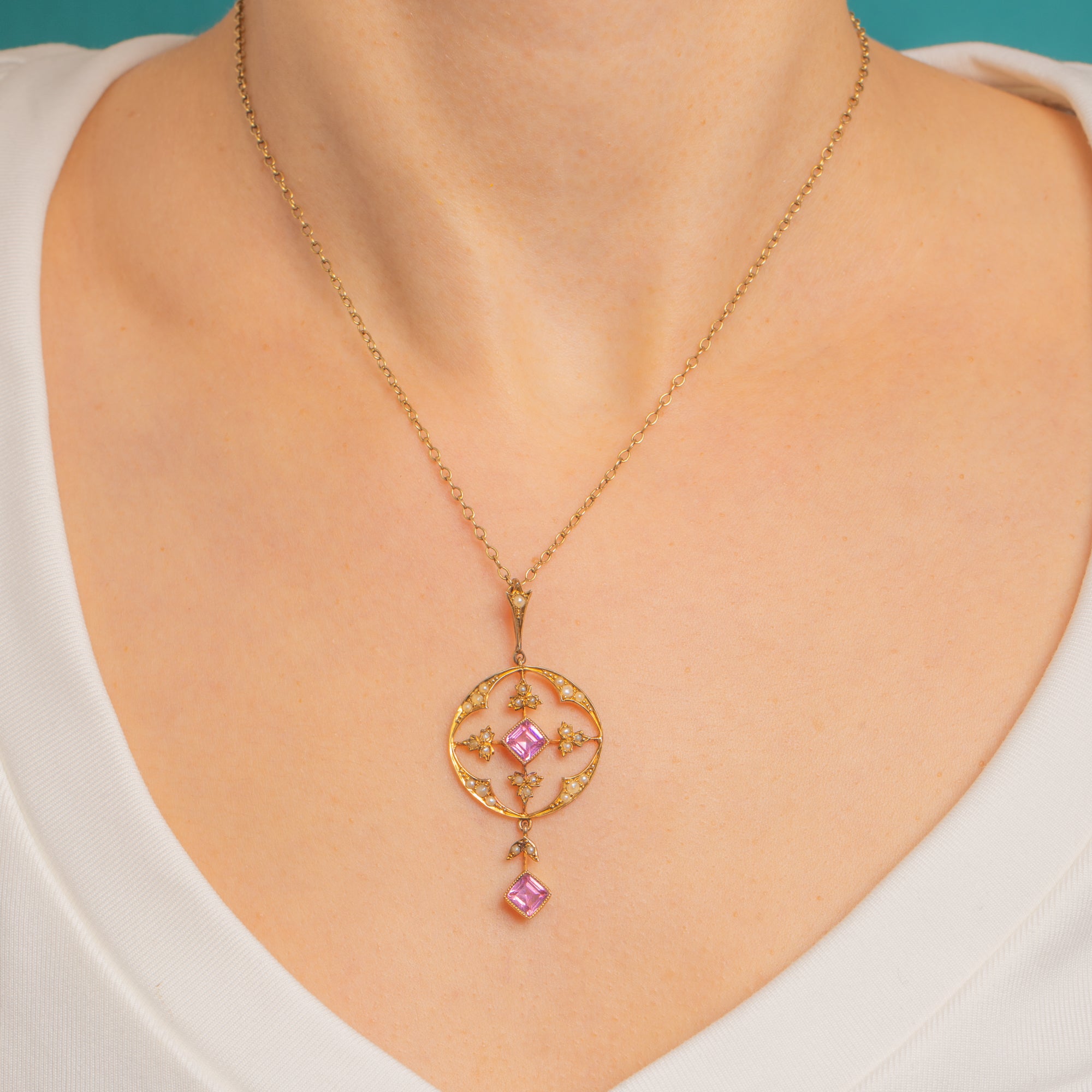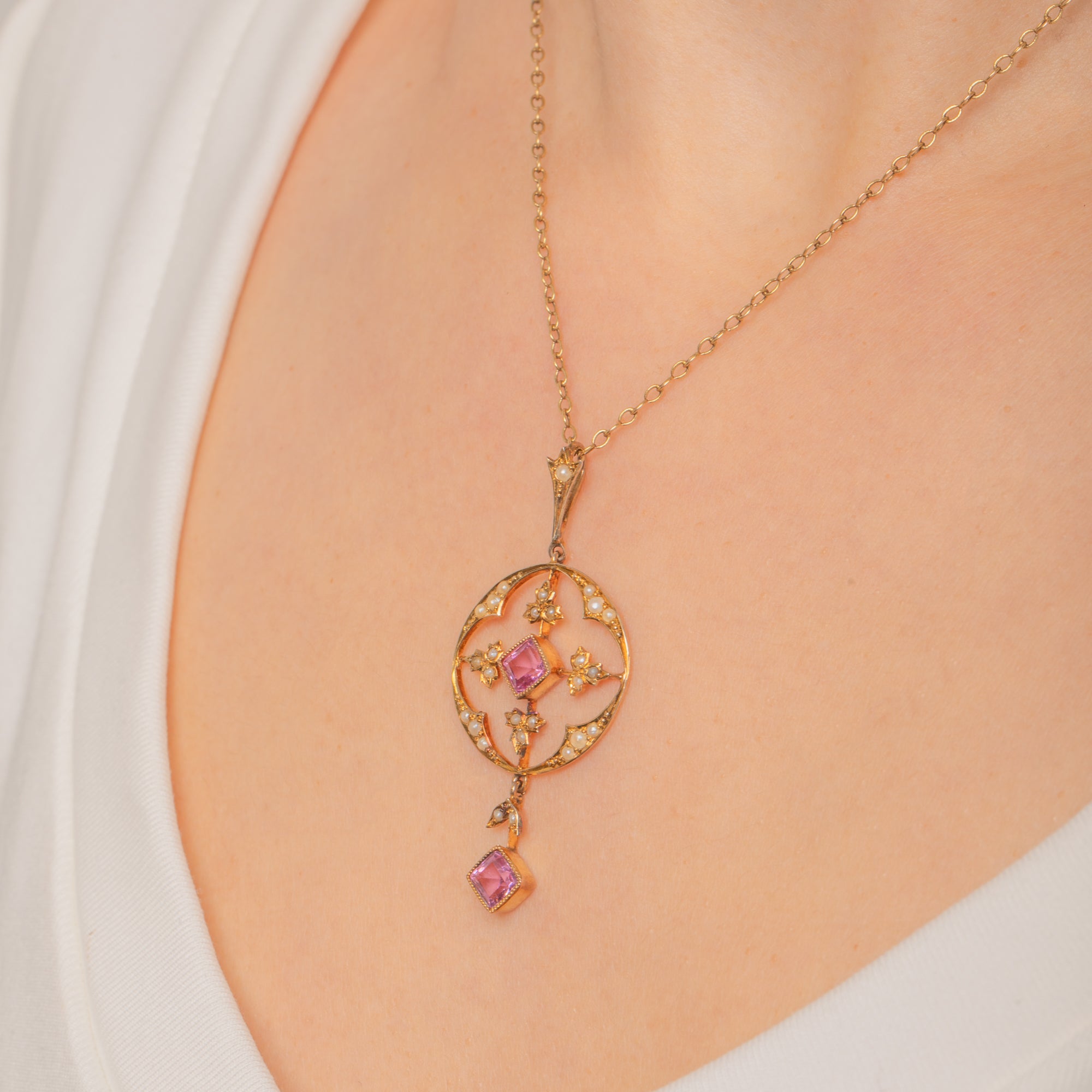 A quintessential Edwardian garland pendant, this 9ct Gold beauty traces an airy openwork circle with delicate foliate and floral motifs set throughout with luminous Pearls. At its heart sits a square Pink Tourmaline on the diagonal, echoed by a matching articulated drop that dances with every movement. Fine milgrain and rub-over edges add a refined, lace-like finish to the design, while a tapered, Pearl-set bale completes the composition.