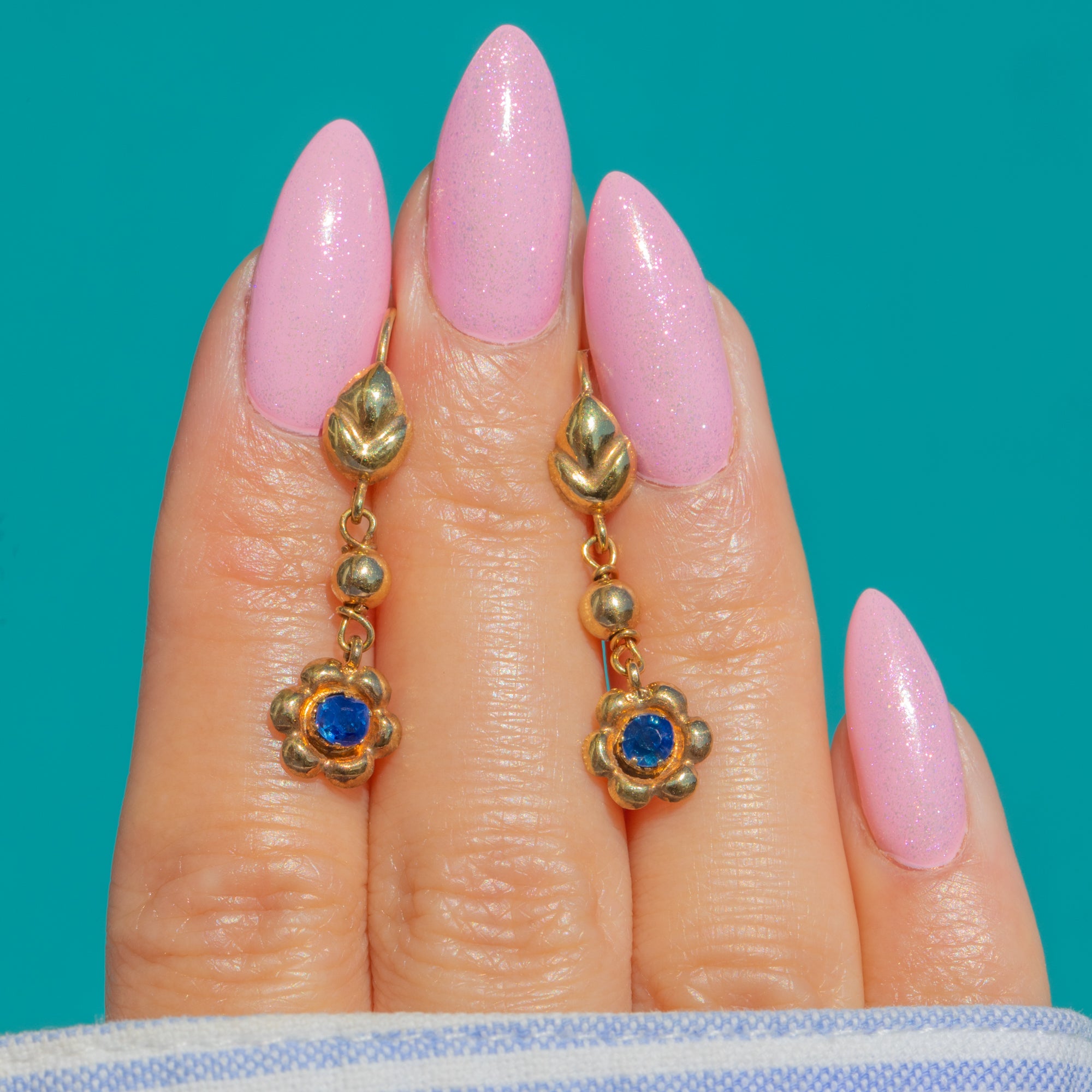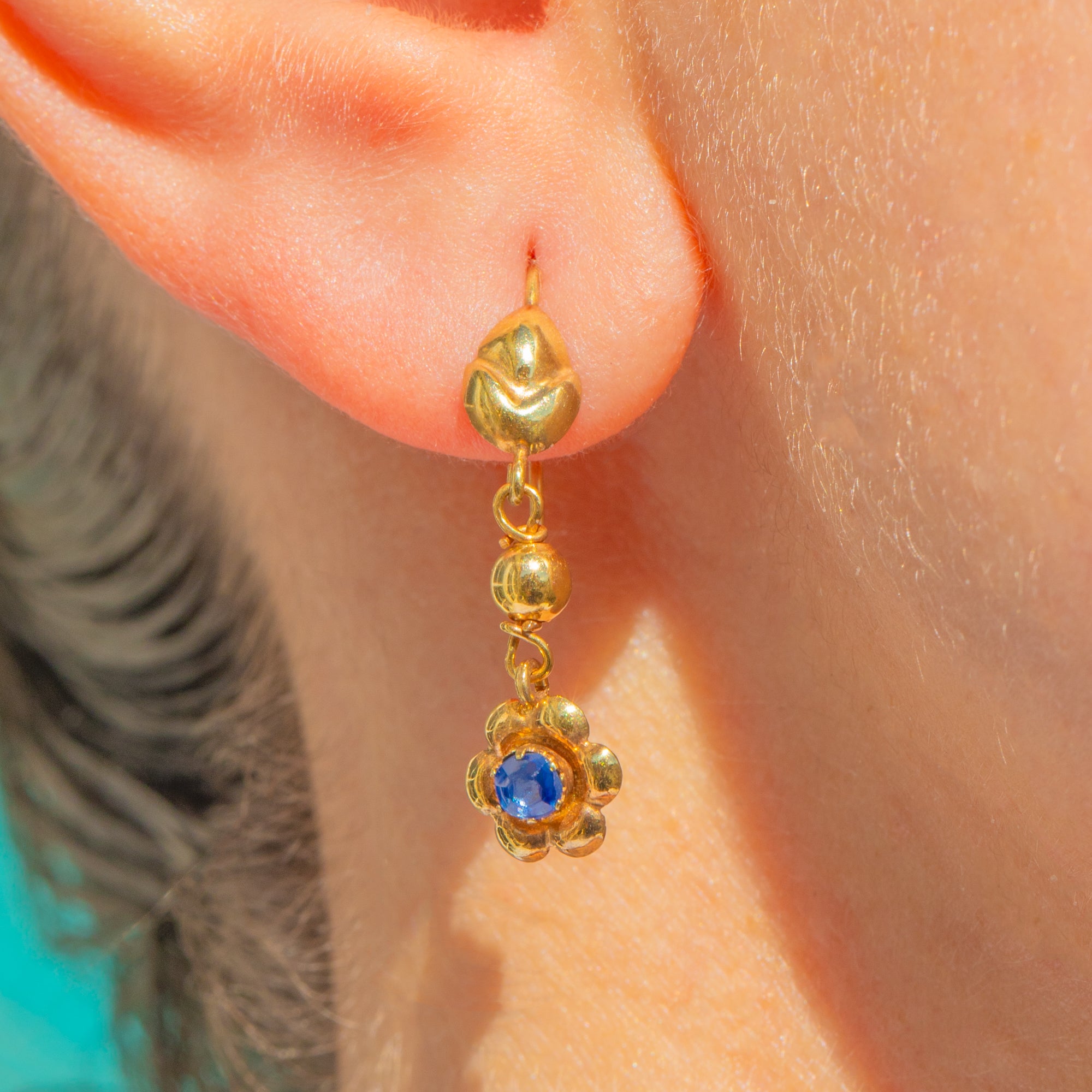 These antique Edwardian drop earrings are a charmingly delicate pair, crafted in rich 9ct Gold and set with vivid blue Sapphires. Each earring is formed with a graceful hooked top, a polished Gold bead, and a sweet flower-shaped drop centred with a sparkling Sapphire.