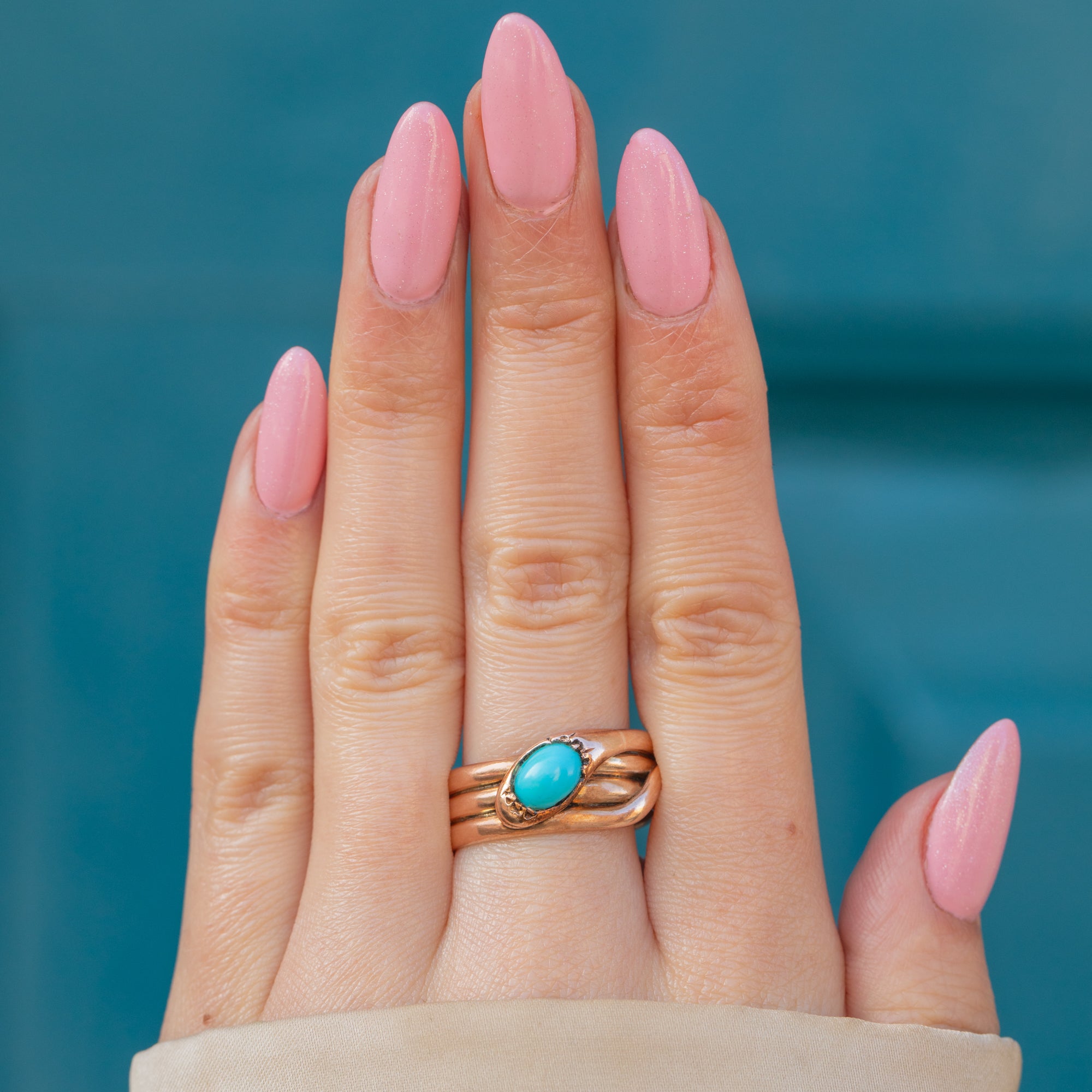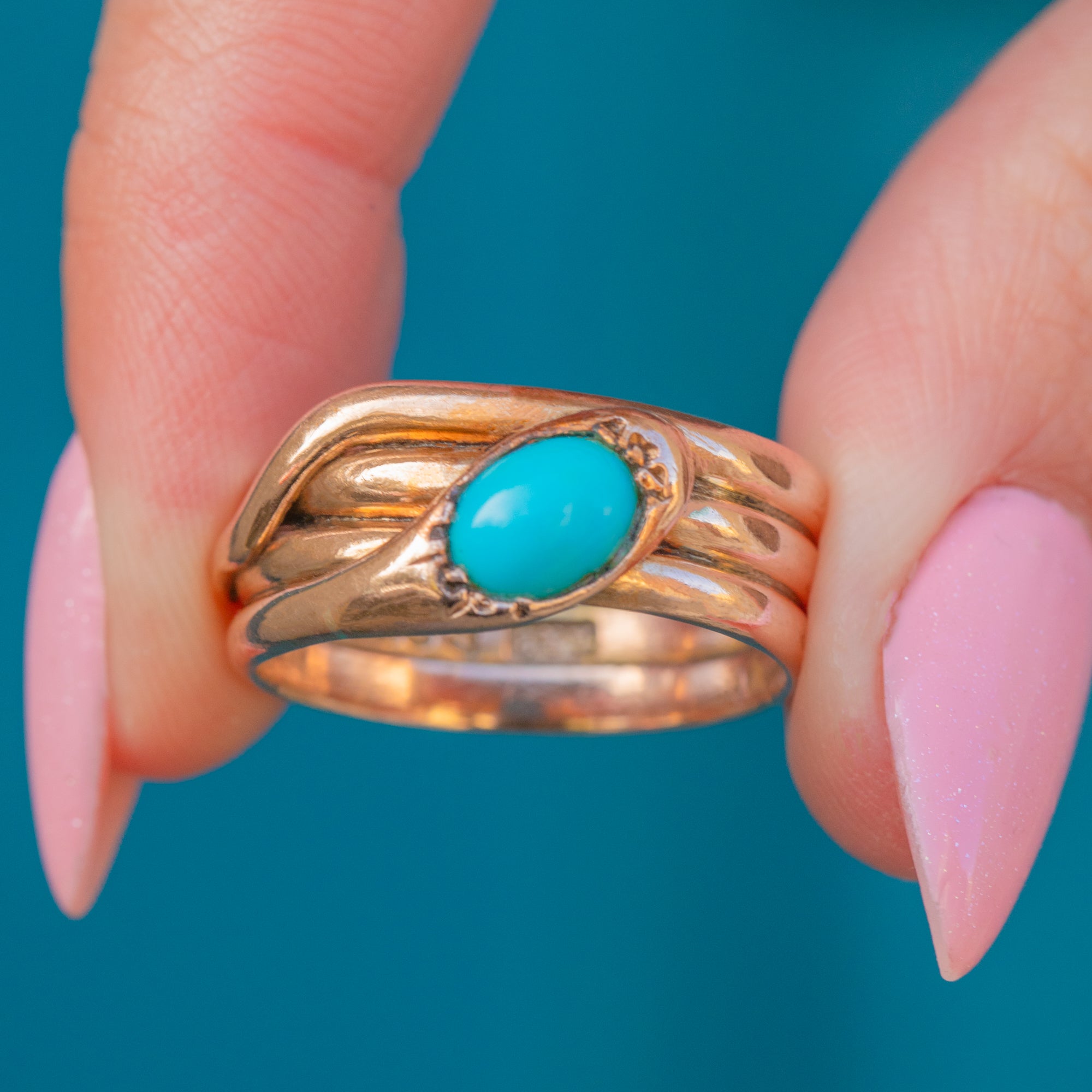 VERY GOOD: This Edwardian 9ct Gold Turquoise snake ring is in very good condition. The ring band has held its form well over the years and the Gold has a gorgeous rosy hue. The Gold shows some minor age-related wear throughout, which is to be expected from a piece of such great age. The Turquoise is smooth and securely set and the hallmarks are fully legible, allowing us to accurately date this Edwardian snake ring to 1902!
