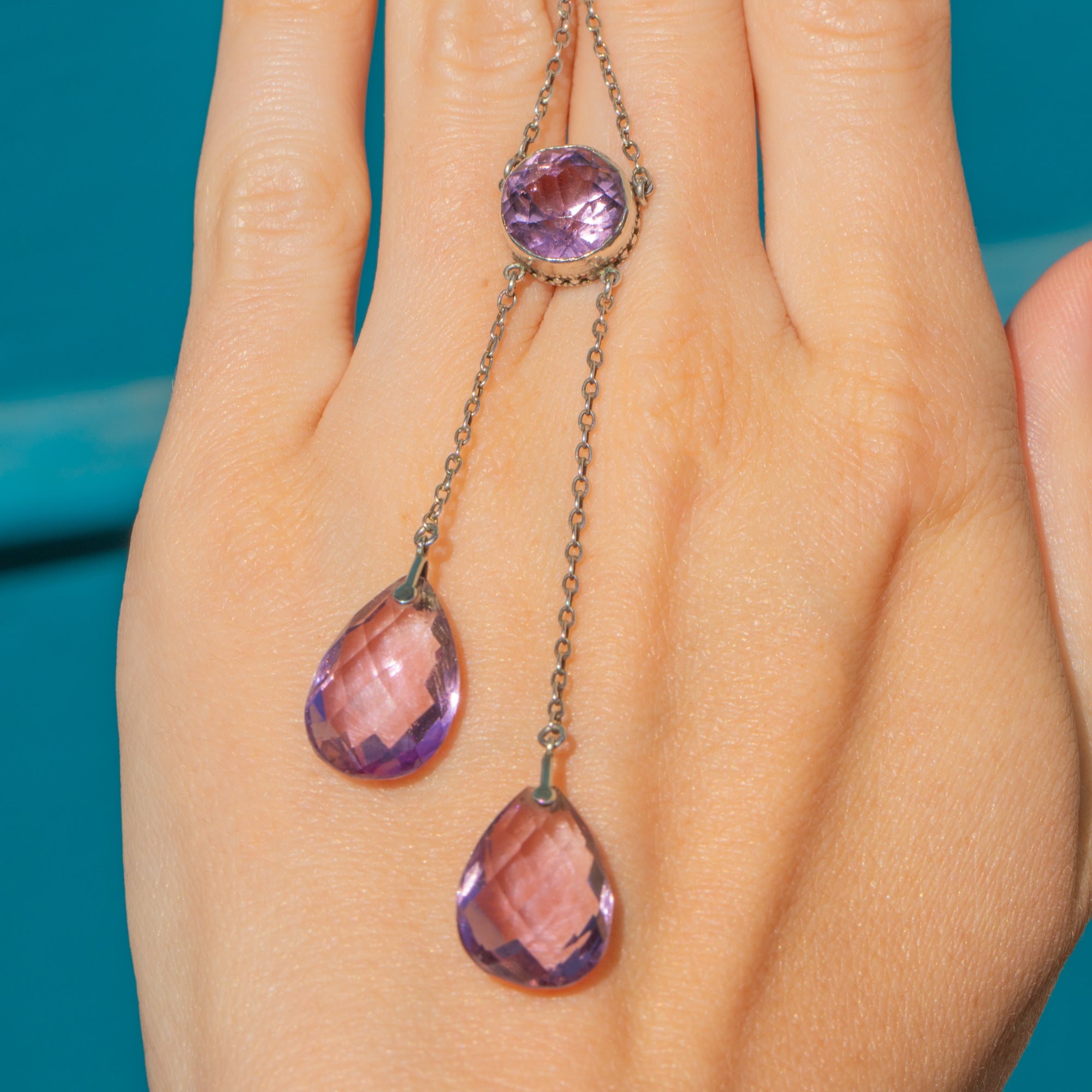 VERY GOOD. This Edwardian Silver Amethyst negligee necklace is in very good condition. Each Amethyst is securely connected to the main body of the necklace and have a uniform hue throughout. To the culet of the central Amethyst there is a small amount of surface wear, but this cannot be seen when worn. With a nice and sturdy chain, he negligee design remains the centre of attention, secured around your neck by the fully functioning bolt ring.