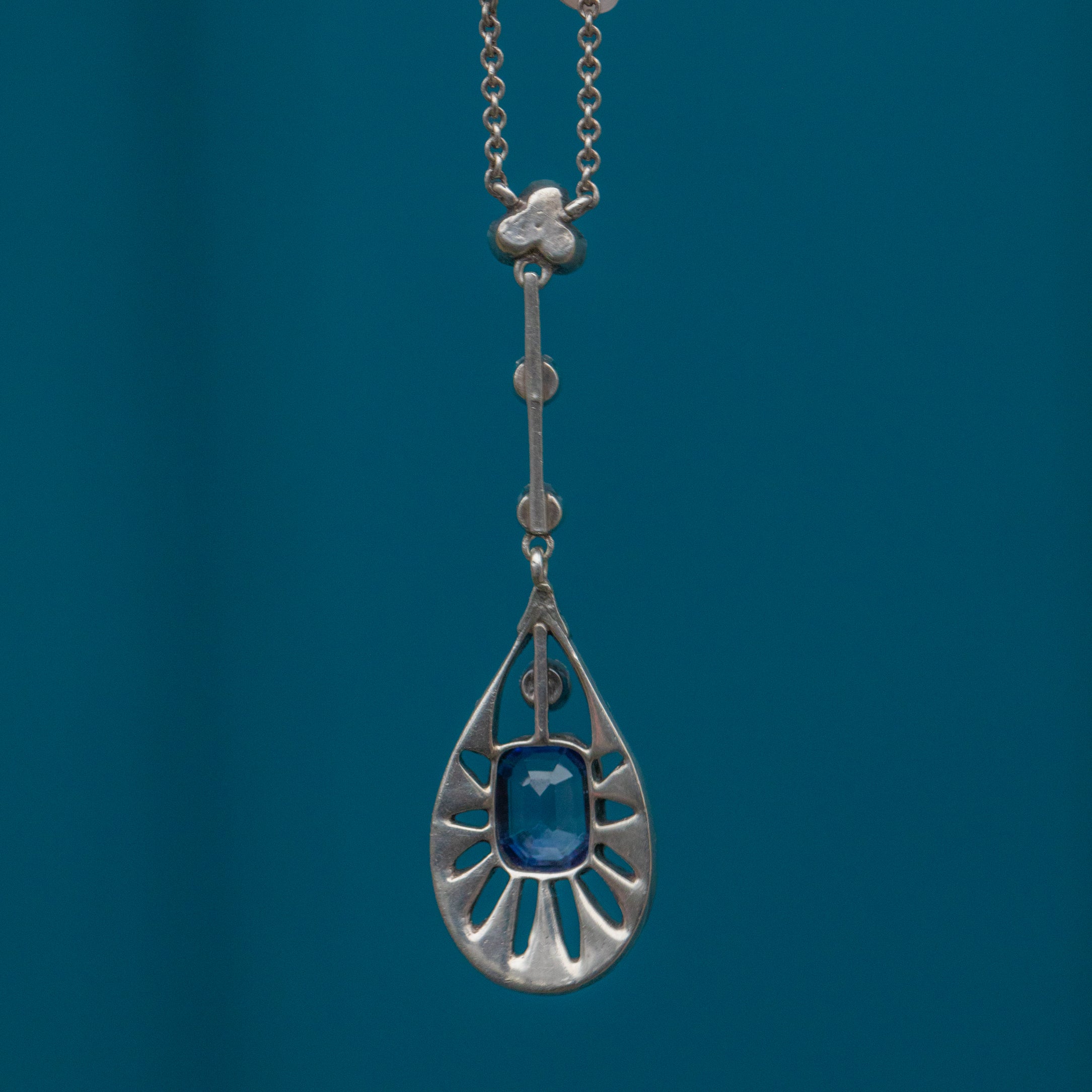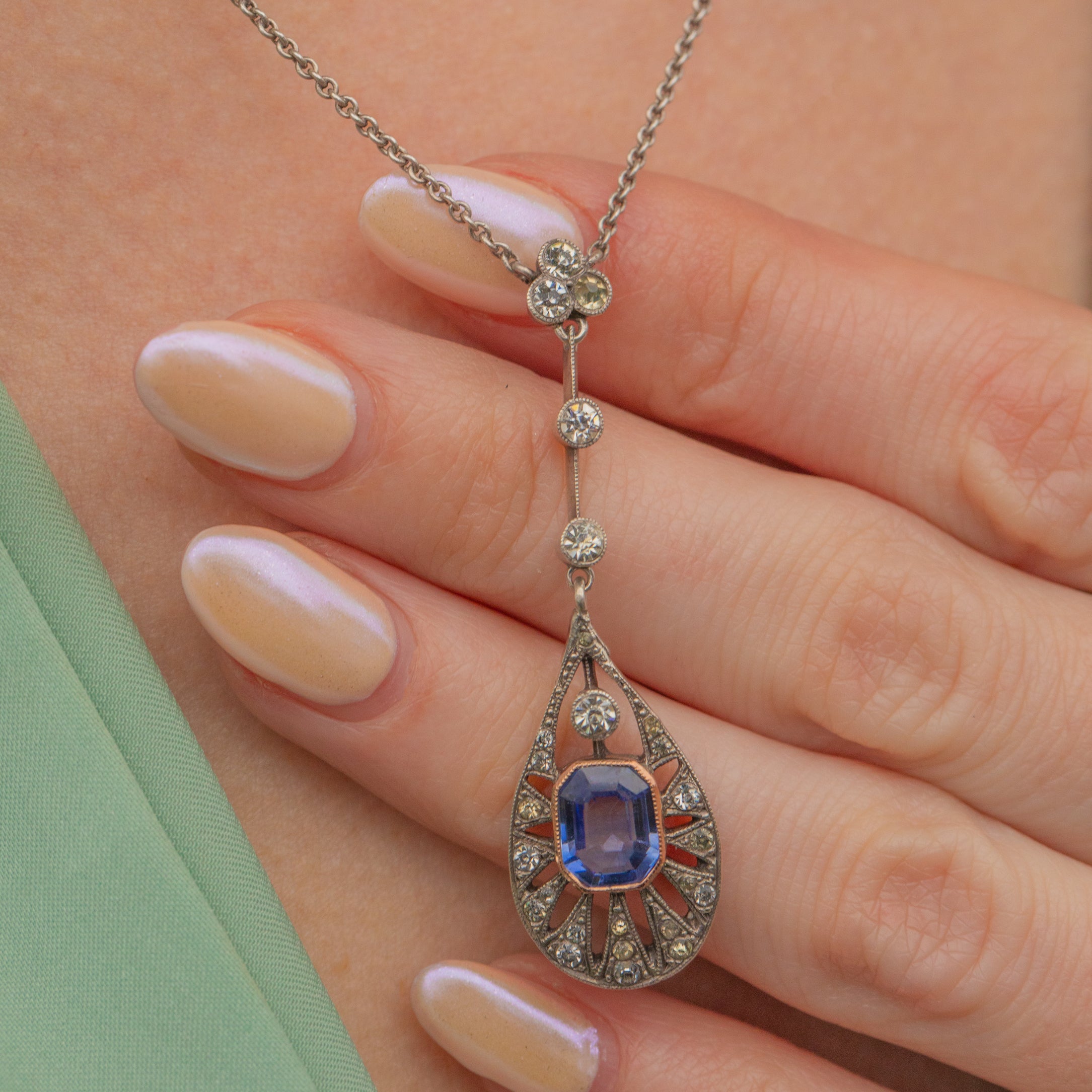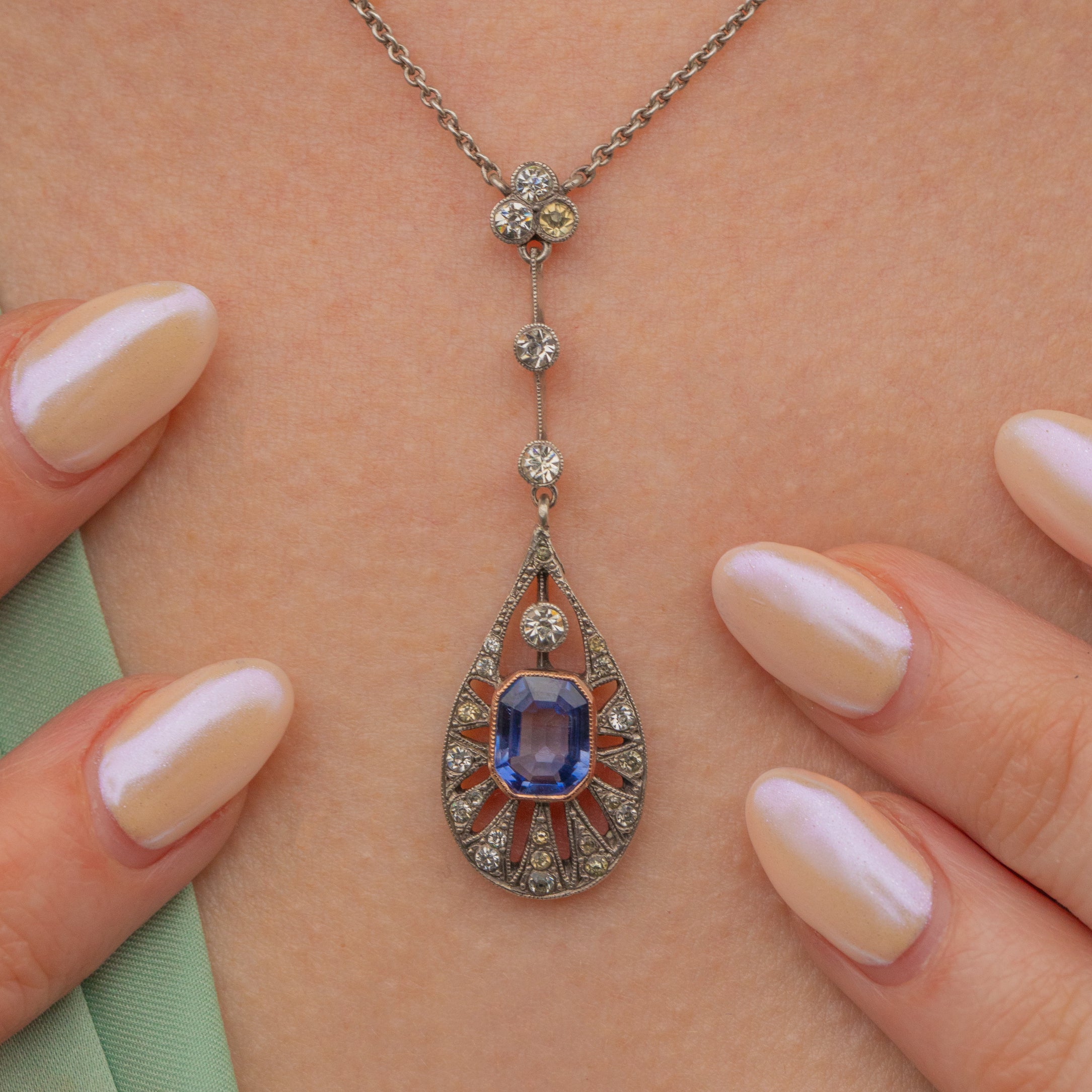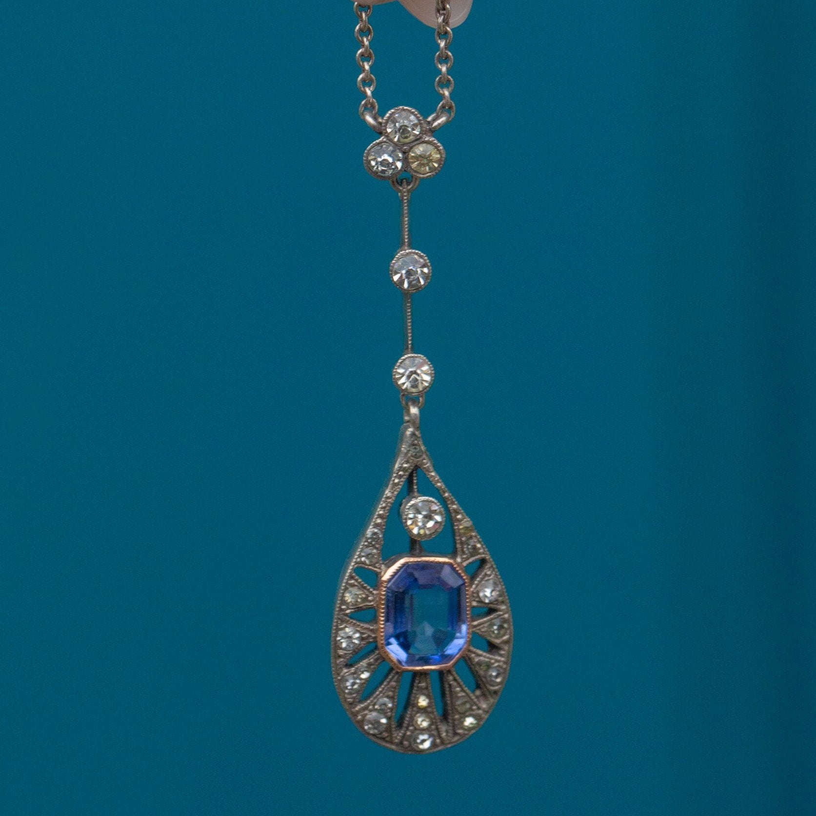VERY GOOD-EXCELLENT. This Edwardian Blue Sapphire and Paste integral necklace is in lovely condition. Her Sapphire and surrounding Paste are all free from any visible signs of wear, and capture the light wonderfully. She suspended securely from her chain which is equally in good condition. There are some minor signs of wear to the necklace commensurate with age, however this does not affect her beauty. The bolt ring is in perfect working condition, allowing you to enjoy this spectacular antique Sapphire necklace with absolute confidence!