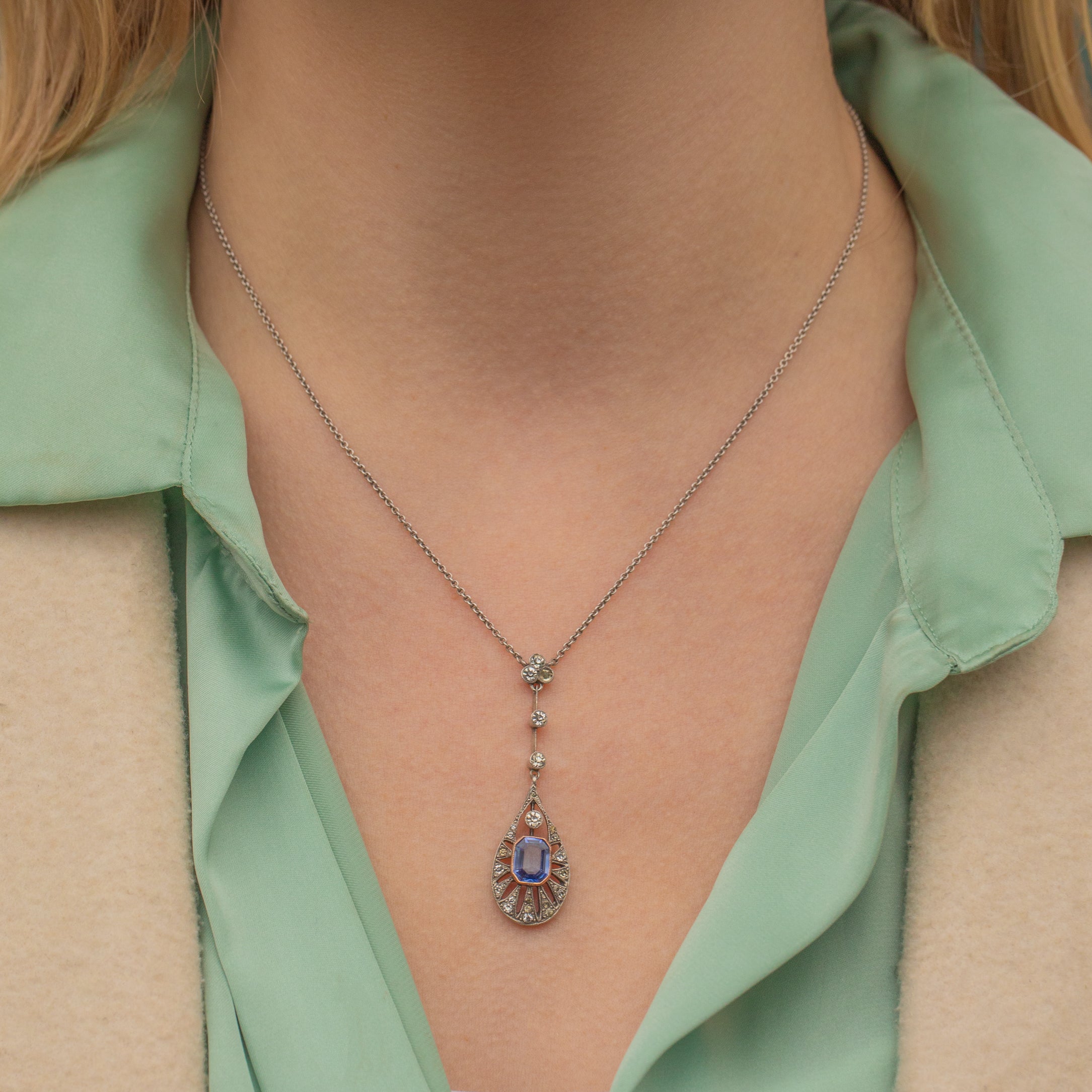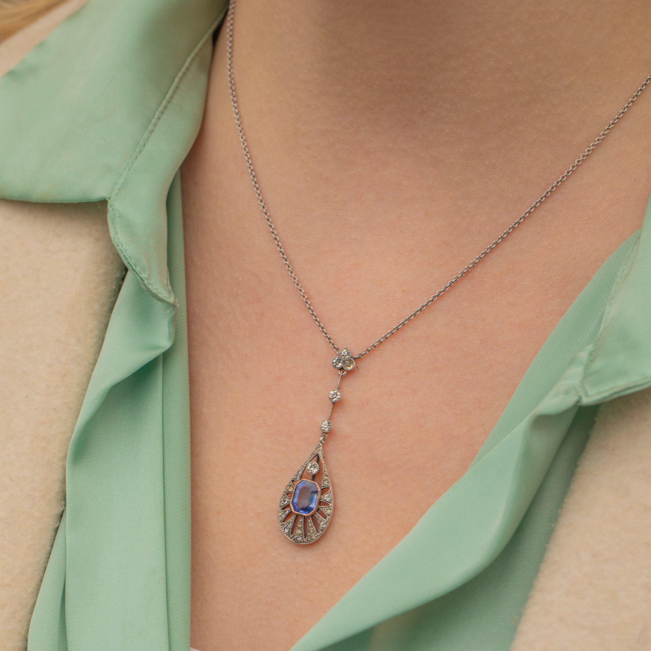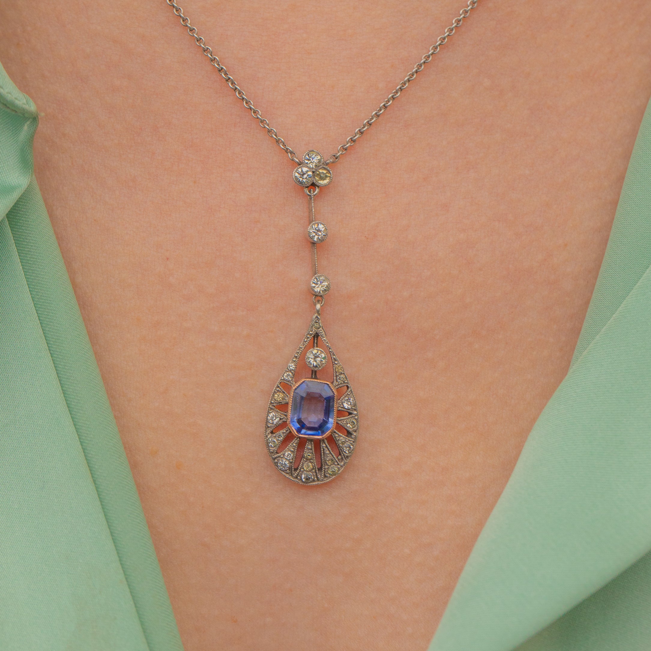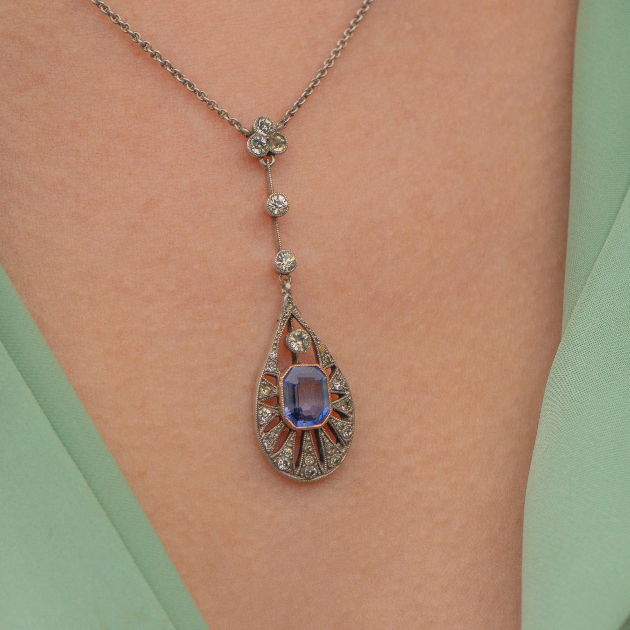 VERY GOOD-EXCELLENT. This Edwardian Blue Sapphire and Paste integral necklace is in lovely condition. Her Sapphire and surrounding Paste are all free from any visible signs of wear, and capture the light wonderfully. She suspended securely from her chain which is equally in good condition. There are some minor signs of wear to the necklace commensurate with age, however this does not affect her beauty. The bolt ring is in perfect working condition, allowing you to enjoy this spectacular antique Sapphire necklace with absolute confidence!