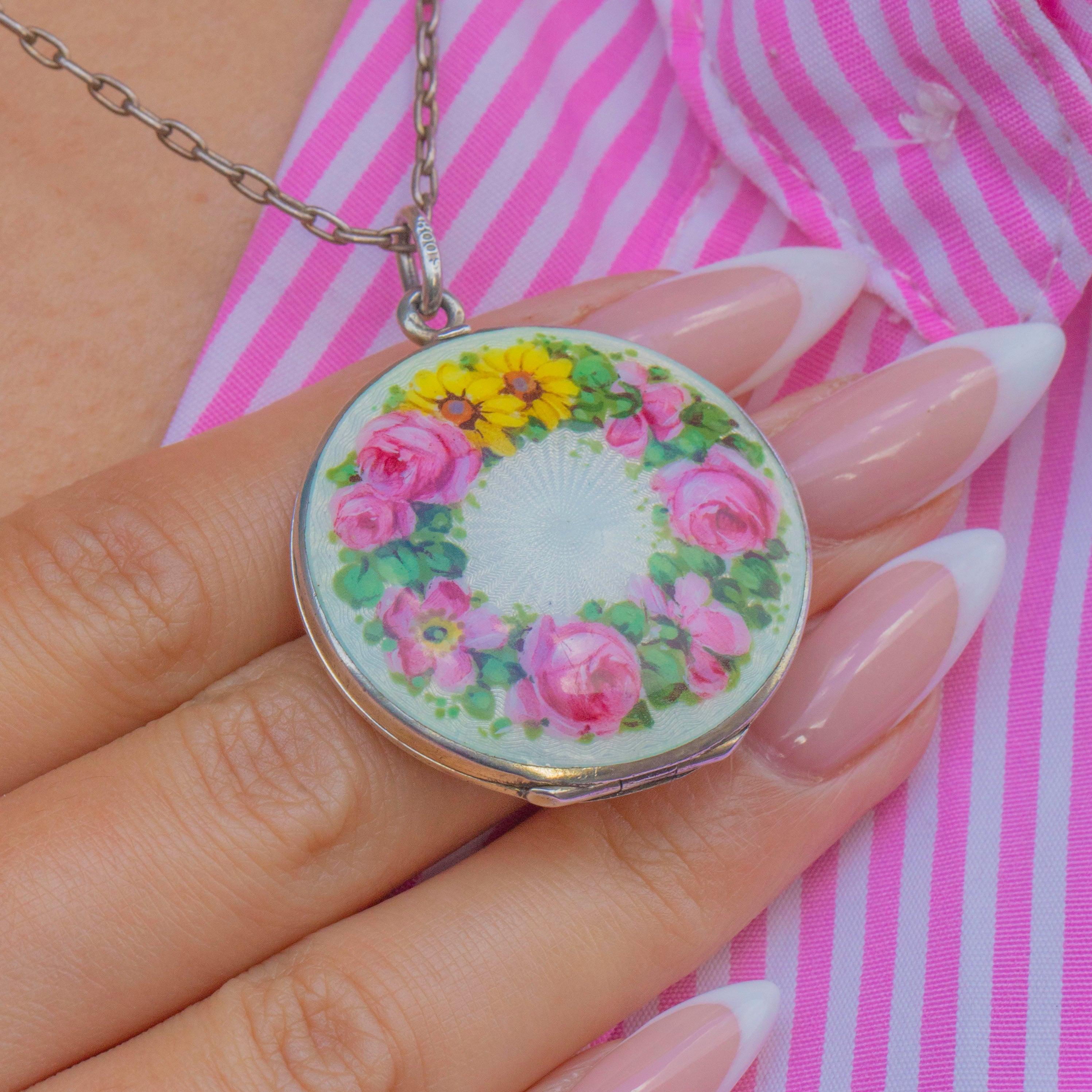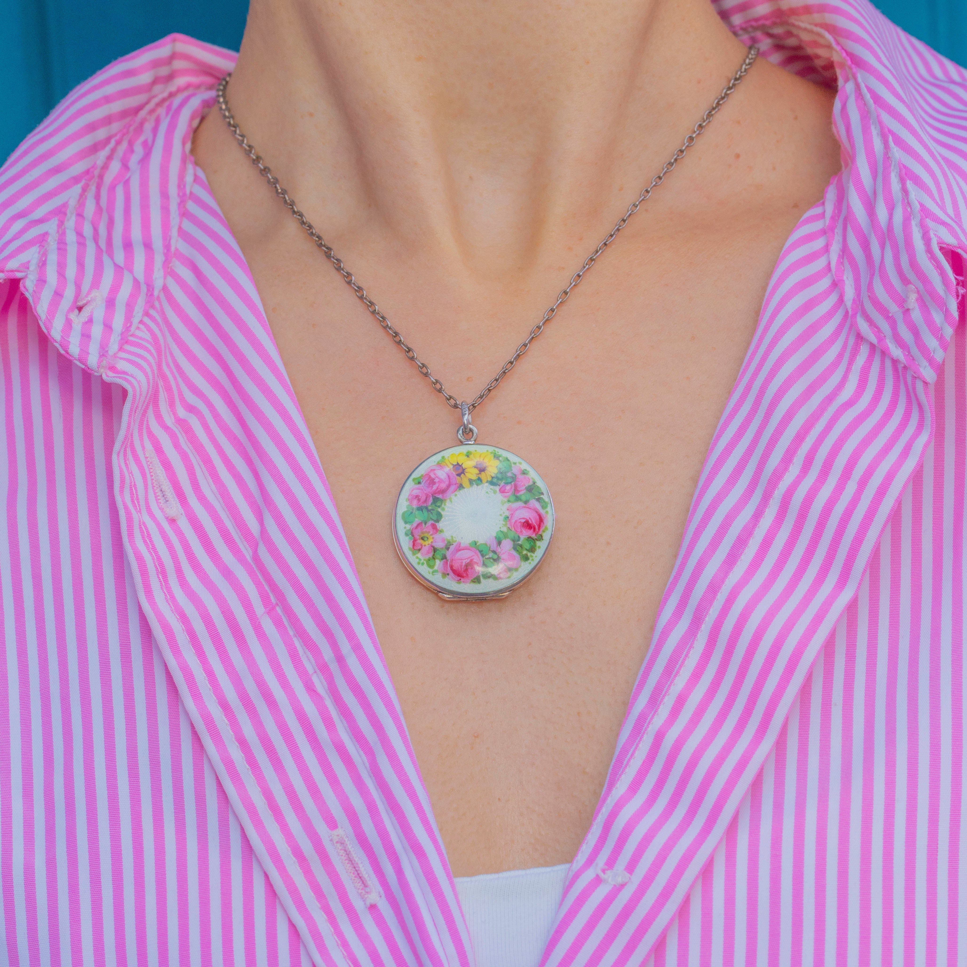 This delightful Edwardian locket is crafted in European Silver and decorated with exquisite Enamel work. The front features a vibrant guilloché Enamel ground in soft white, hand-painted with a colourful garland of flowers. Bright pink roses, cheerful yellow daisies, and fresh green leaves form a circular wreath, surrounding a radiating starburst motif at the centre.
