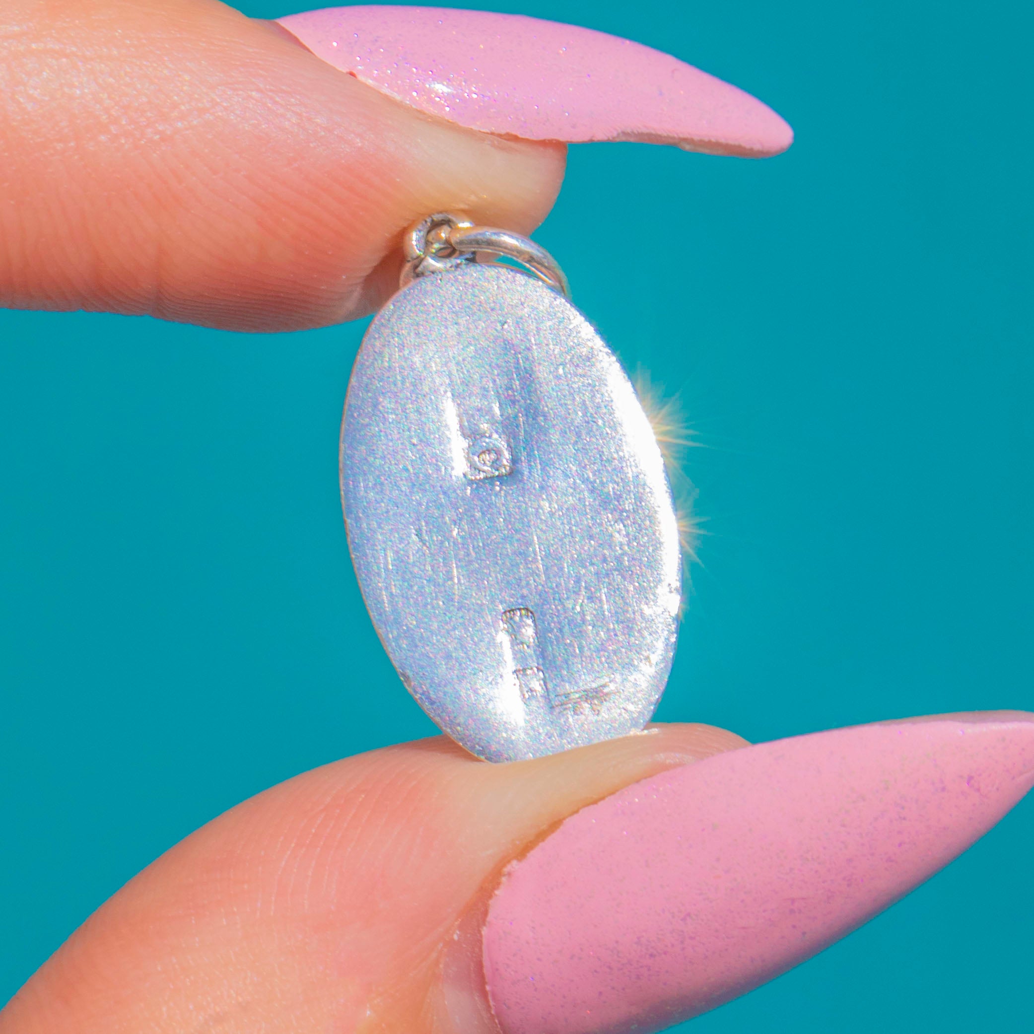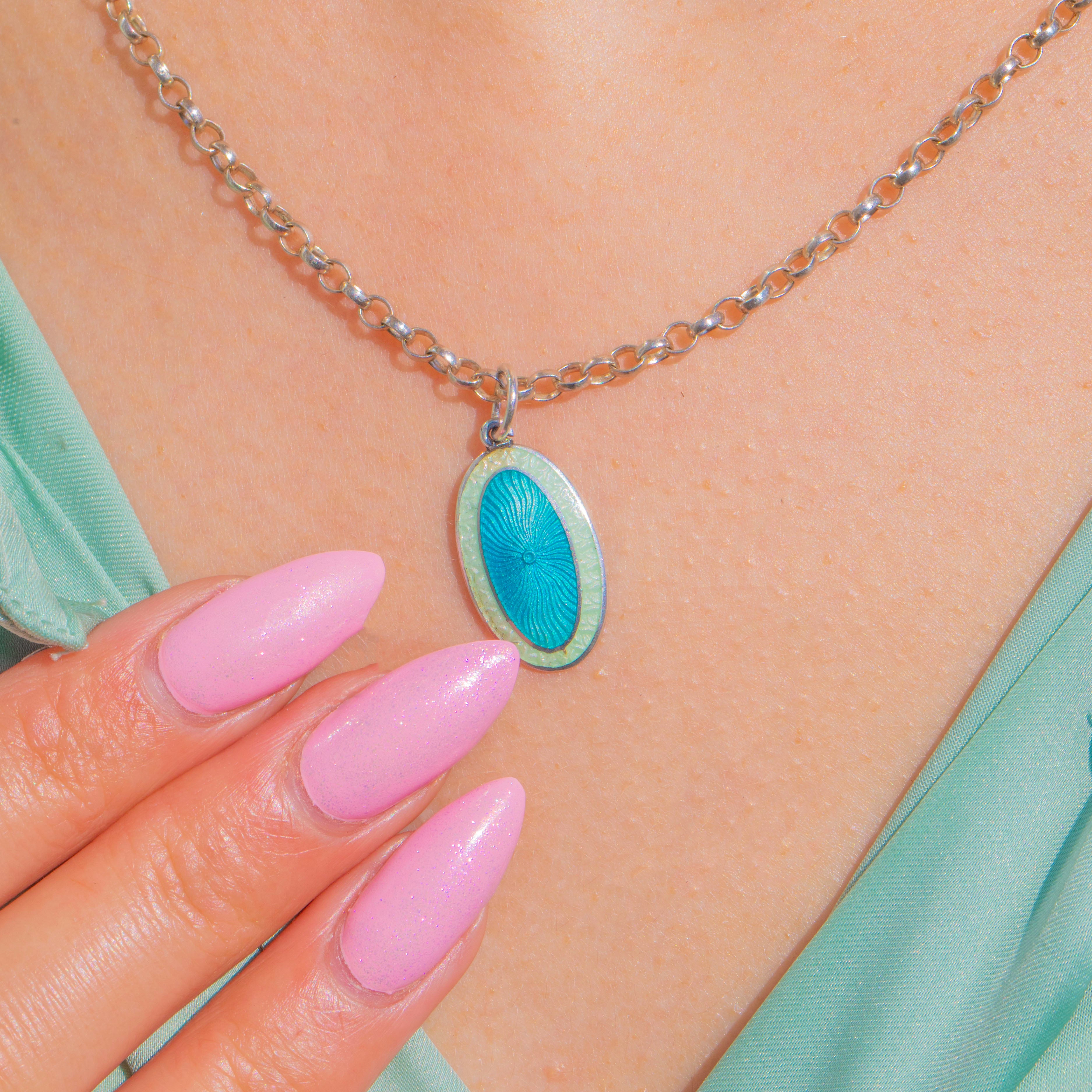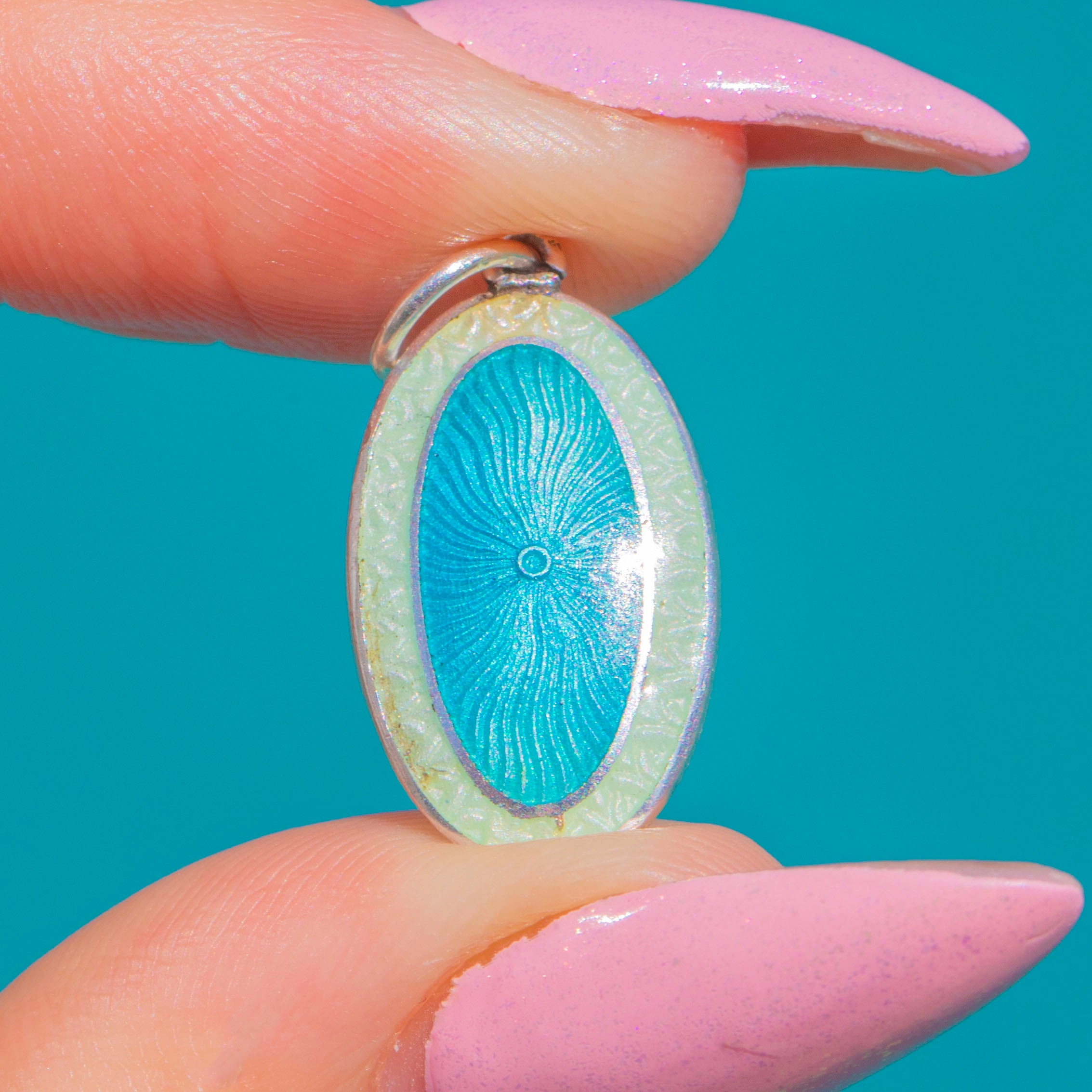 A delicate Edwardian guilloché Enamel pendant in Sterling Silver, c.1905. Its oval face shimmers with radiant Blue engine-turned Enamel, framed by a crisp White border for an elegant, fresh contrast. Refined and petite, the simple bezel and neat bale let the Enamel's luminous sunburst take centre stage.