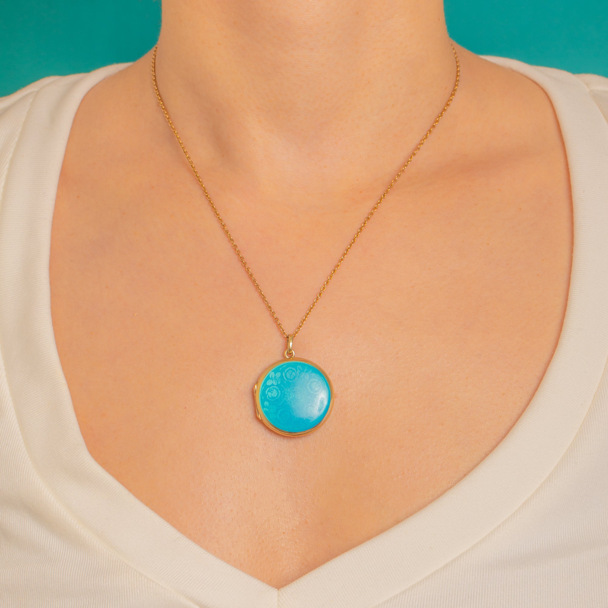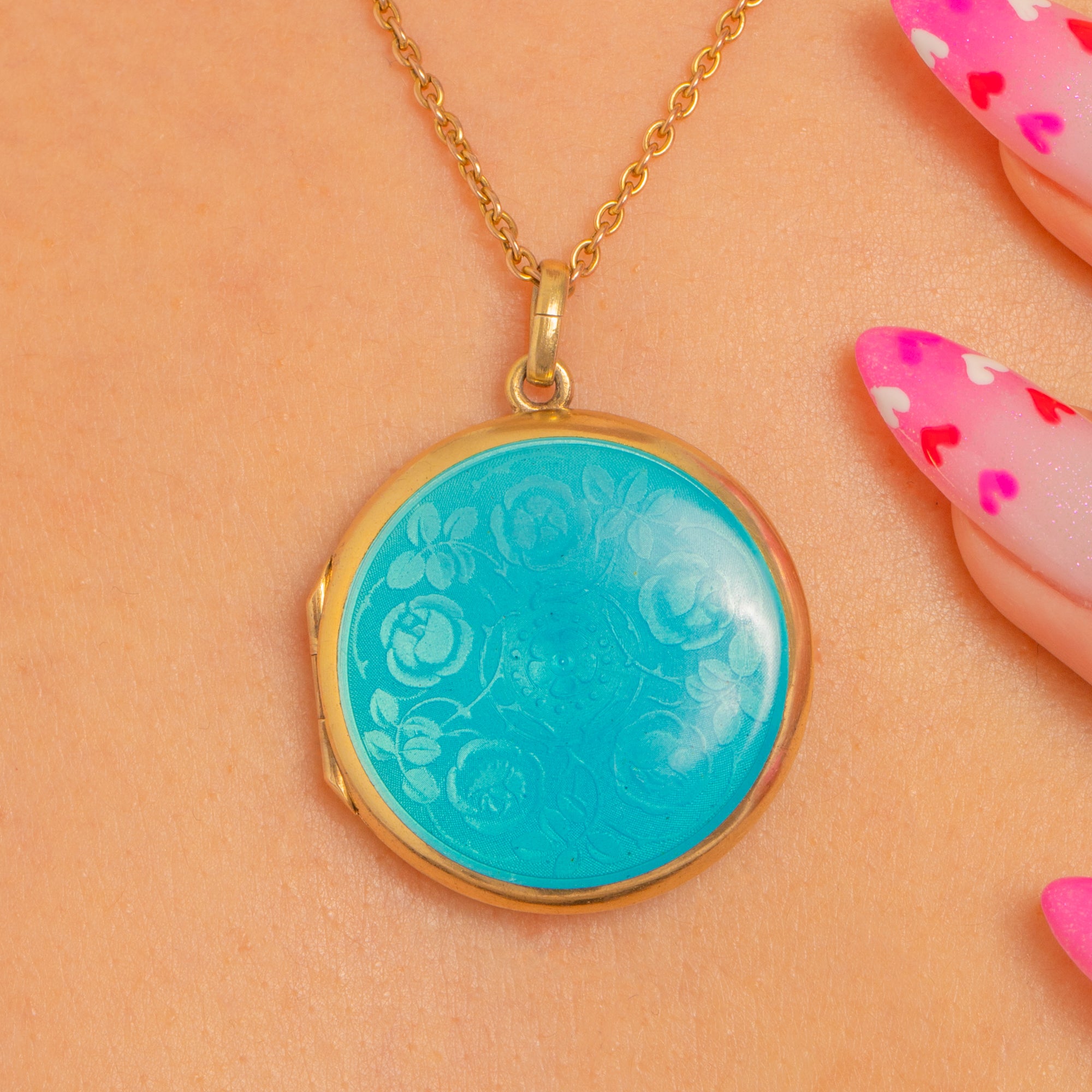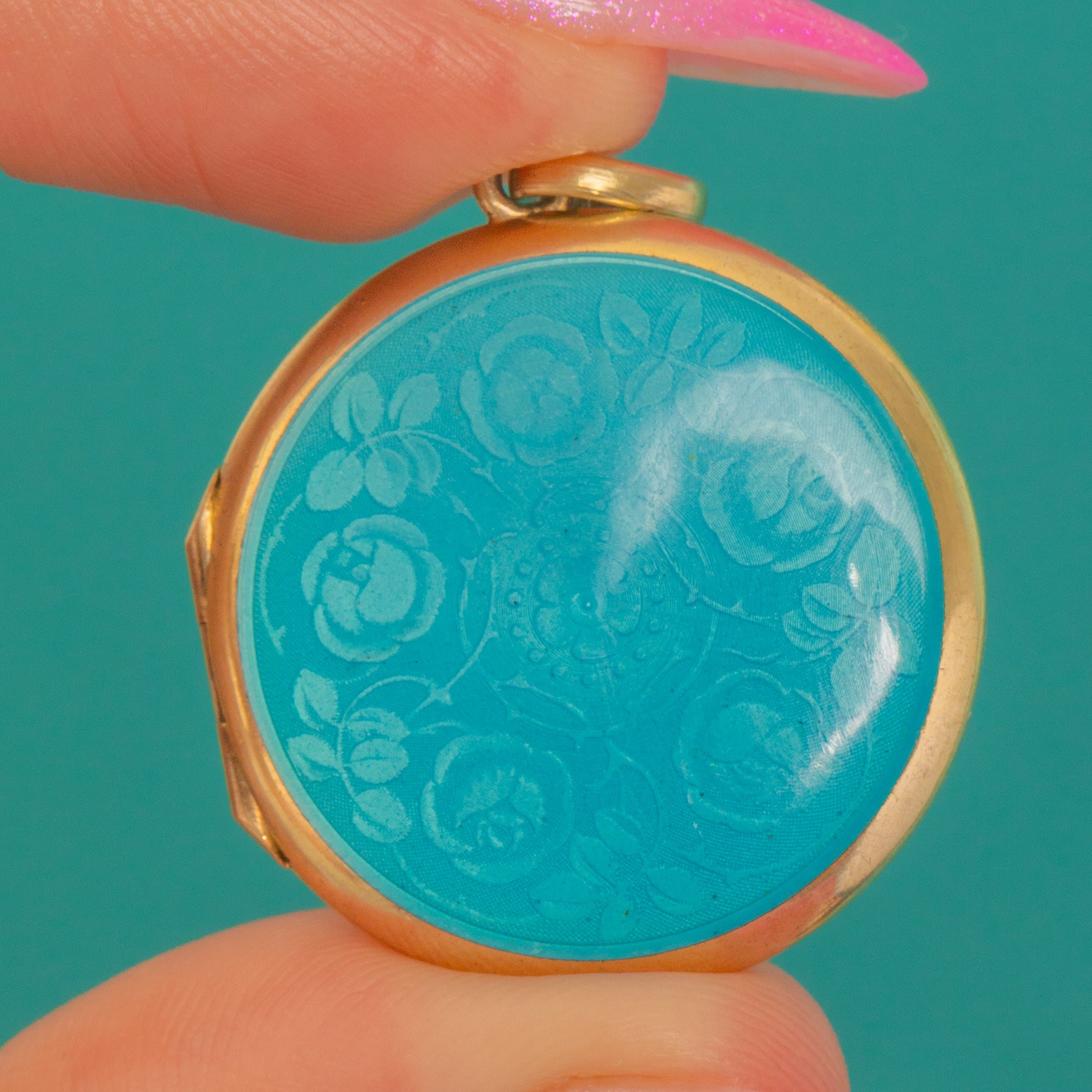A luminous Guilloché Enamel locket in gilded Sterling Silver, this pretty Edwardian treasure glows with a vivid turquoise-blue dome of translucent Enamel over an engine-turned ground. A central rosette and delicate foliate motifs radiate beneath the glassy surface, catching the light with every movement while the warm gilded bezel frames the colour beautifully.