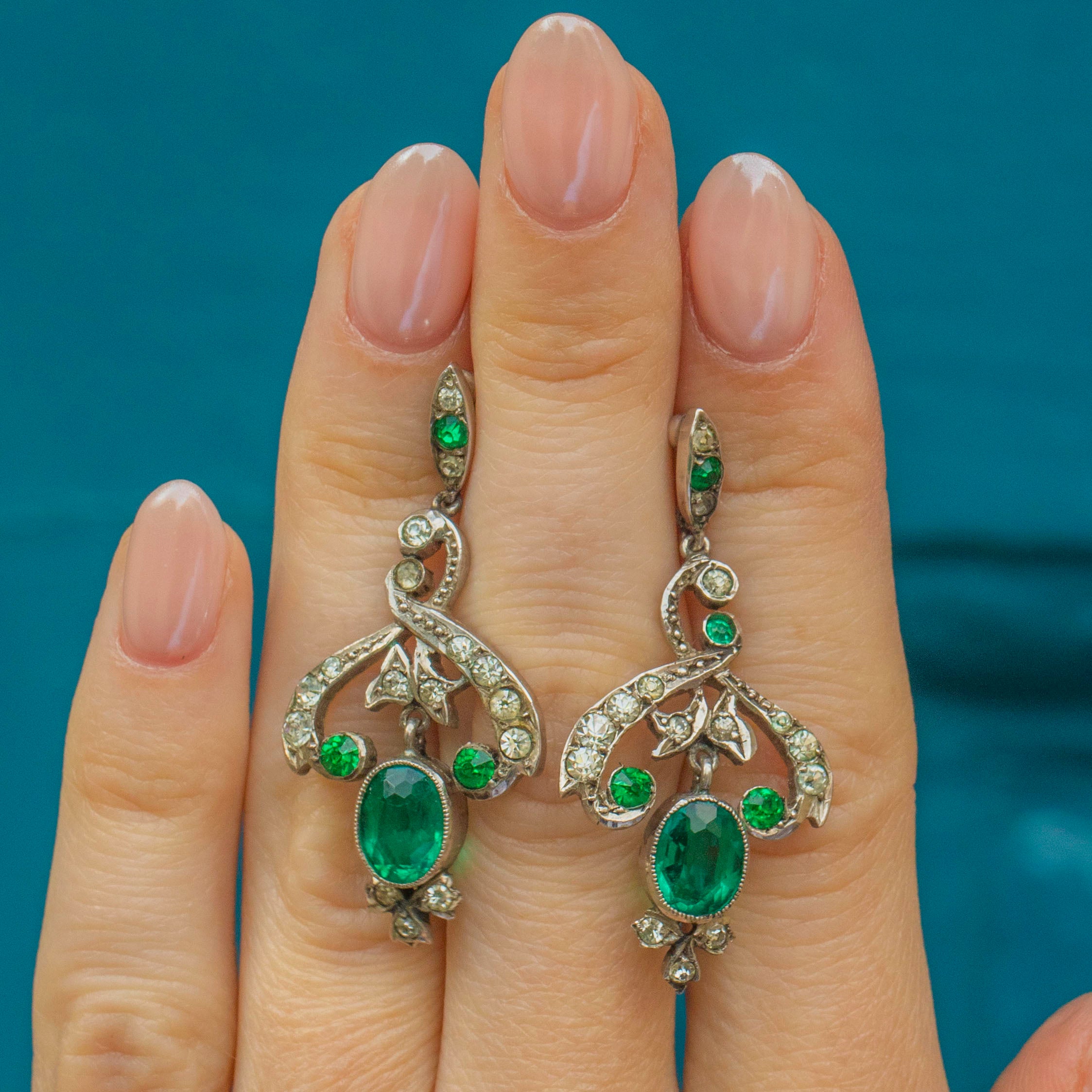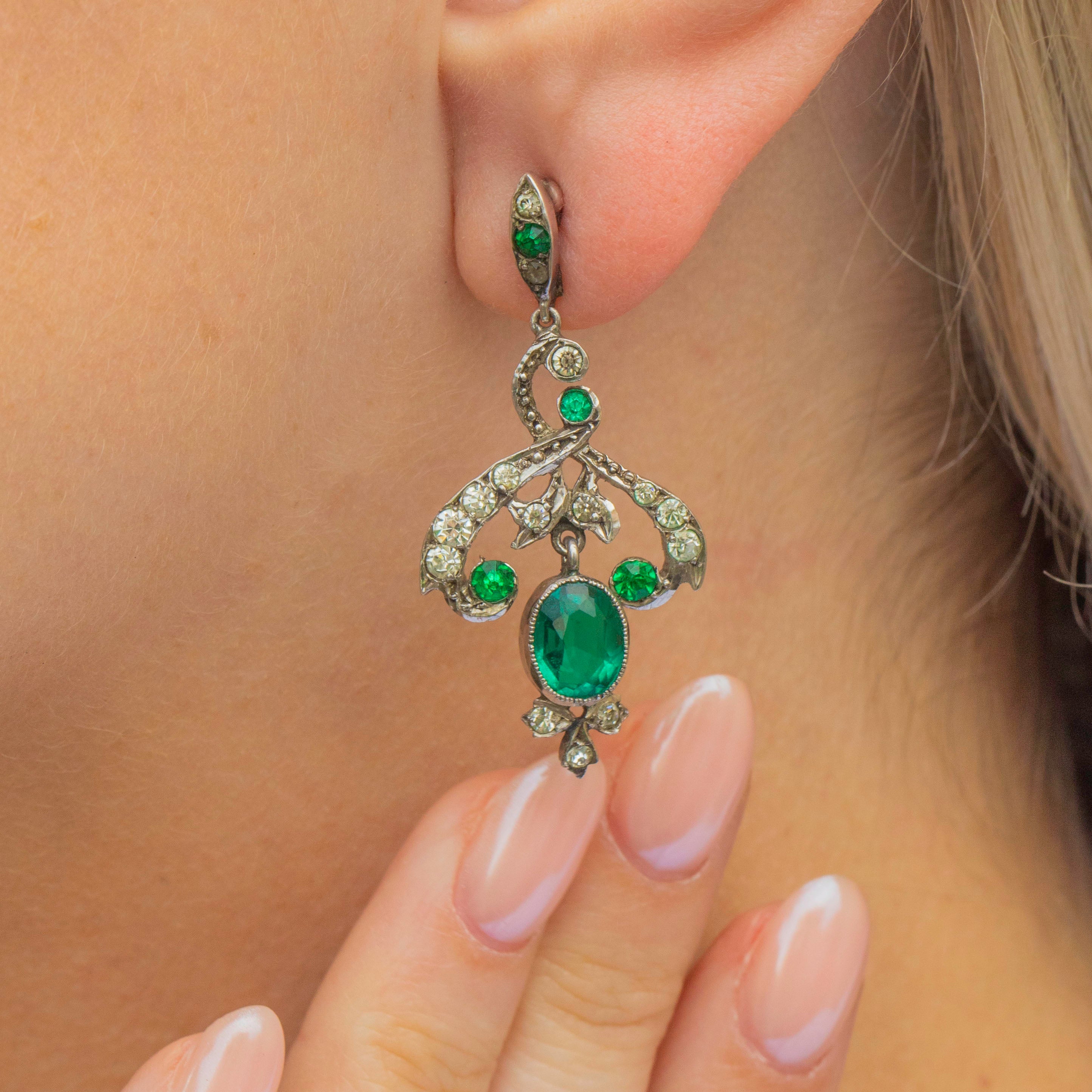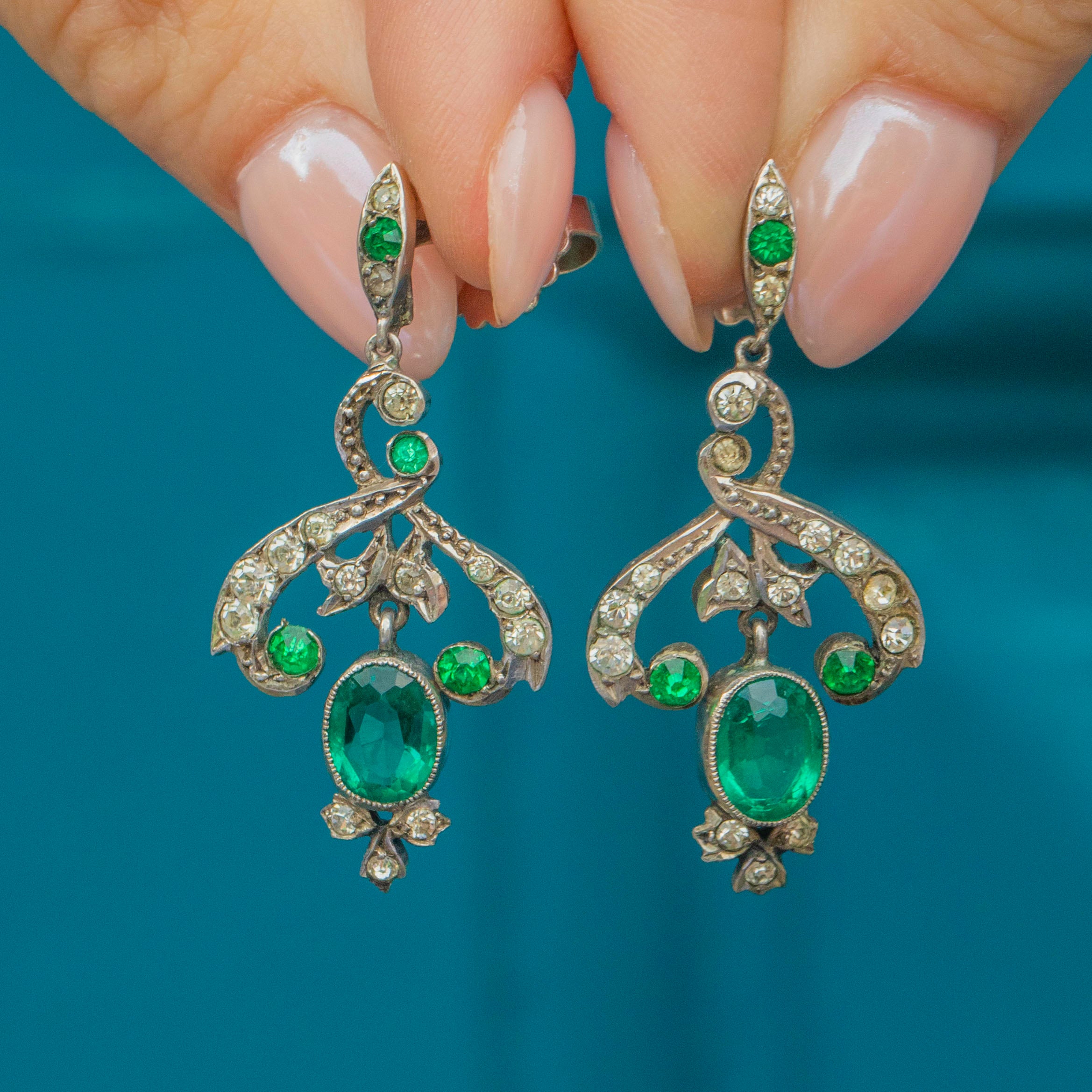 These Edwardian Silver Green Paste drop earrings are spectacular! Featuring delightfully bright green Emerald Paste and white Diamond Paste, these antique earrings are sublime.