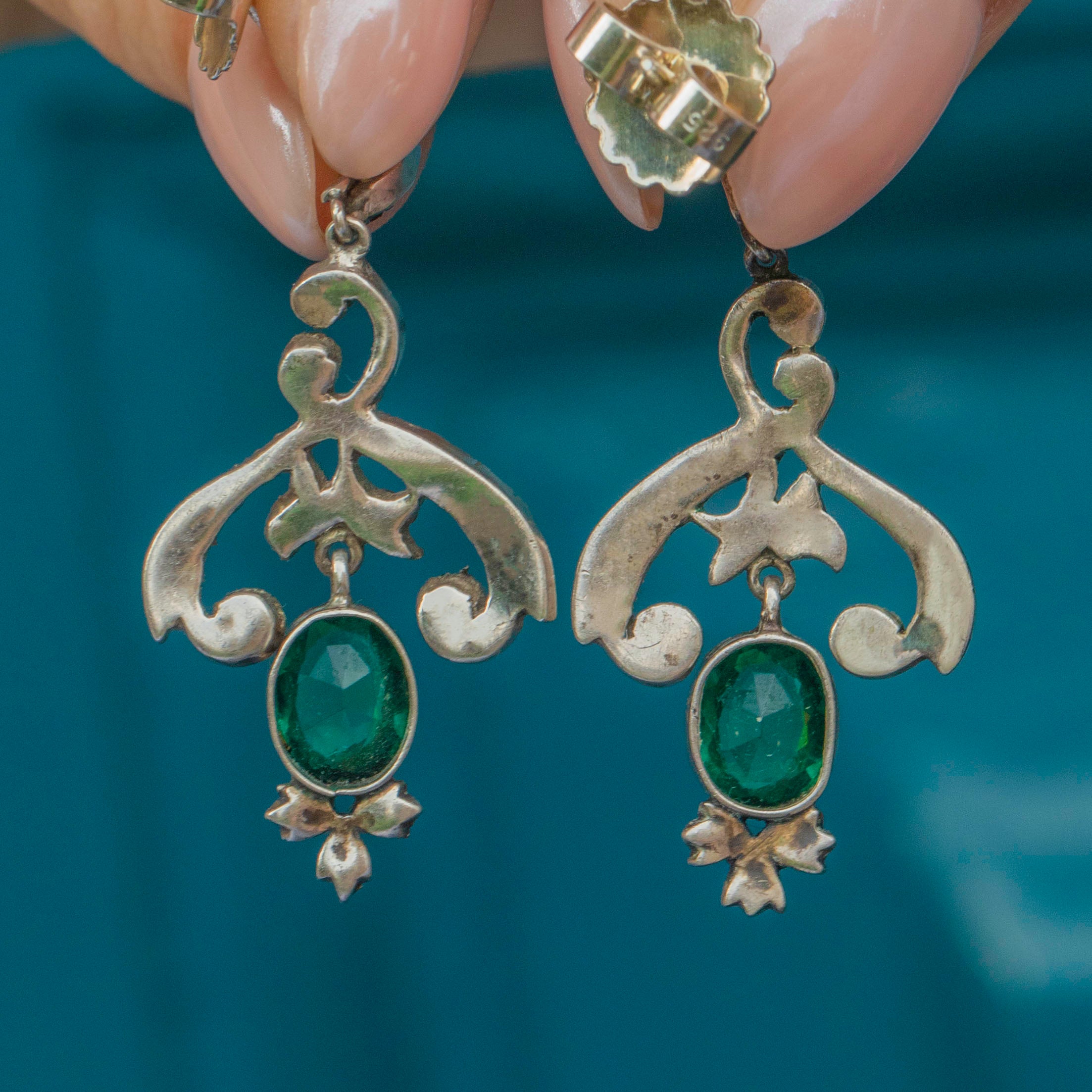 EXCELLENT. These Edwardian Silver Green Paste drop earrings are in excellent condition. All of the vivid Paste gems are set securely in their settings, with no major signs of chips or scratches to their body. Her Silver has accrued a gorgeous patina over the years which adds to her eccentric antique charm.