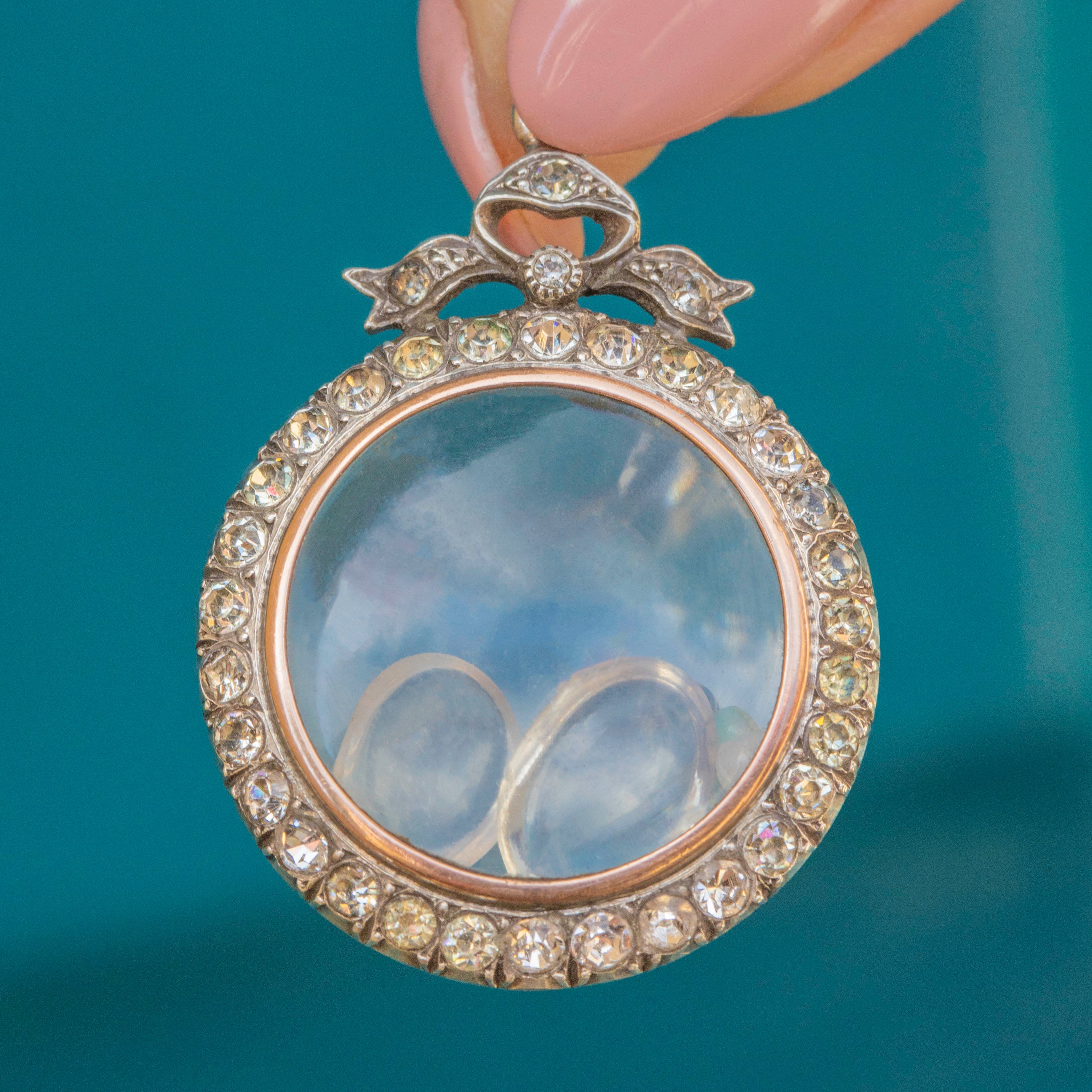 VERY GOOD This Edwardian Silver Paste Shaker Locket is in very good condition. The Paste gemstones are all secure and although a few may have lost a little lustre, they still provide a wonderful display of sparkle. There are one or two scuffs on the original Glass pane but this is commensurate with age and doesn't take away from her charm! The hinged back frame is in perfect working condition, securely holding the locket's contents. The bow detailing is firmly affixed and with her chunky jump-ring, you can wear this Edwardian locket with confidence!