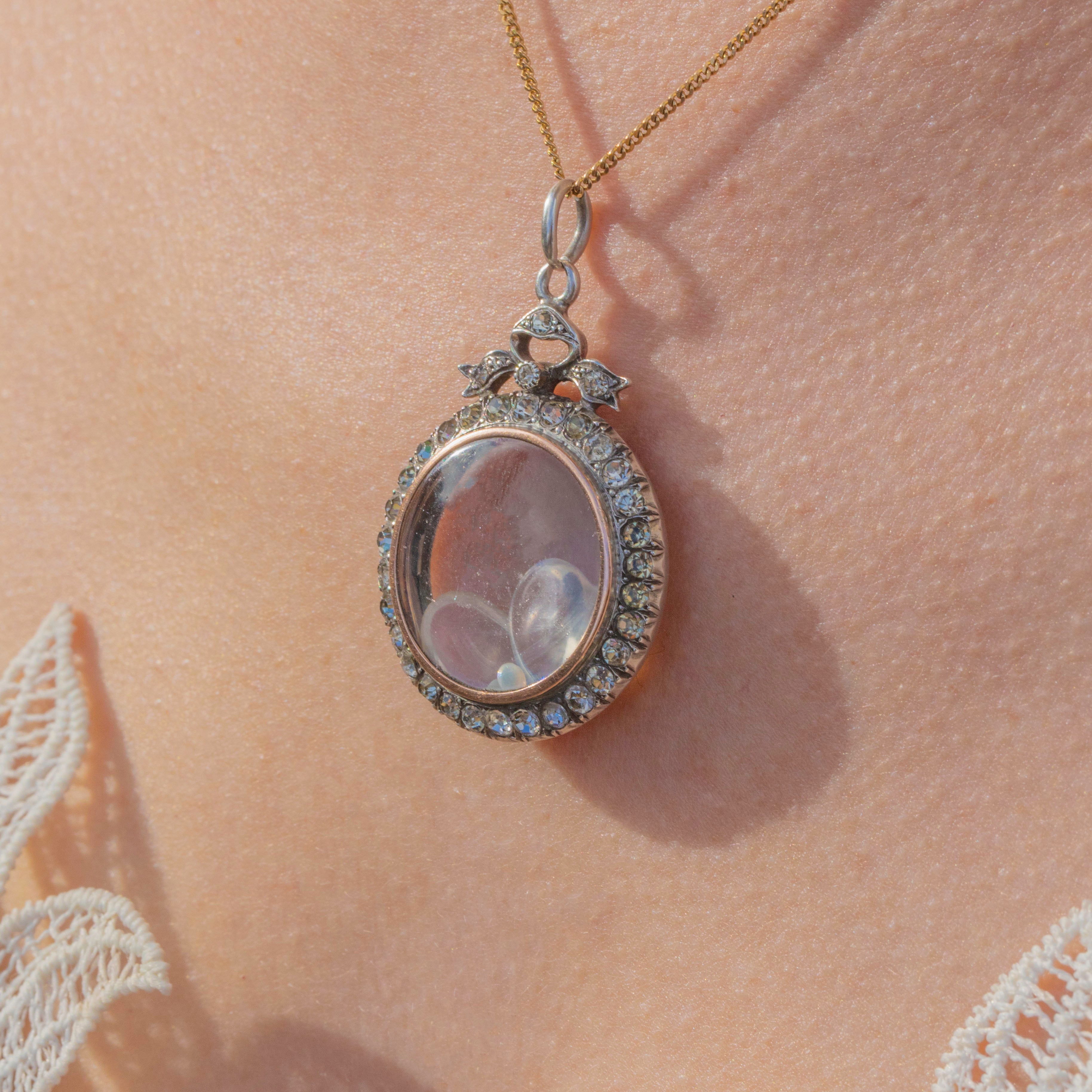 This pretty Paste locket is topped with an embellished bow bale, giving her bundles of Edwardian charm! Oozing femininity, this antique Silver locket is a timeless piece of Edwardian jewellery, ready to be worn straight from her pink Lillicoco box!