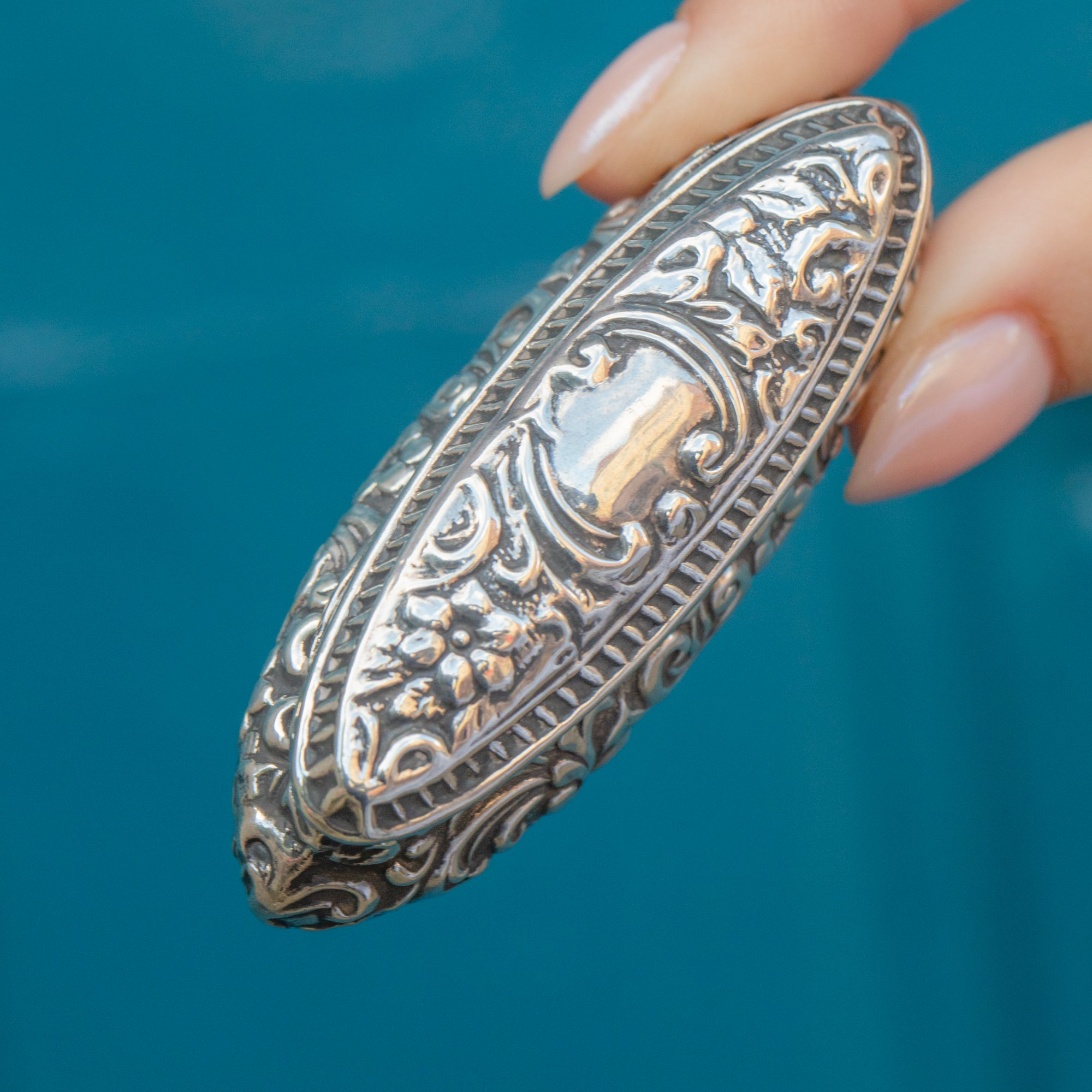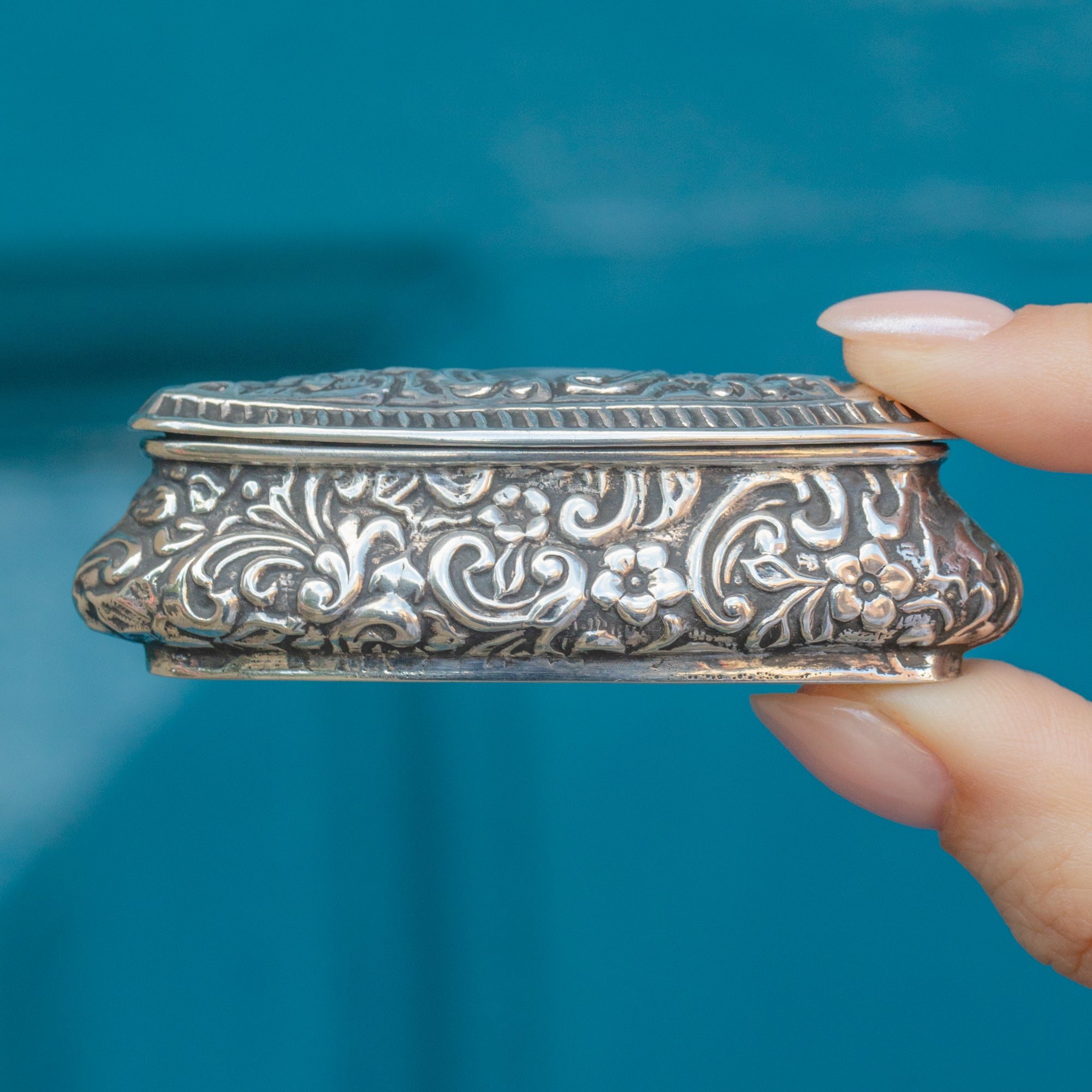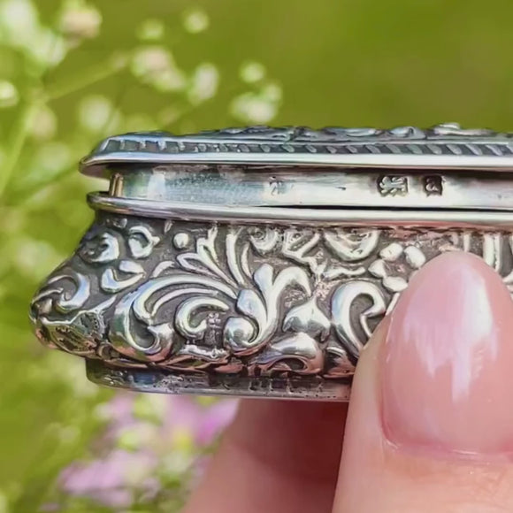 We are swooning over this Edwardian Silver repoussé ring box. Crafted from an impressive 22 grams of solid Sterling Silver, the entirety of this striking piece is adorned with floral repoussé detailing.