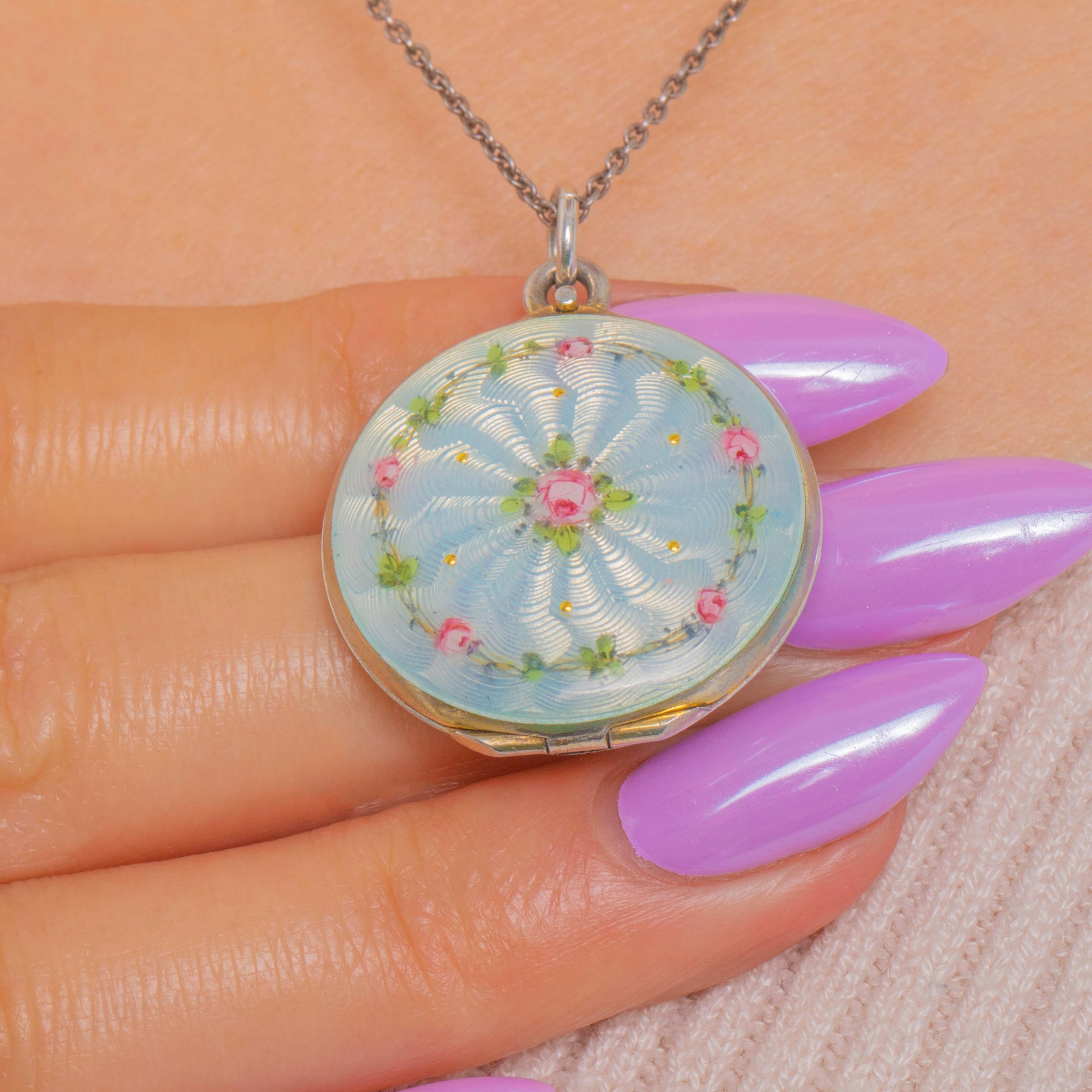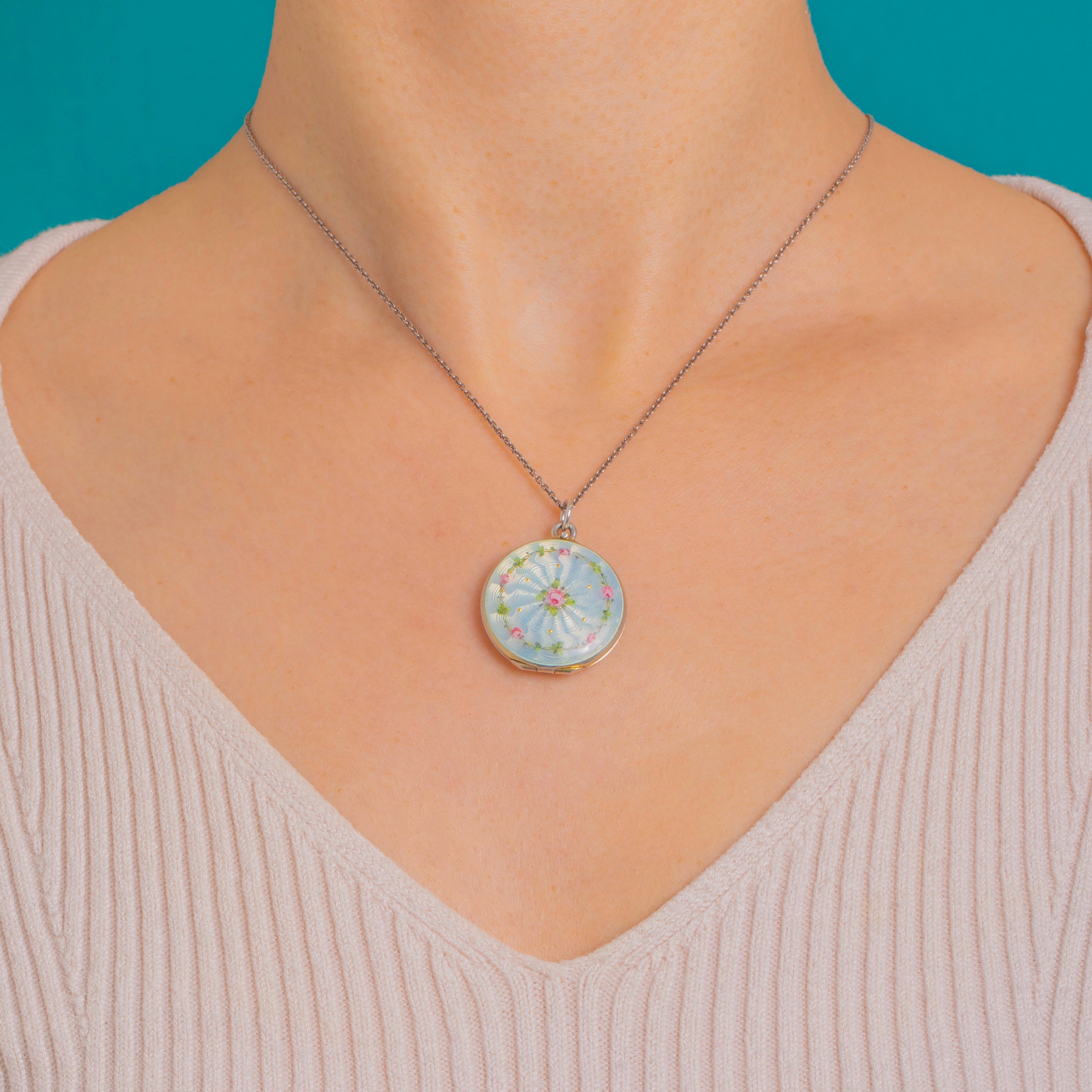 Edwardian Sky Blue Enamel Guilloche Locket with Roses