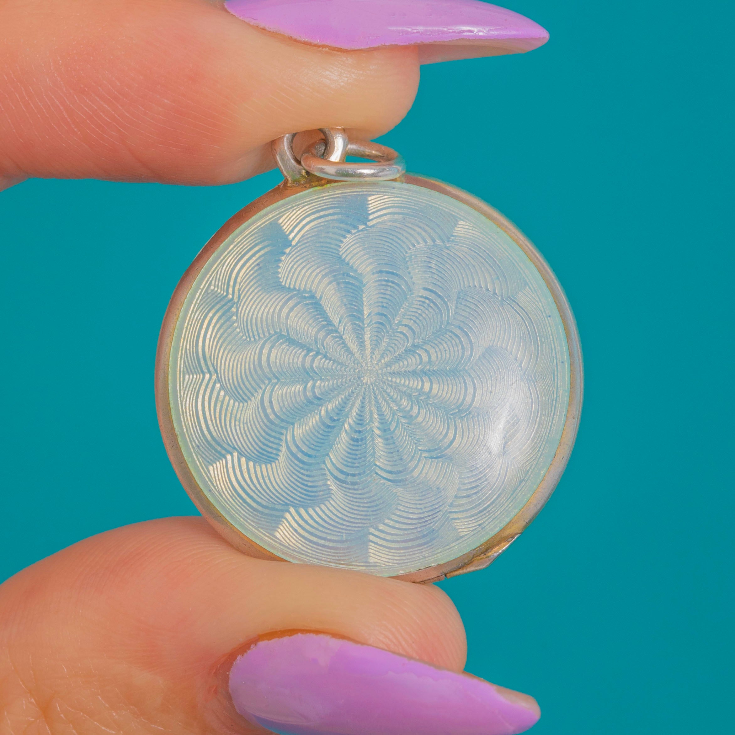 A delicate Edwardian locket painted with a wreath of tiny pink rosebuds dances over a luminous sky-blue guilloché ground. The translucent Enamel shimmers with radiating engine-turned waves beneath, punctuated by minute gold-tone pin-dots and a central rosette for a charming, romantic finish.