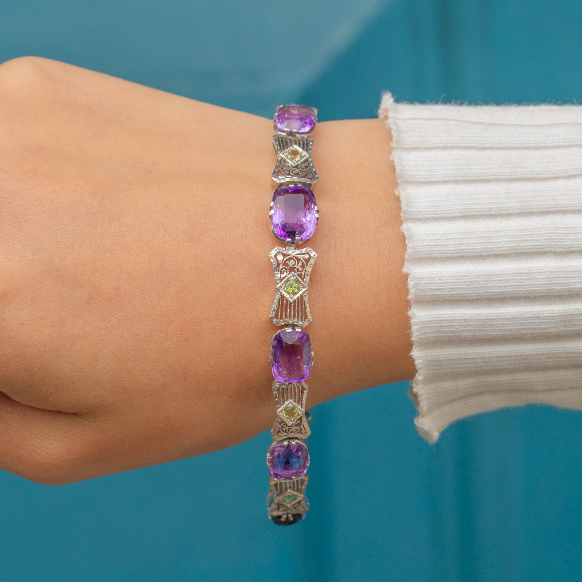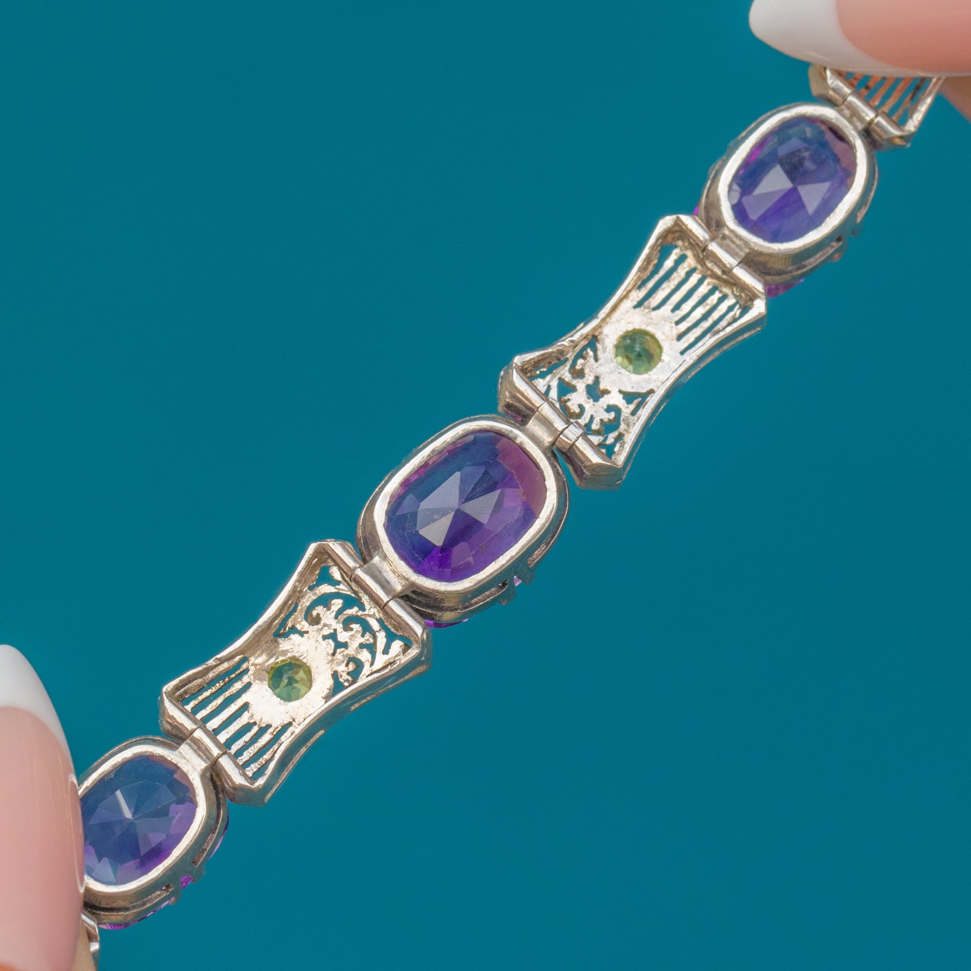 VERY GOOD. The Amethysts are vibrant and securely set with no damage. Peridots are well preserved and bright. Some wear to the Silver in keeping with age, but the detailing remains crisp. The clasp closes securely and functions perfectly. A charming Edwardian bracelet with wonderful colour and historical meaning.