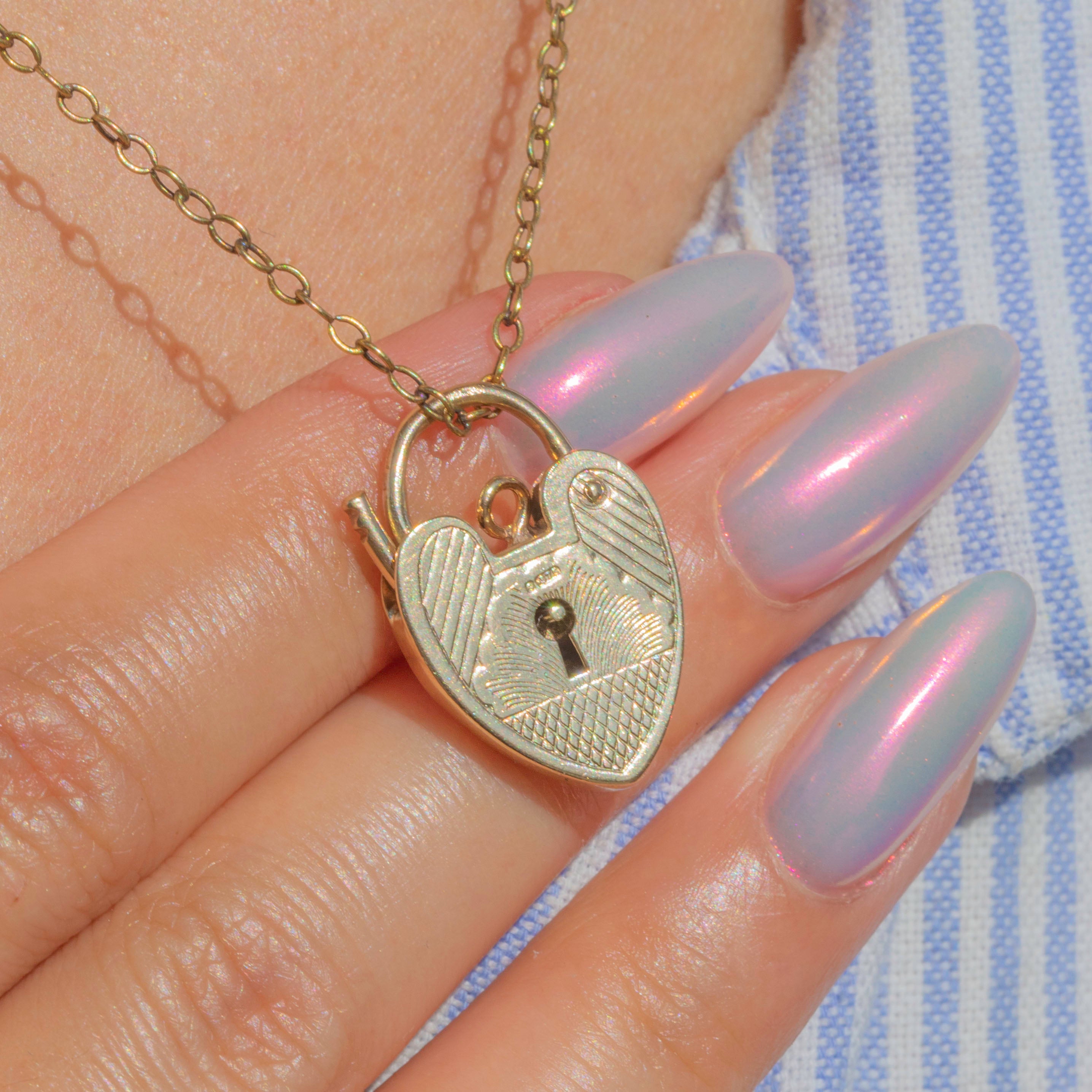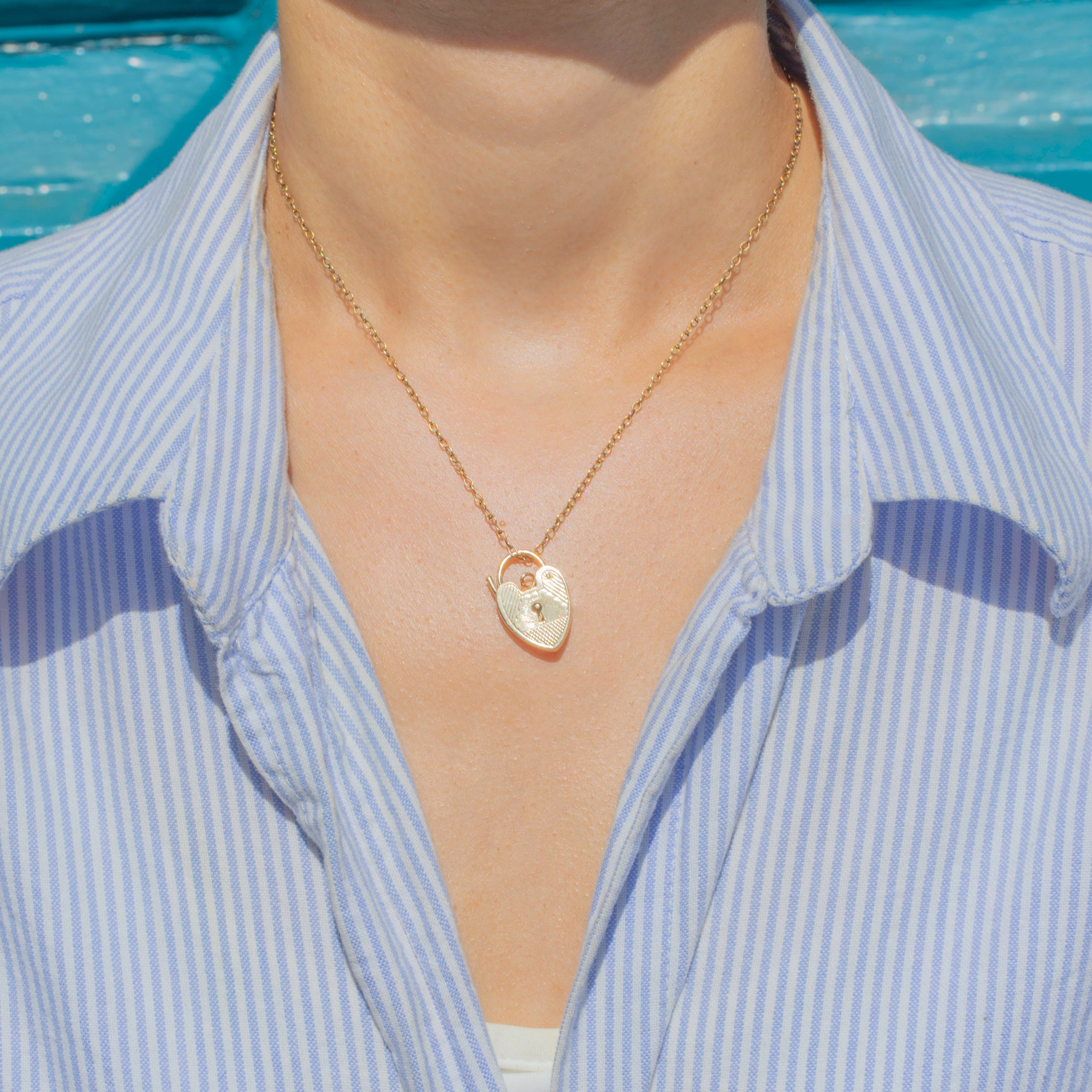 This English 9ct Gold engraved scallop heart padlock pendant is a charming piece! Undeniably romantic, not only is she heart-shaped, but she also flaunts a beautifully honeydew hue, which will bring ample warmth to your attire.