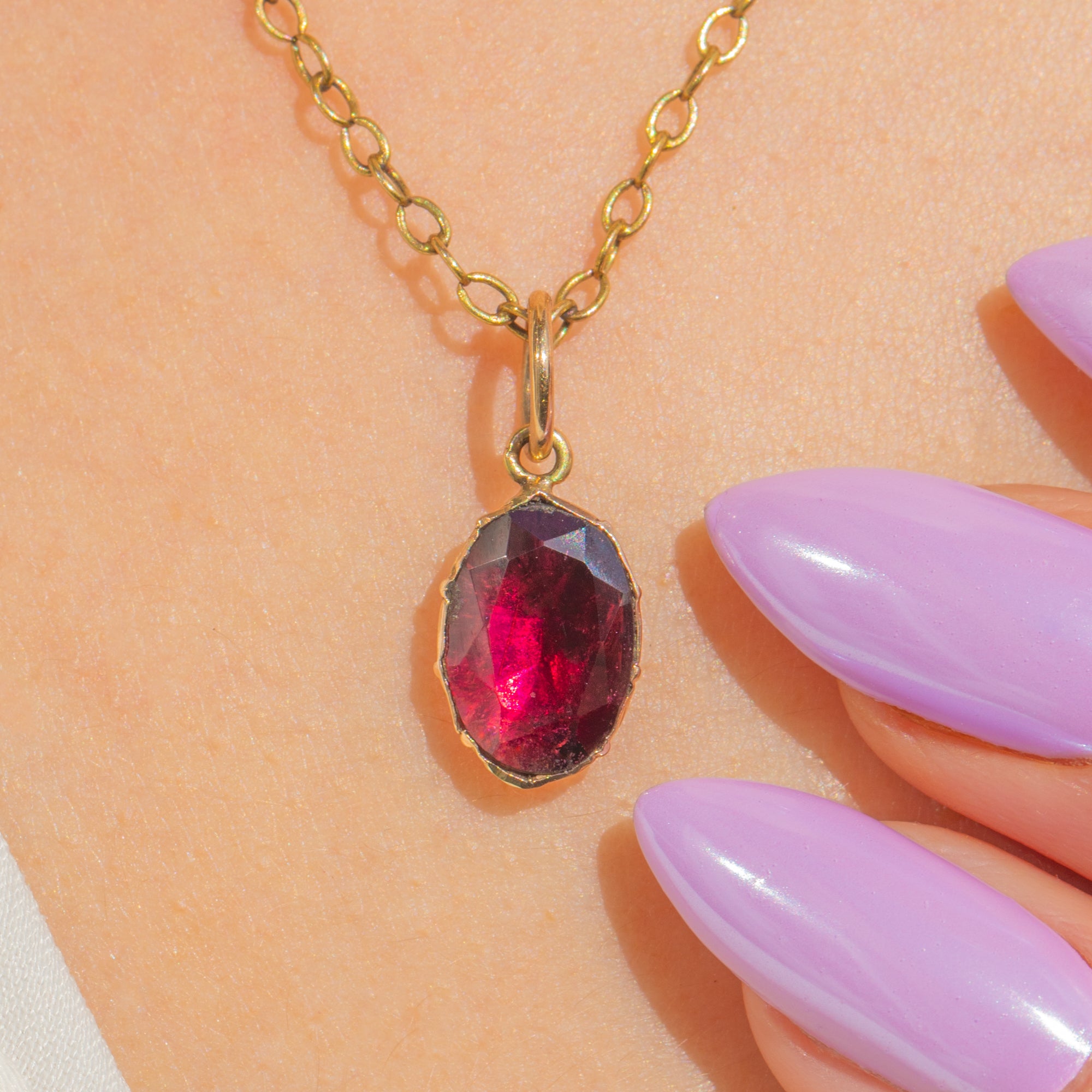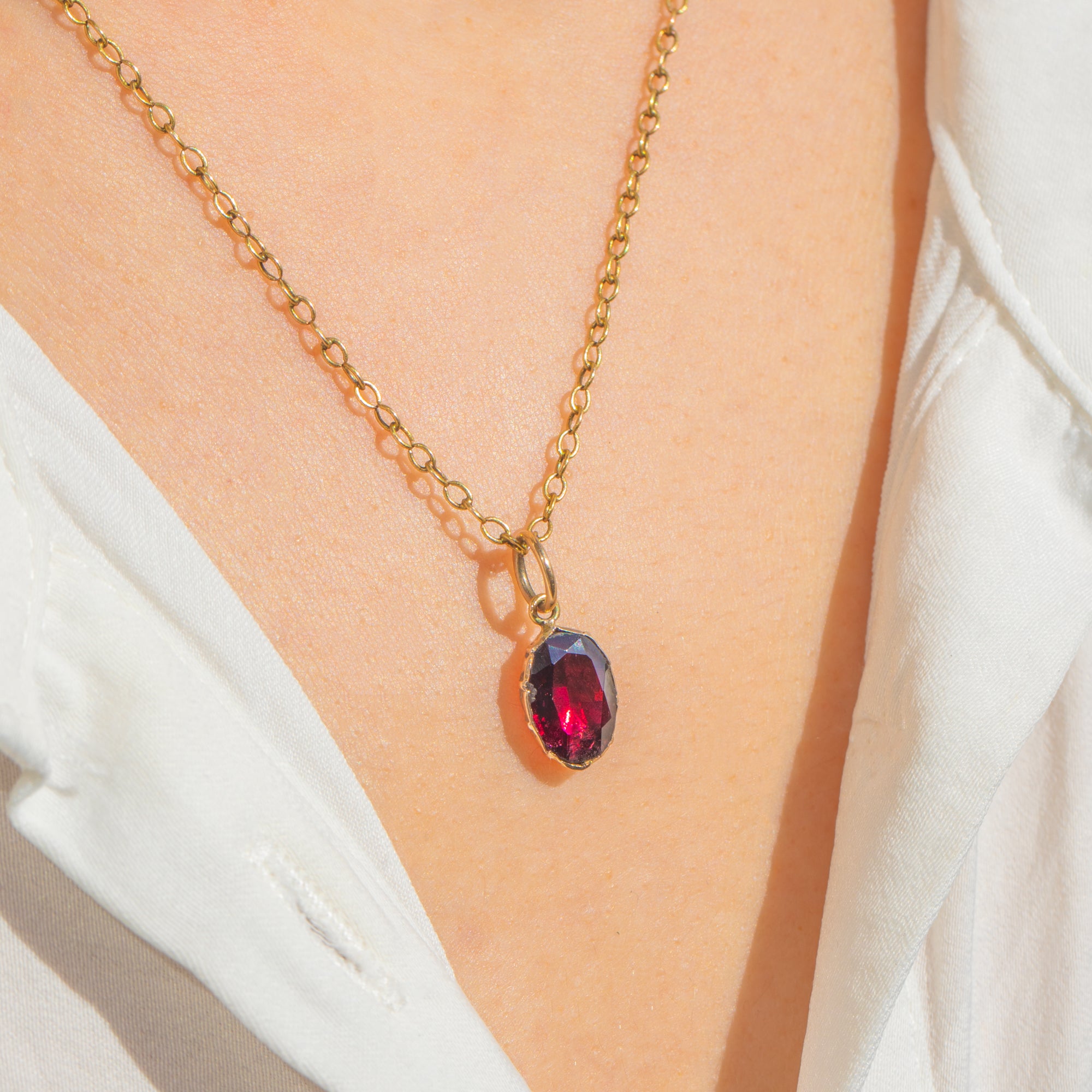 Rich, rosy Gold and the deep, velvety hue of the Garnet make a timeless pairing, offering an elegant whisper of colour that layers beautifully or shines on its own. Refined, feminine, and steeped in antique charm.
