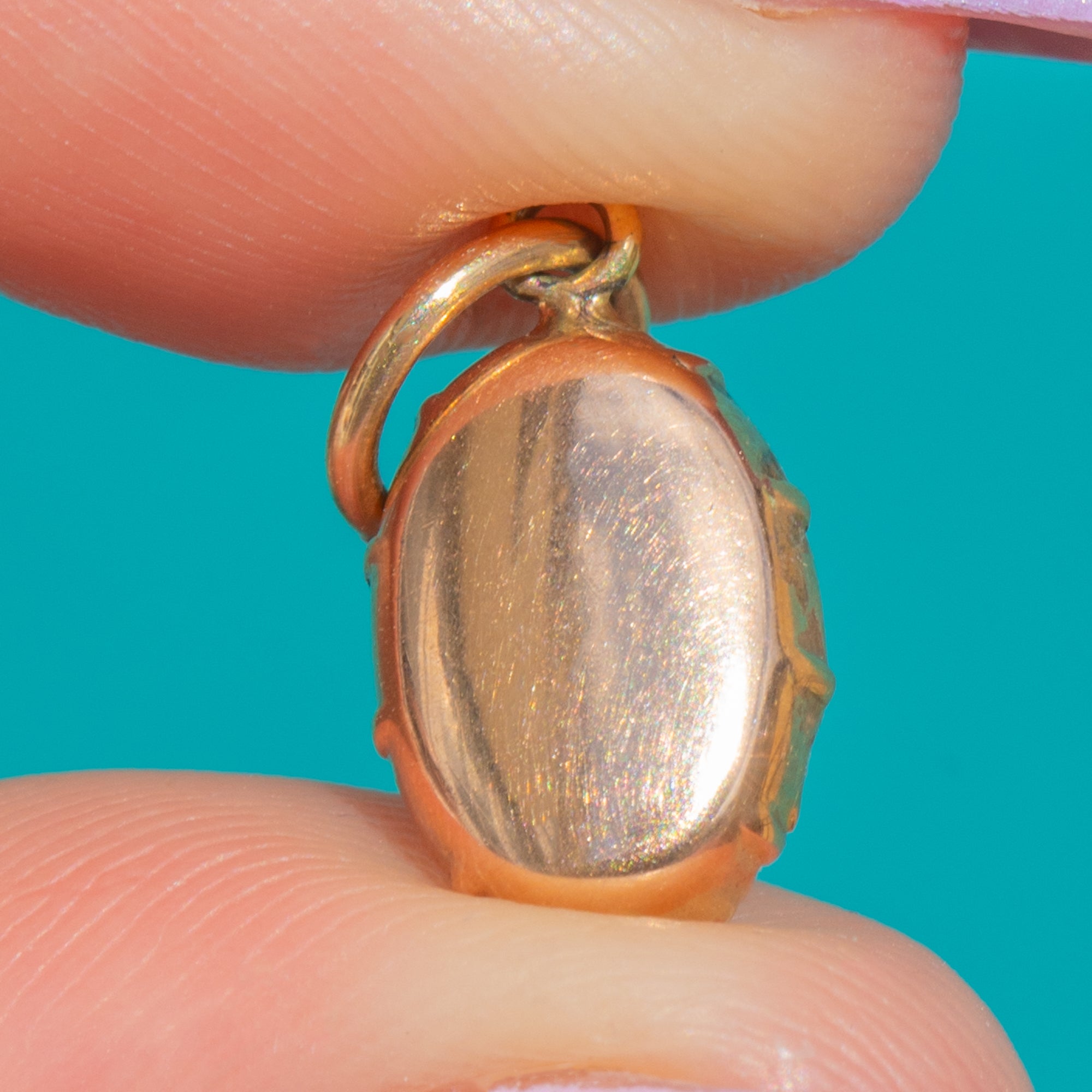 A romantic Georgian treasure, this petite flat-cut Garnet charm glows with luscious berry-red colour enhanced by its original foiling. The oval stone is cradled in a closed-back 9ct Gold collet with a delicately scalloped edge and finished with a neat jump ring for effortless wear.
