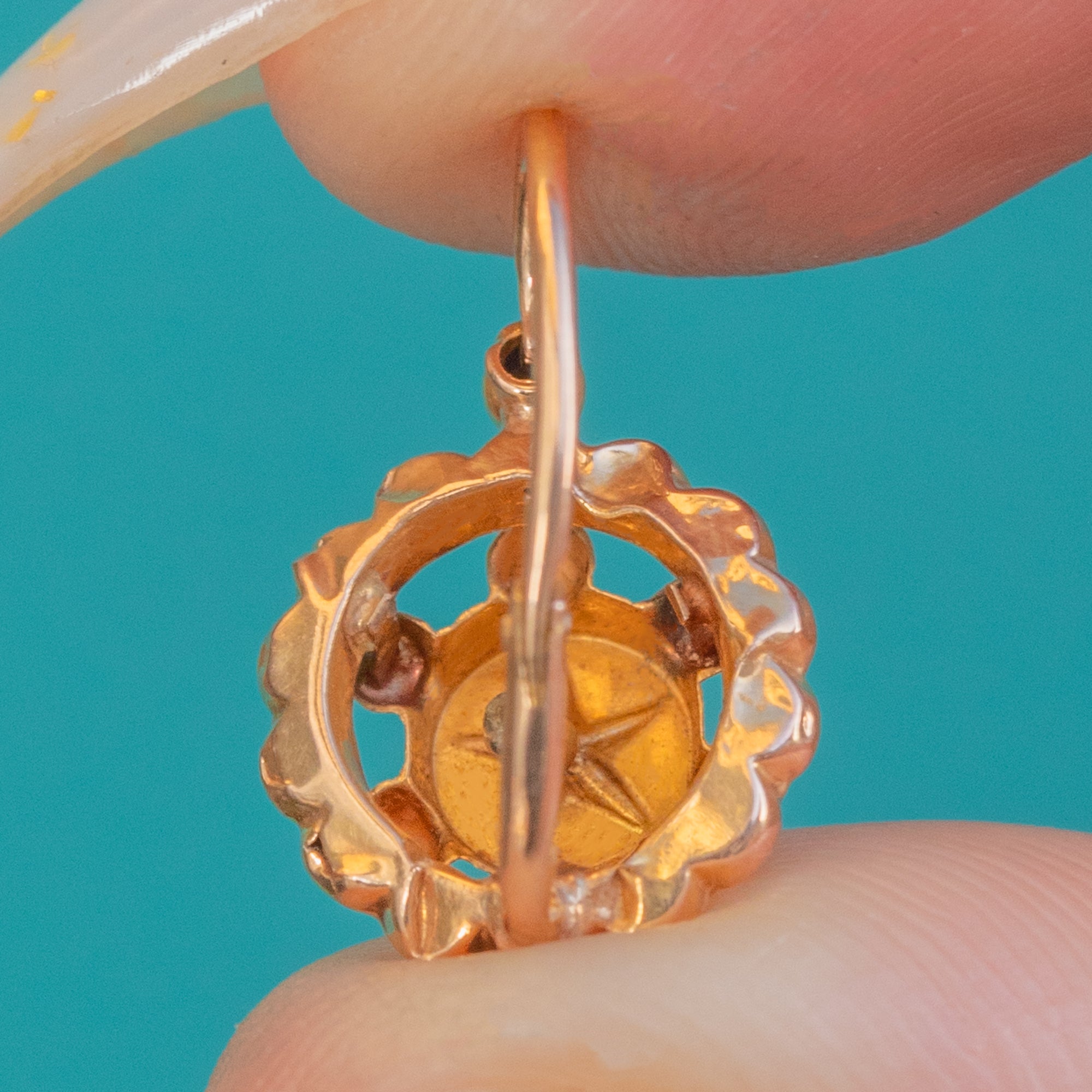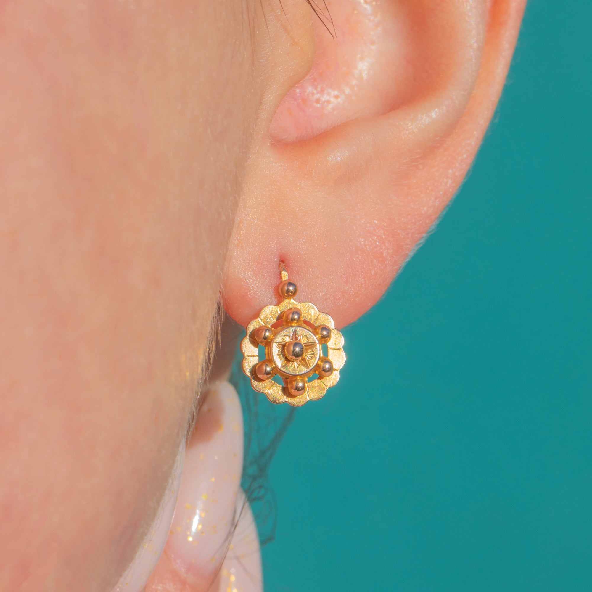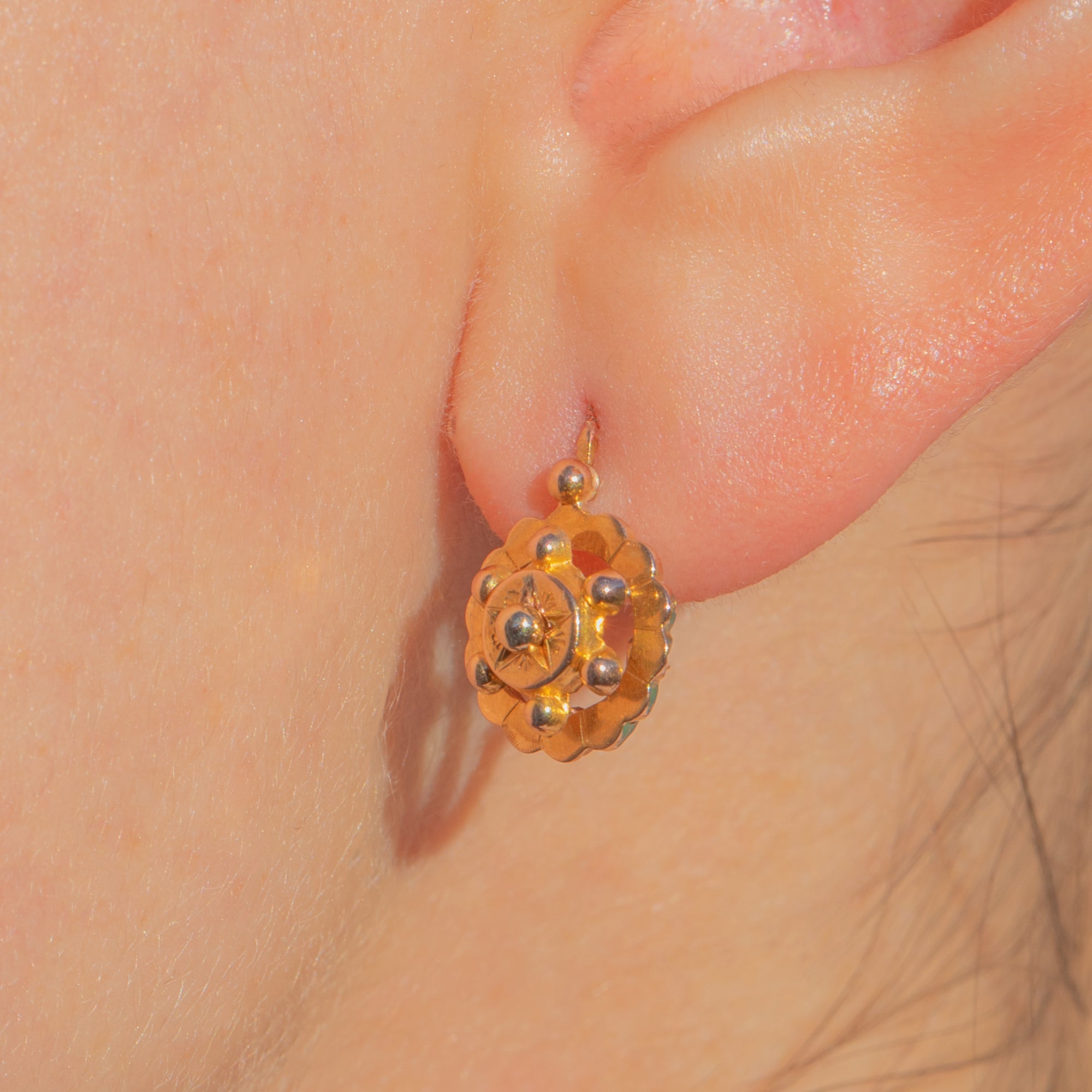 A charming pair of Victorian earrings in the ever-popular Etruscan revival style, rich with antique texture and intricate Gold beadwork. Each drop features a scalloped halo framing a central engraved starburst, dotted with polished bead accents for a beautifully dimensional look.