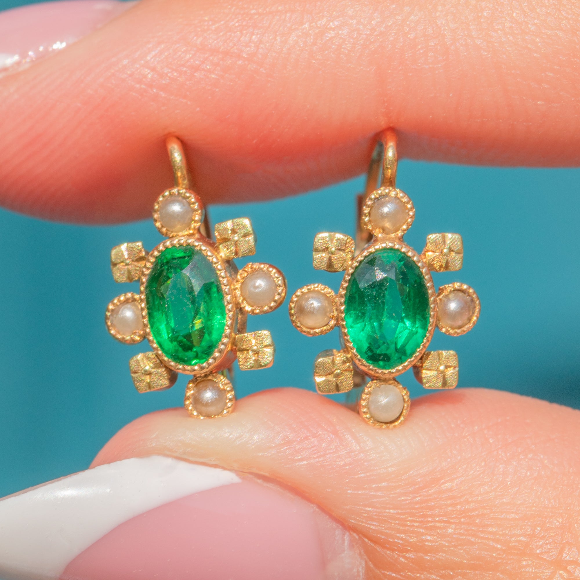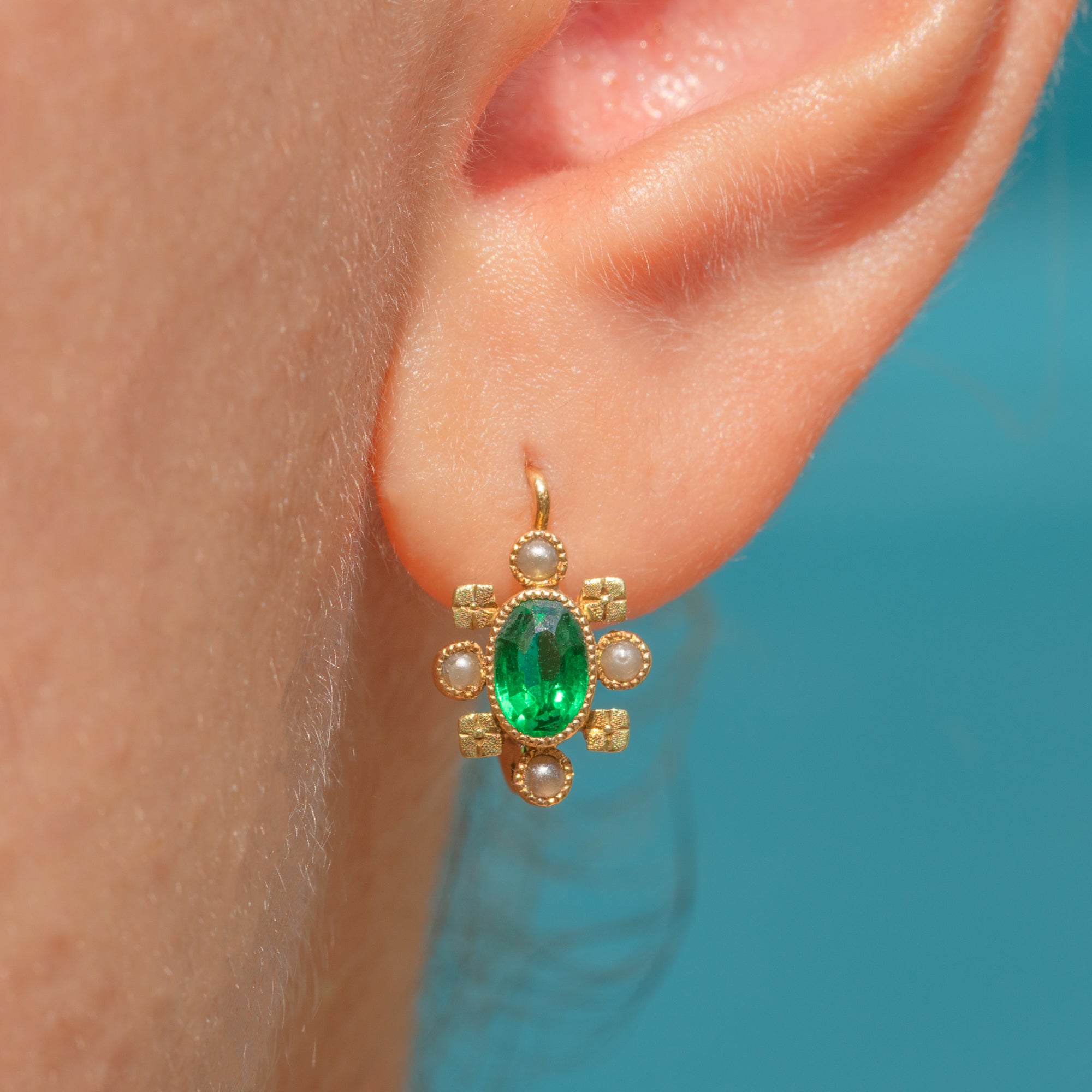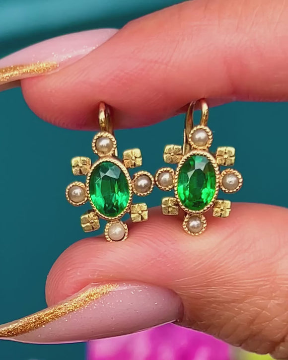 These Belle Époque earrings are a refined example of early 20th-century French design, crafted in 18ct Gold with elegant lever-back clasps. Each earring features a luminous central green Paste, encircled by lustrous Pearls and complete with ornate floral motifs.