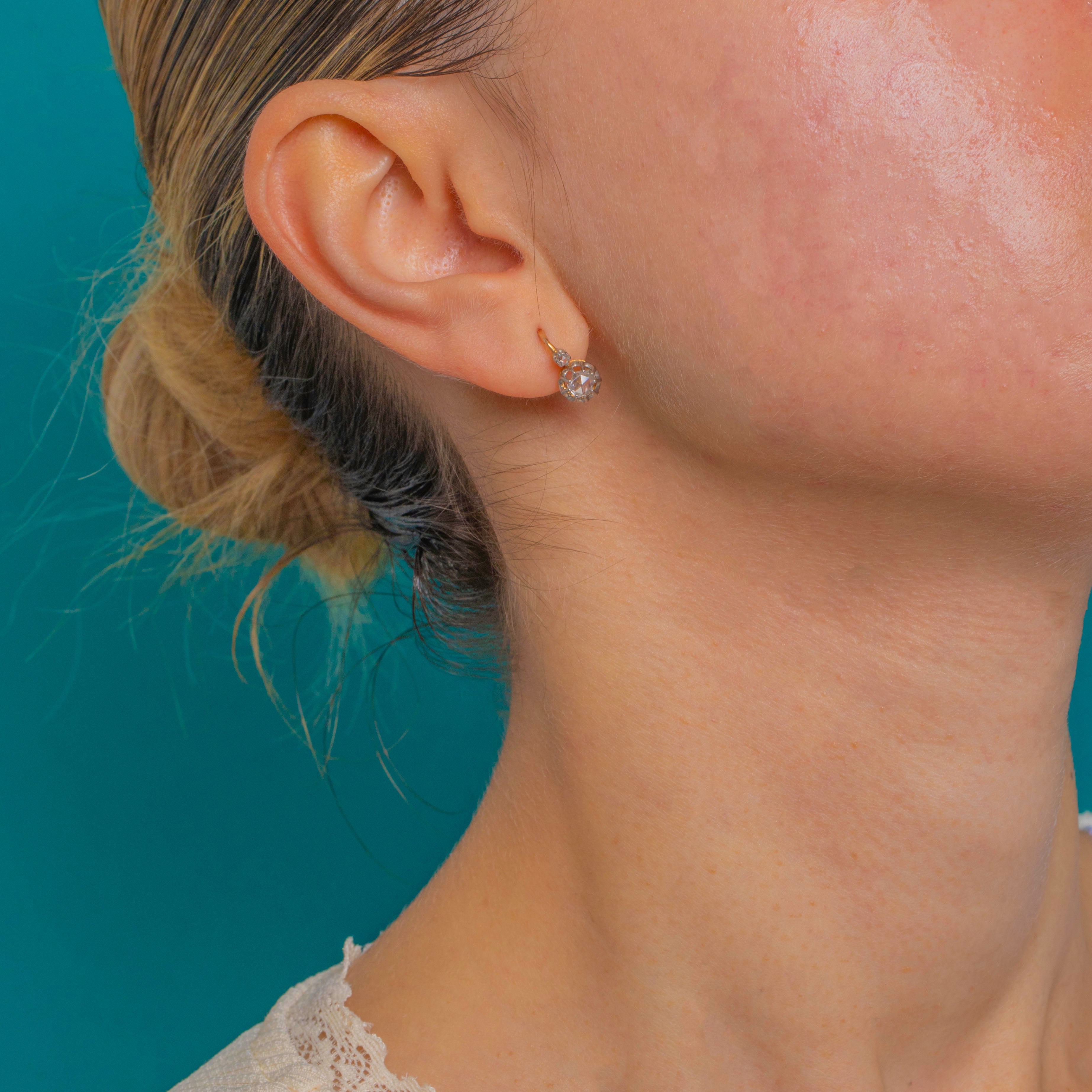 Petite and exquisitely refined, these French Belle Époque rose-cut Diamond dormeuse earrings pair 0.70cts of luminous Diamonds with pretty buttercup settings for a timeless, feminine silhouette.