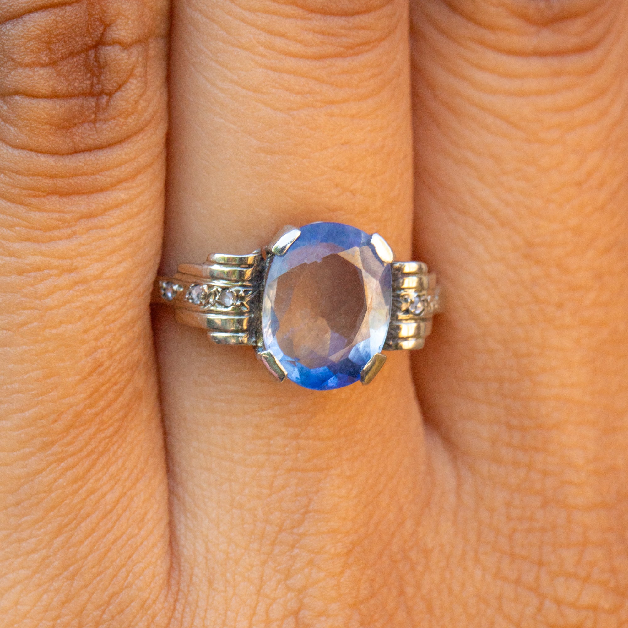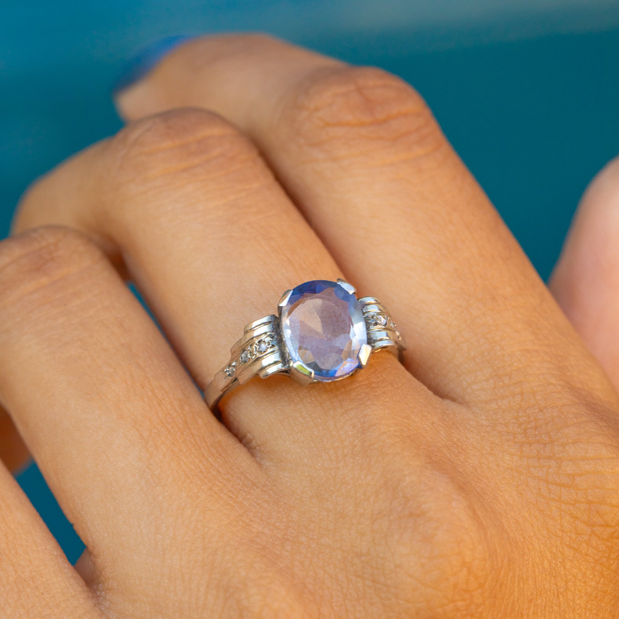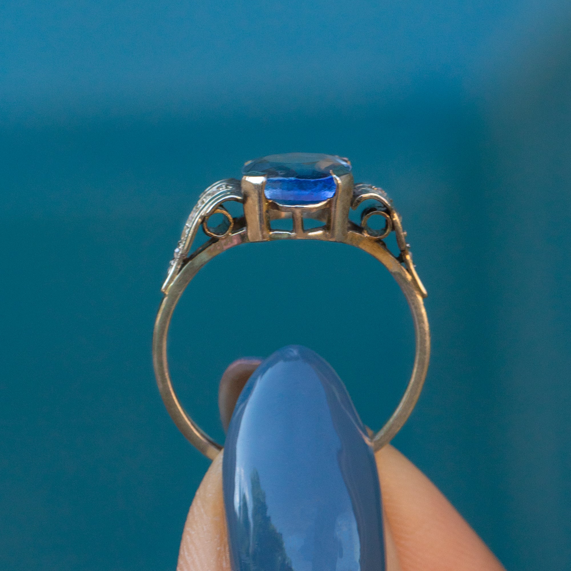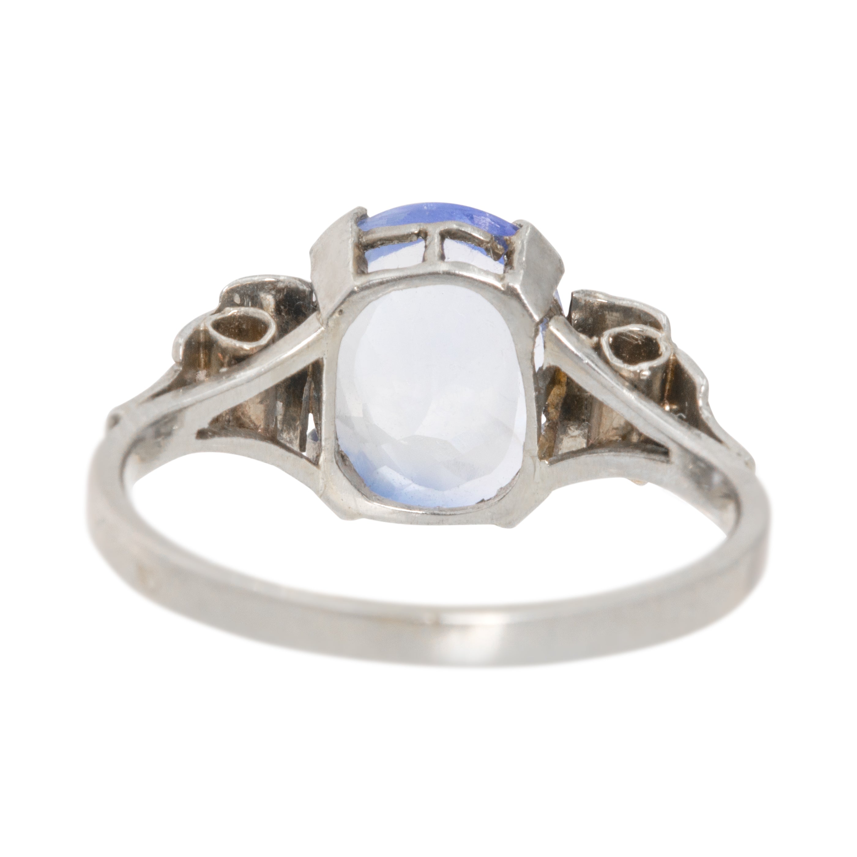 MATERIALS: Tests as 18ct White Gold, Natural Sapphire (2.40ct), Rose-cut Diamonds.