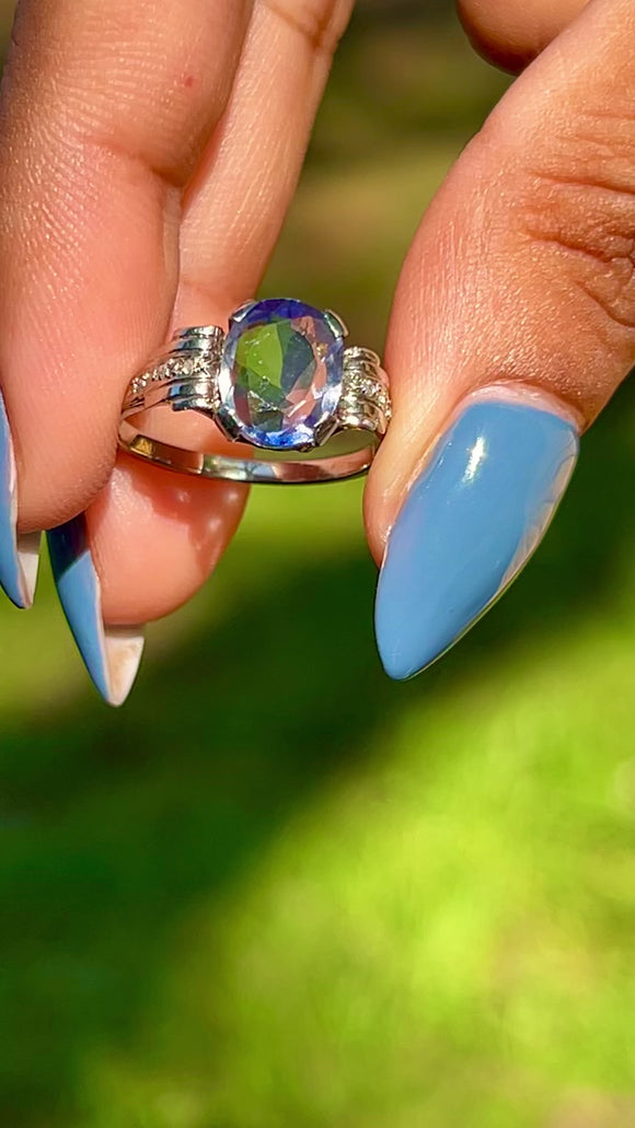 This stunning French Art Deco 18ct White Gold Sapphire Diamond ring exudes elegance! This antique ring boasts a mesmerising 2.40ct natural Sapphire in its heart and rose-cut Diamonds on the shoulders, making this ring sparkle with every movement.