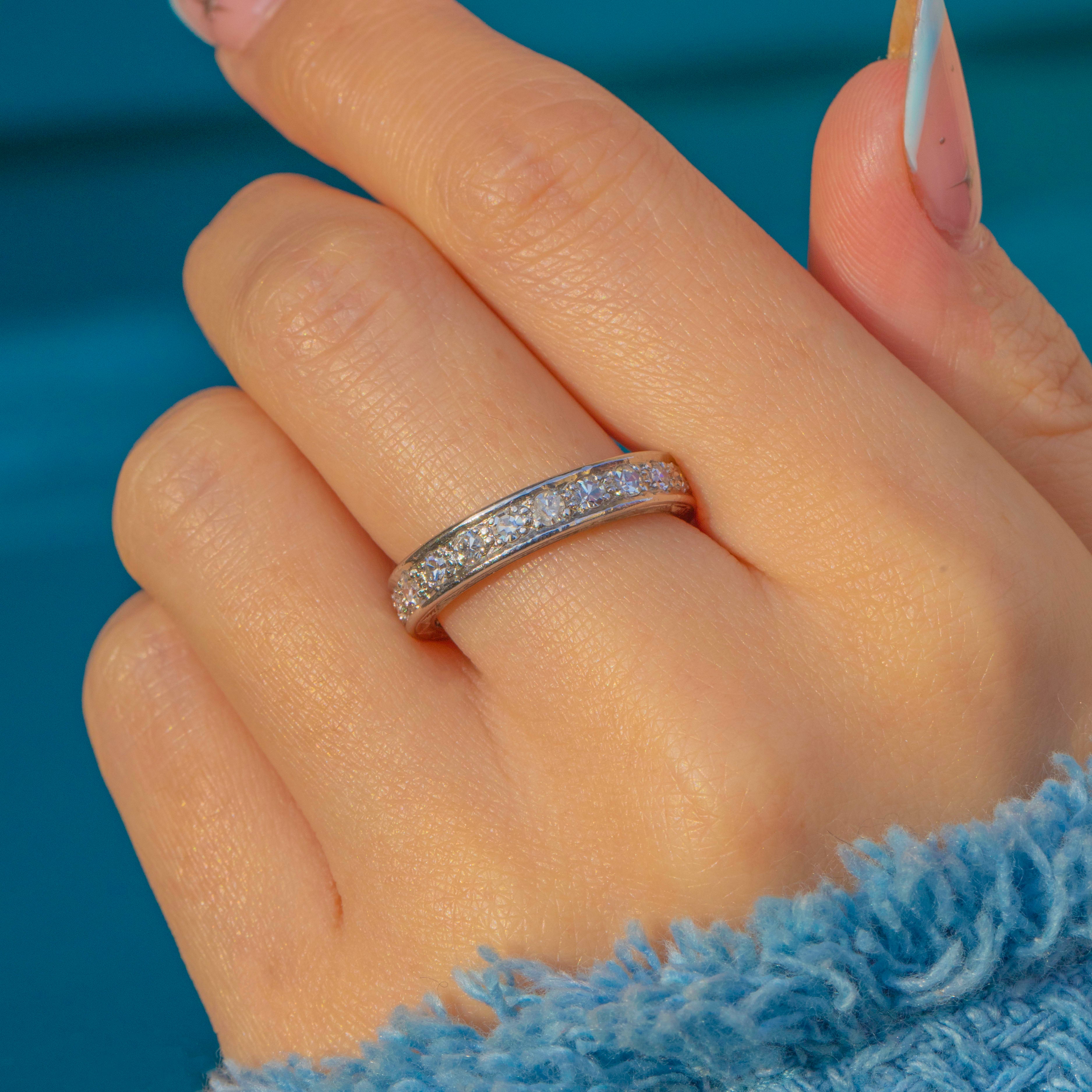 Understated and impeccably Art Deco, this French Platinum Diamond eternity ring offers a continuous line of lively round Diamonds in a sleek, low-profile silhouette. The stones sit neatly between polished rails for a refined ribbon of sparkle that’s effortlessly elegant alone and stacks beautifully with other bands.