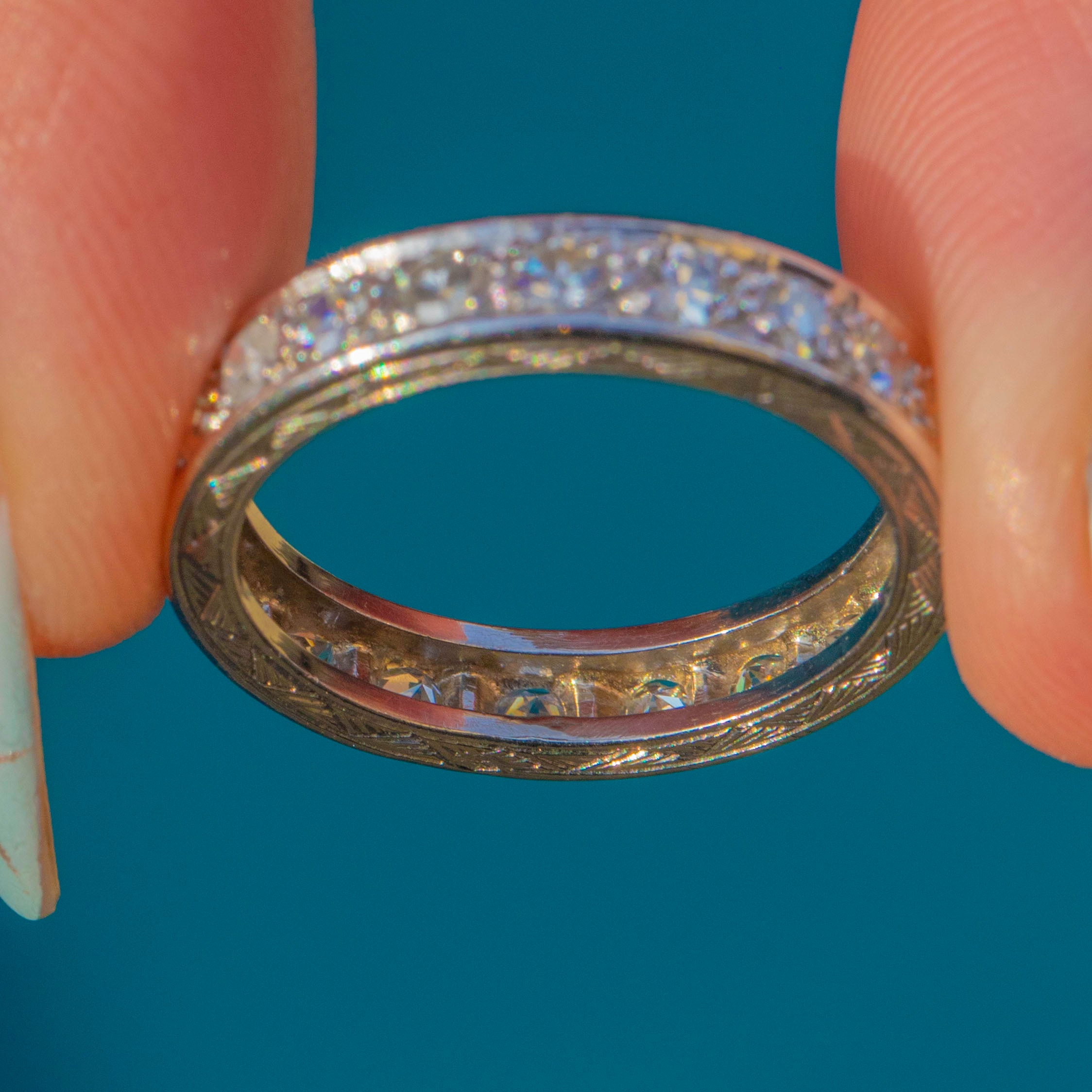 VERY GOOD: Diamonds are bright with minor age-consistent abrasions visible under magnification only. The Platinum band shows light surface wear and gentle softening to the engraved profiles from wear, with settings secure throughout. The full-hoop design remains intact and well cared for.