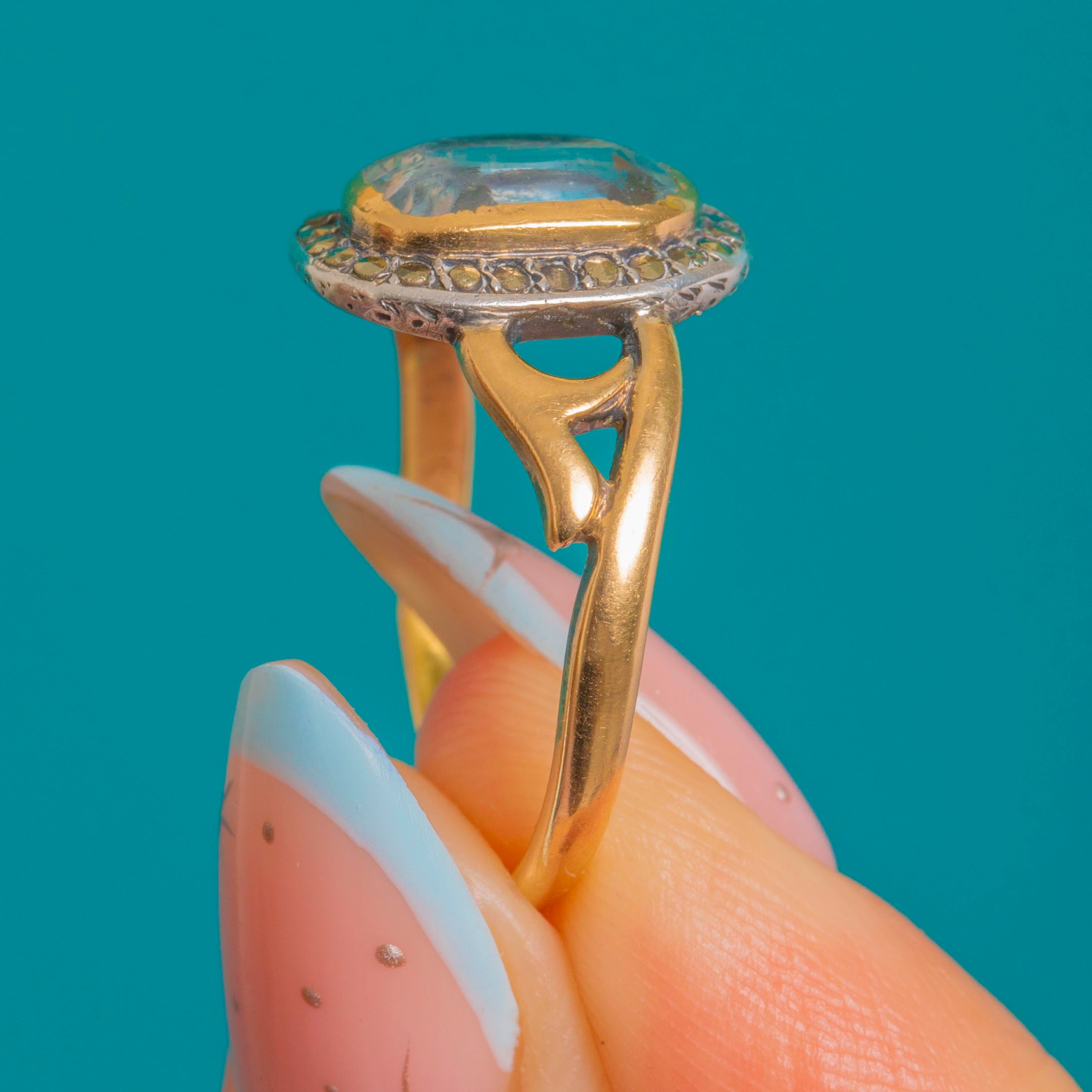 French Art Nouveau 18ct Gold Aquamarine & Marcasite Cluster Ring Item added