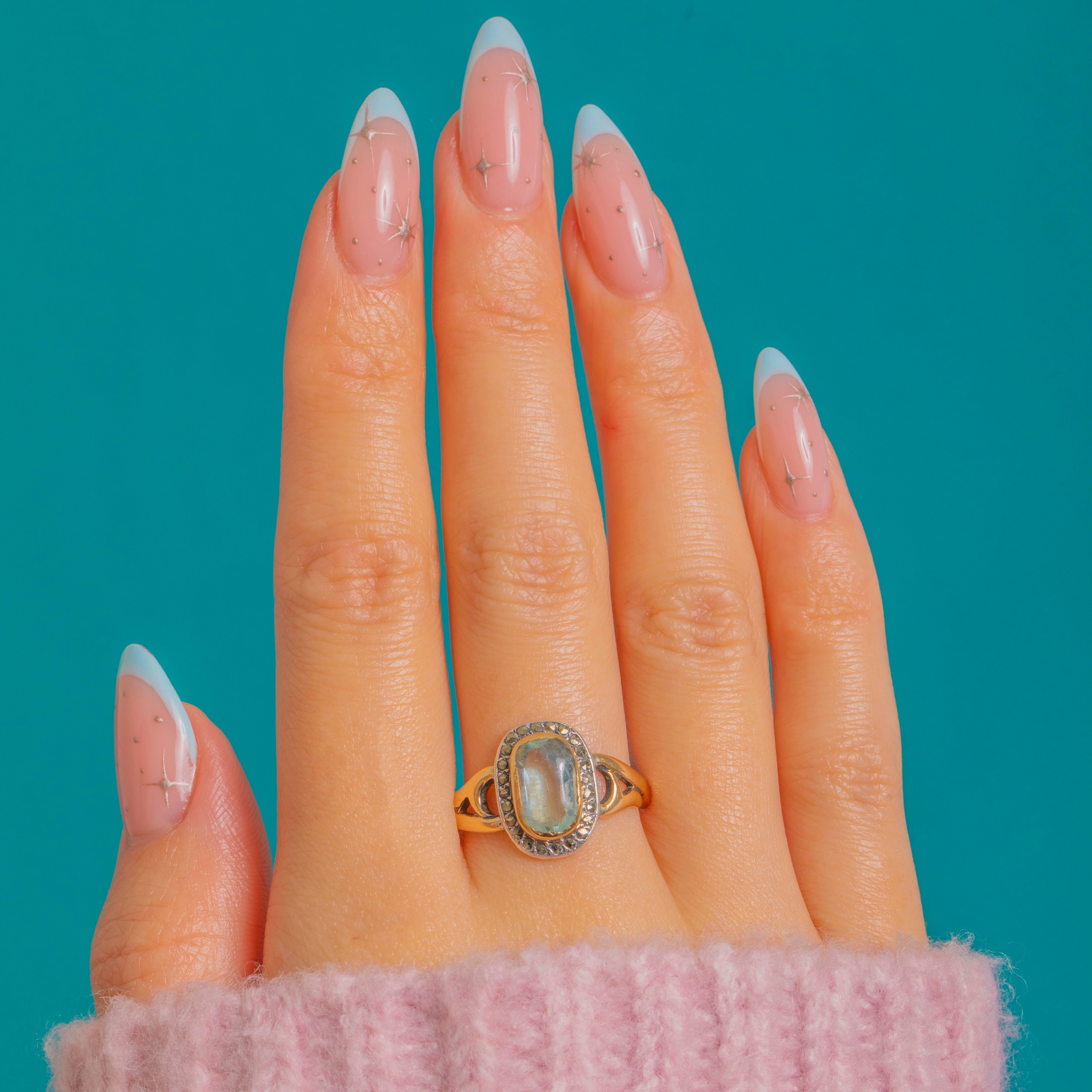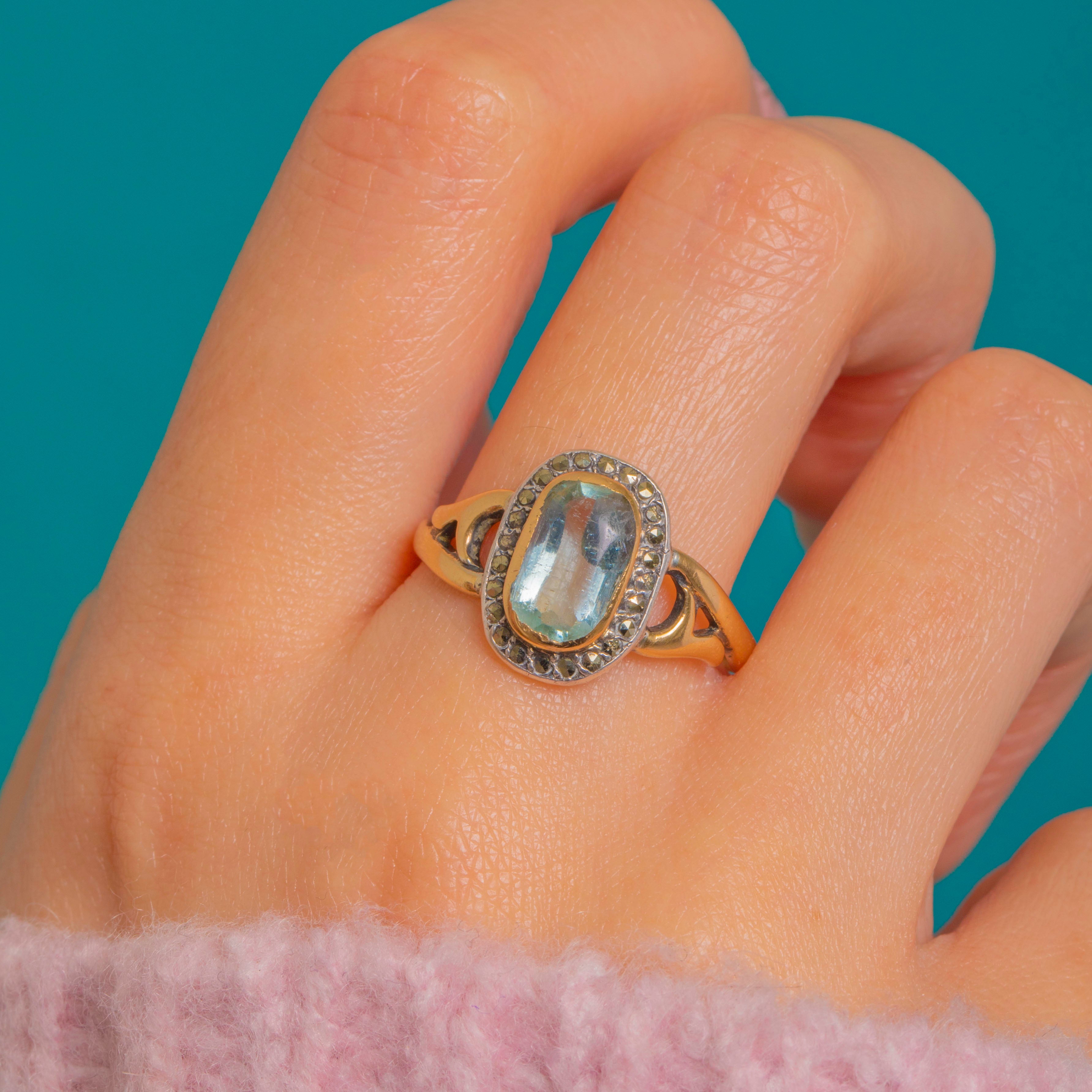A refined French Art Nouveau cluster ring in 18ct Gold, set with a luminous pale Aquamarine in a smooth rubover collet and framed by a halo of glinting Marcasites with delicate milgrain detail. The white-toned halo plays beautifully against the warm Gold, creating a crisp two-tone effect that feels both romantic and poised.