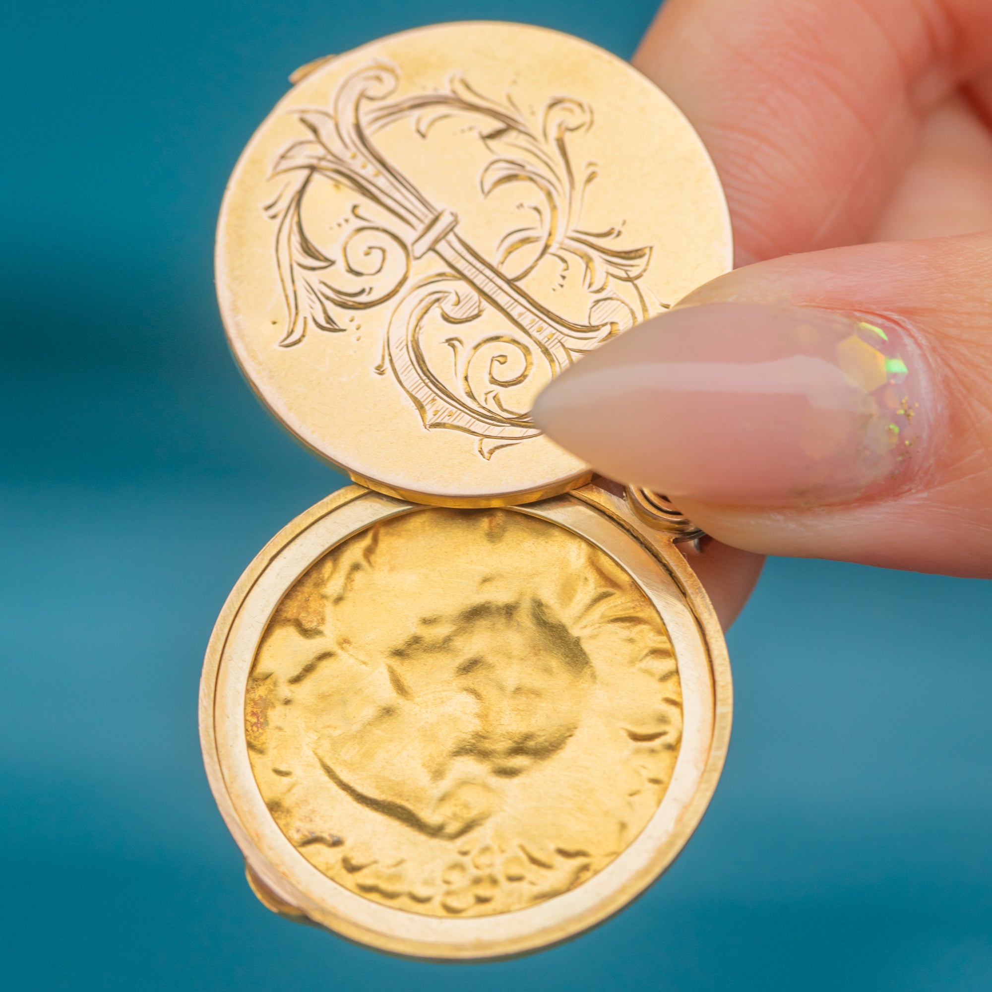 A superb French Art Nouveau locket in rich 18ct Gold depicting Bacchus, the god of wine, complete with flowing vines and classical detail. The sculpted relief has wonderful depth and presence, catching the light beautifully from every angle.