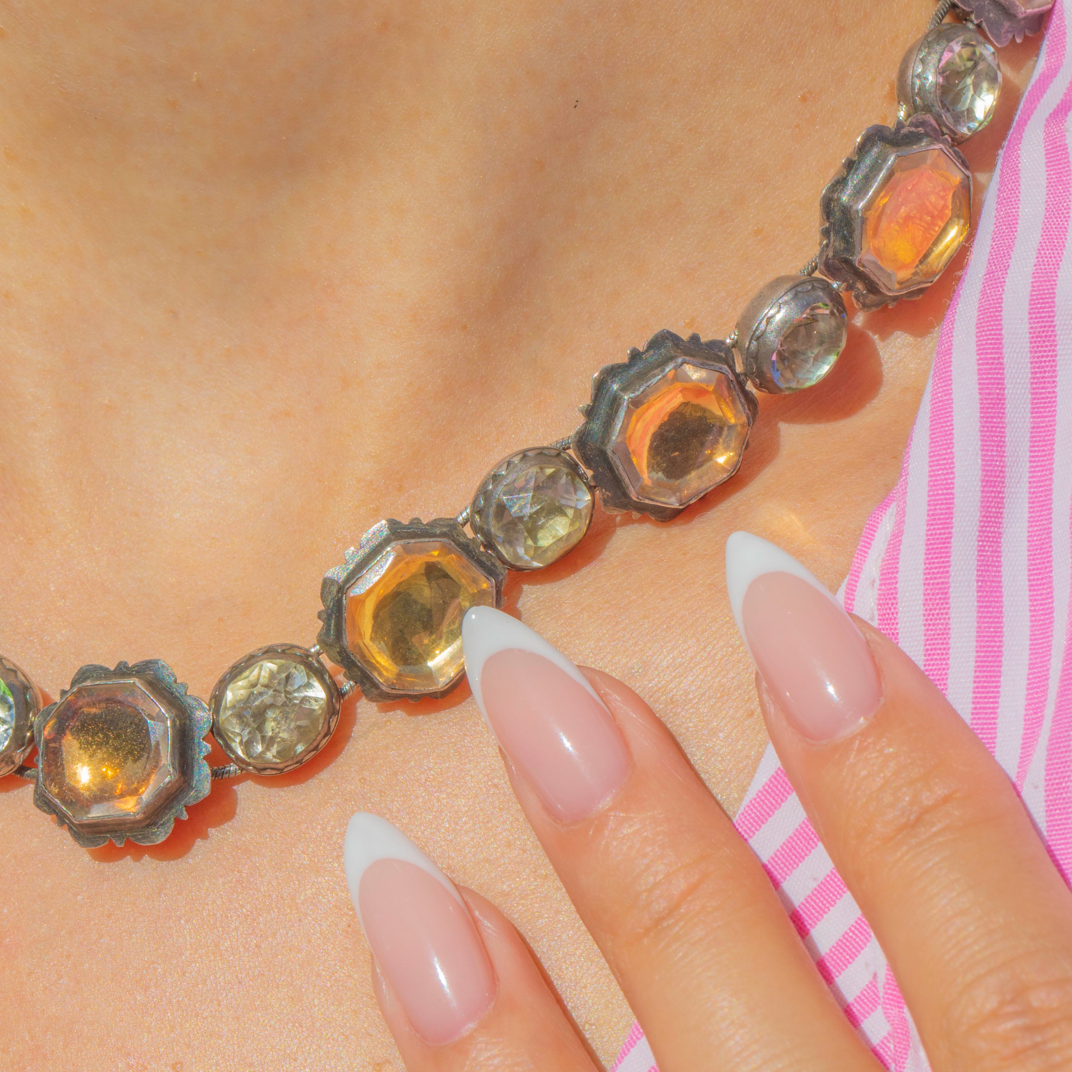 A luminous French Georgian-era Rivière necklace set with soft Peach Paste and Rock Crystal, all nestled in piecrust collets with glowing foils behind each stone. The radiant sparkle is enhanced by the classic French “ribbon loop” terminals, designed to be worn with a ribbon at the throat as a collar – an iconic detail of early 19th-century French jewellery.
