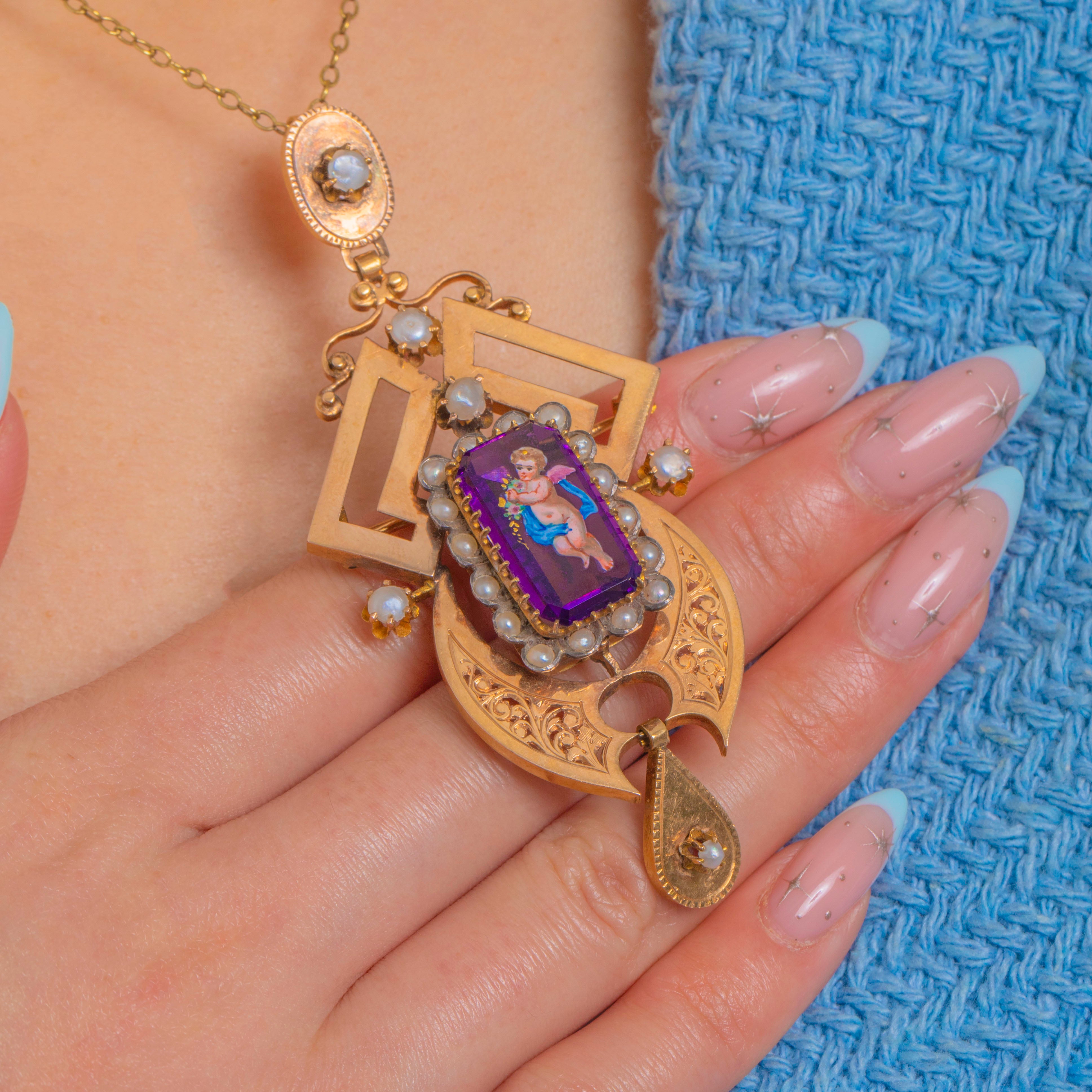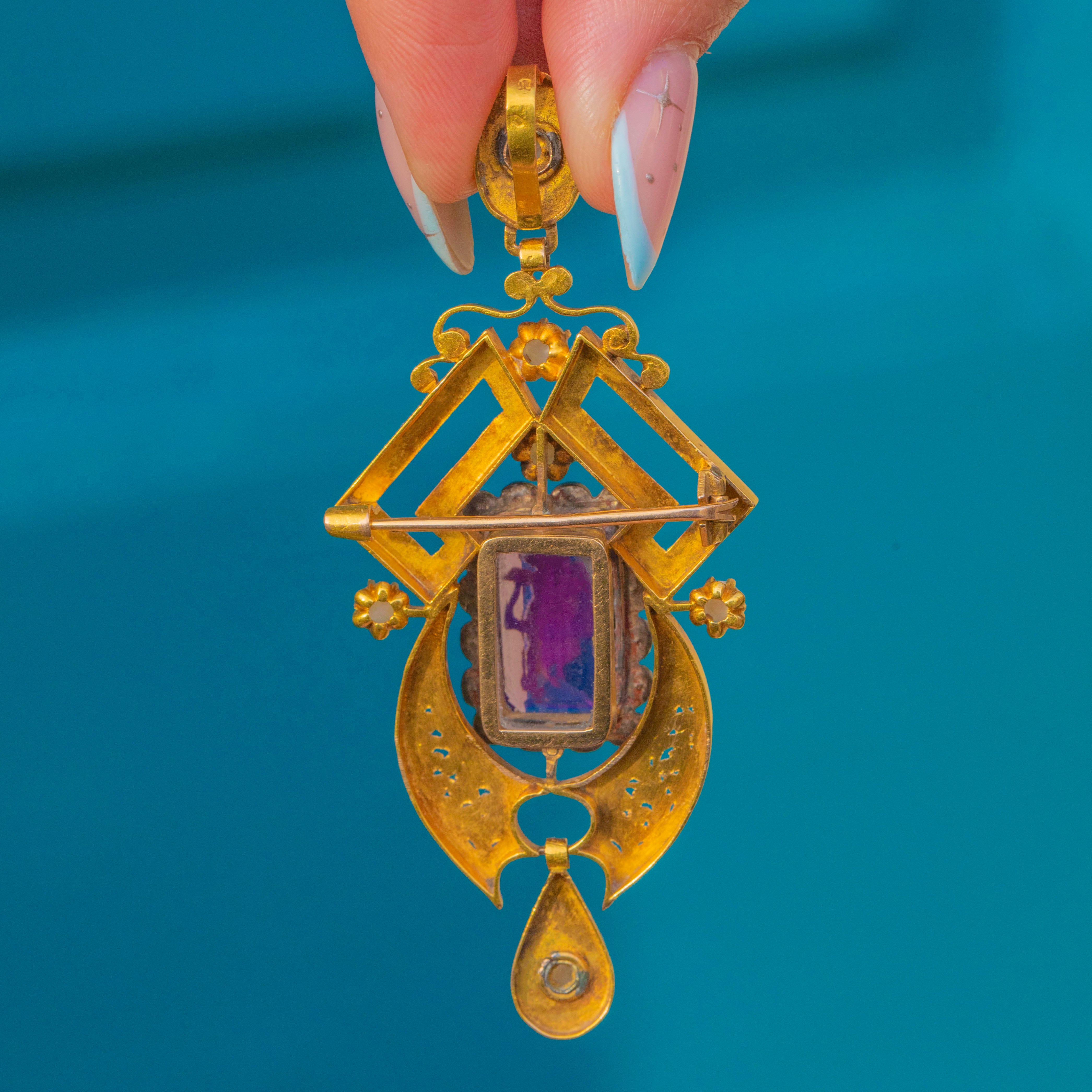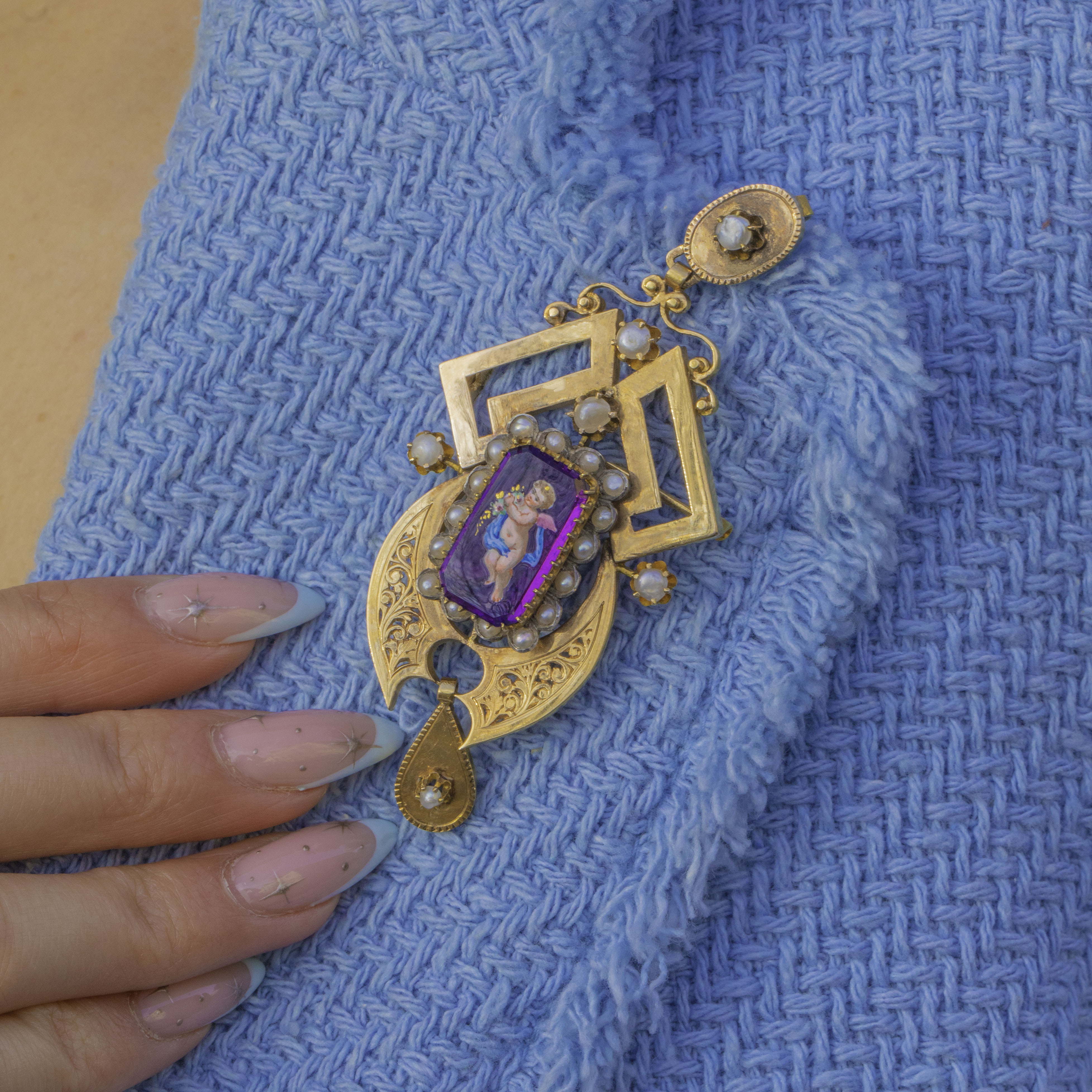 A magnificent French Victorian convertible pendant-brooch in rich 18ct Gold, exquisitely detailed in the Classical Revival style. At its heart sits a rectangular purple Paste tablet bearing a charming painted cherub, encircled by lustrous Pearls set in Silver to heighten their glow. The composition is romantic and architectural, with applied bead and rope borders for delicious texture and light play.