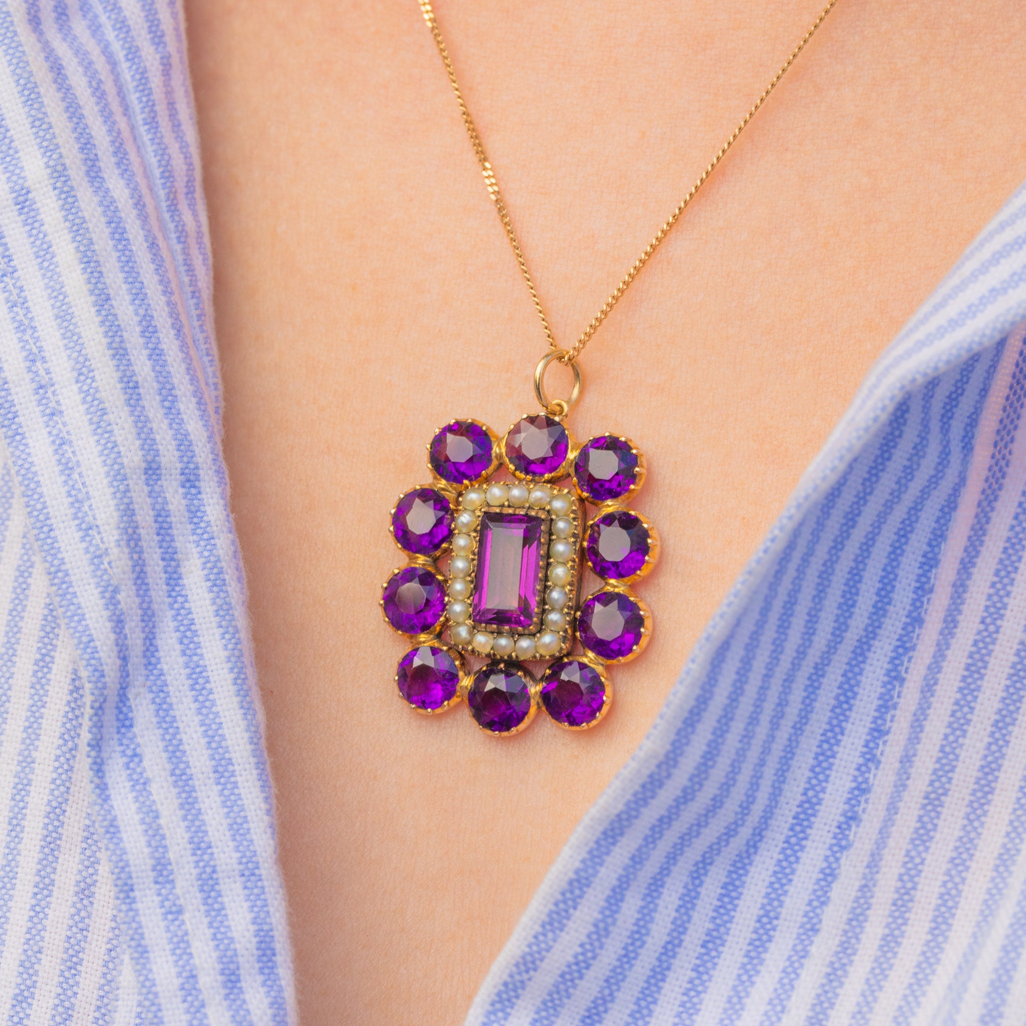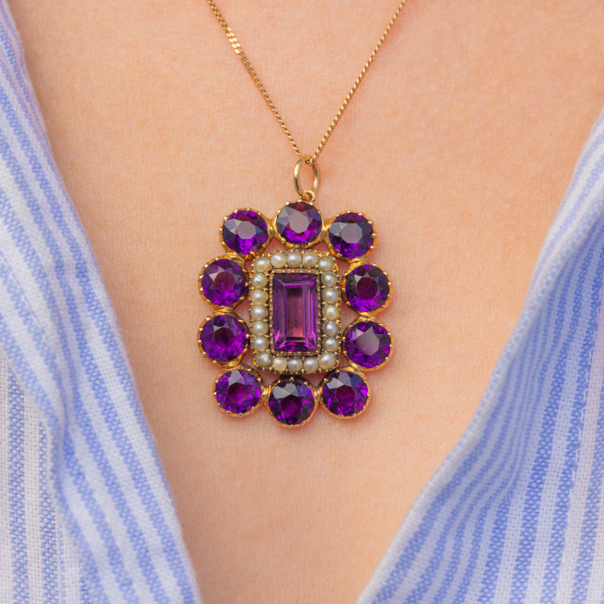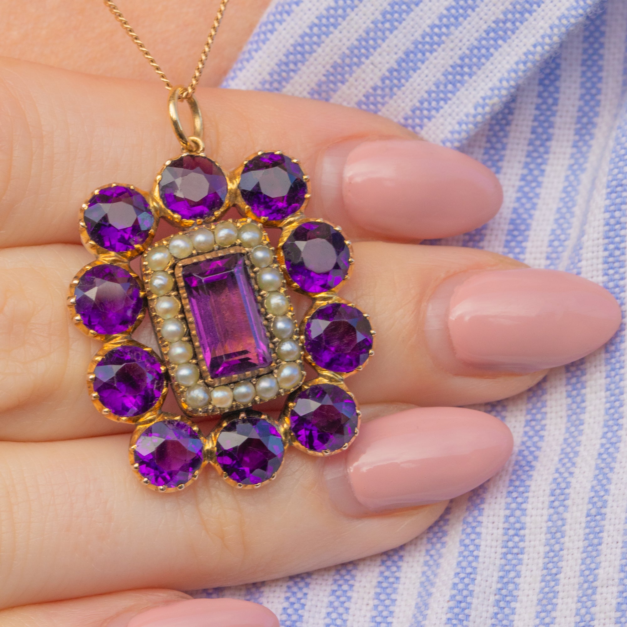 Crafted from antique 15ct Gold and featuring eleven vibrant Amethysts, this cluster pendant catches the light beautifully, radiating gorgeous rich lavender hues. The central rectangular Amethyst is accented by halo of iridescent seed Pearls, with their creamy tones marrying the rich tones of the Amethyst and Gold settings.