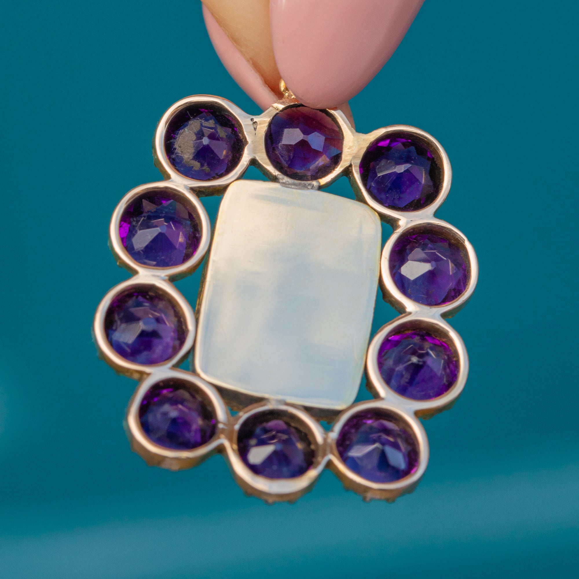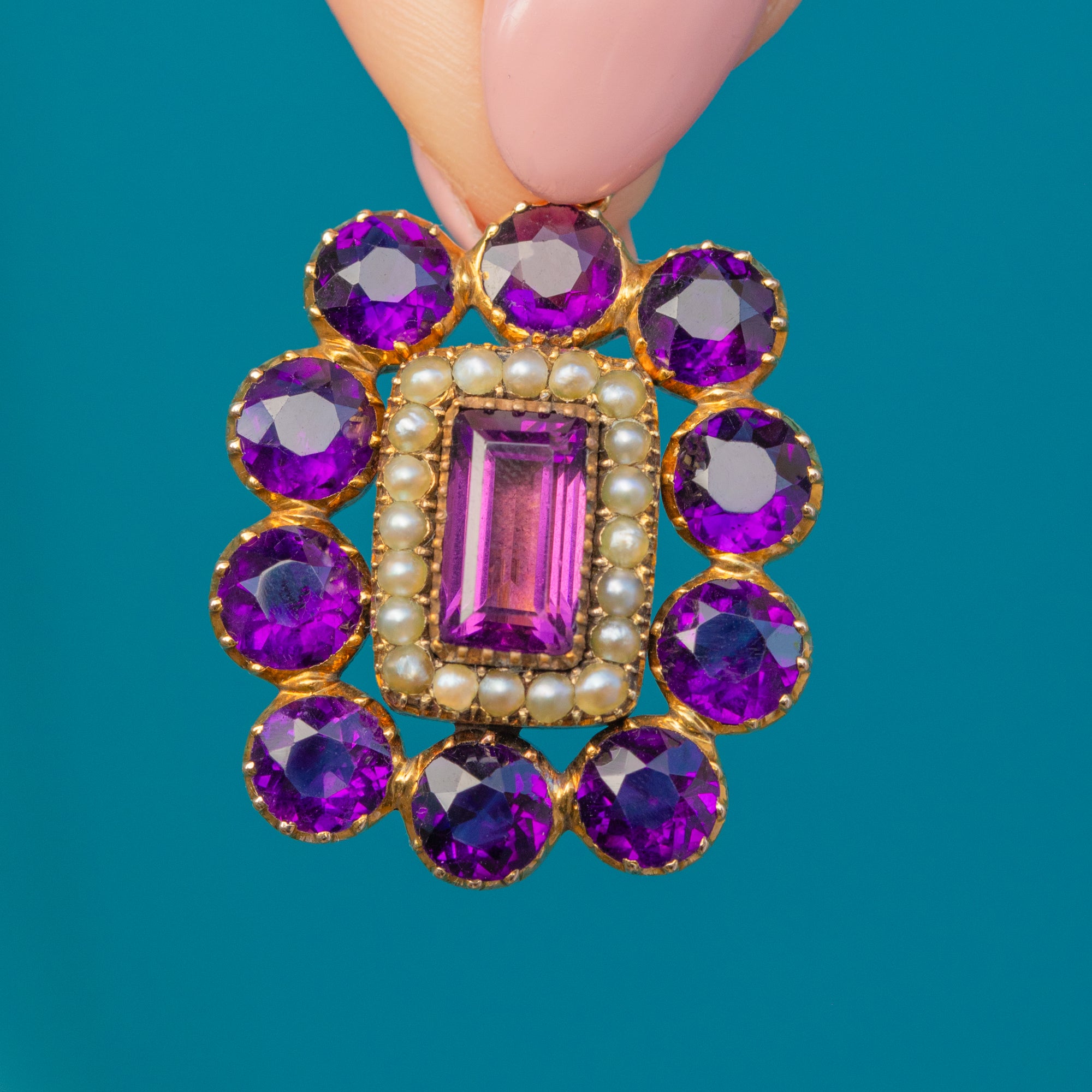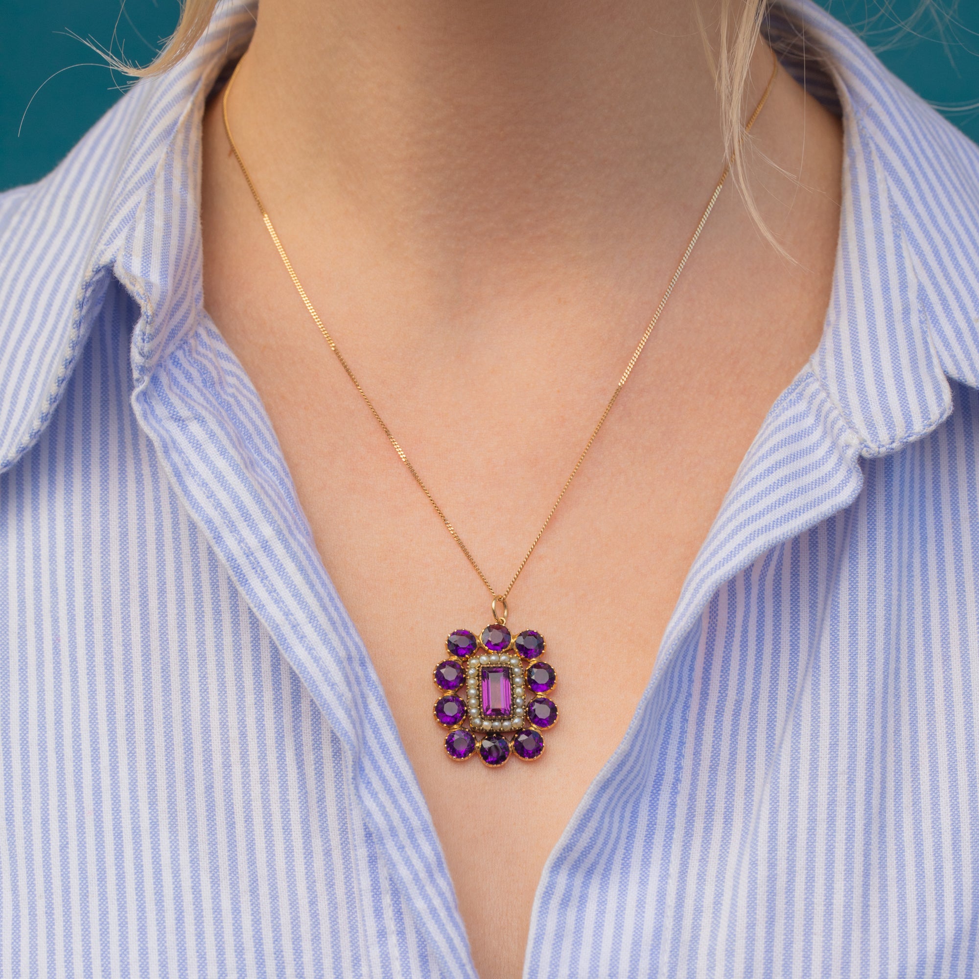 Crafted from antique 15ct Gold and featuring eleven vibrant Amethysts, this cluster pendant catches the light beautifully, radiating gorgeous rich lavender hues. The central rectangular Amethyst is accented by halo of iridescent seed Pearls, with their creamy tones marrying the rich tones of the Amethyst and Gold settings.